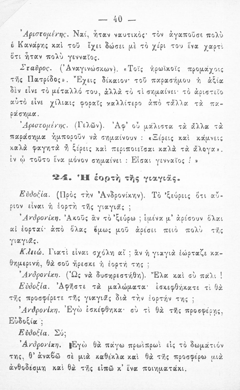 Μαθητικό βοήθημα για τους μαθητές της Α΄, Β΄, Γ΄ και Δ΄ Δημοτικού που περιλαμβάνει διαλόγους και σύντομα θεατρικά έργα ηθοποιητικού περιεχομένου που αντλούν τα θέματά τους από την σύγχρονη ελληνική ιστορία και την καθημερινή ζωή.