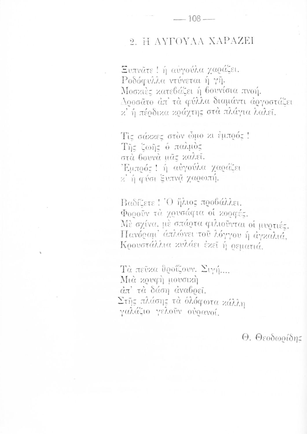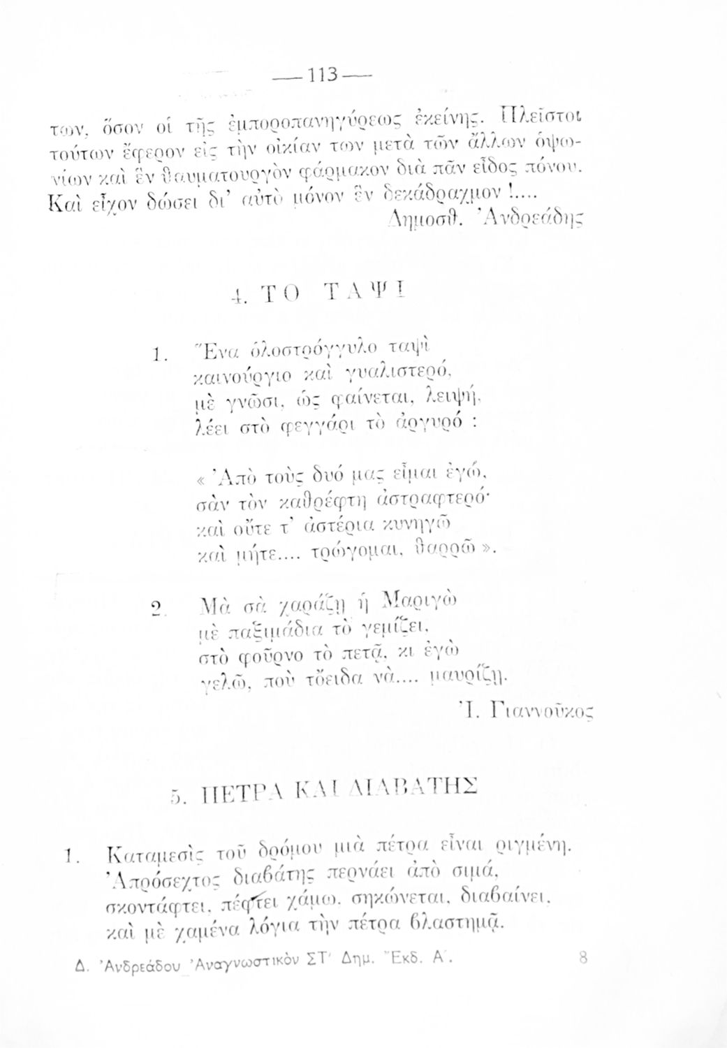 Αναγνωστικό ΣΤ΄ Δημοτικού που περιλαμβάνει πεζά και ποιήματα εμπνευσμένα από τη θρησκευτική, εθνική και κοινωνική ζωή καθώς και από τις ασχολίες των Ελλήνων.