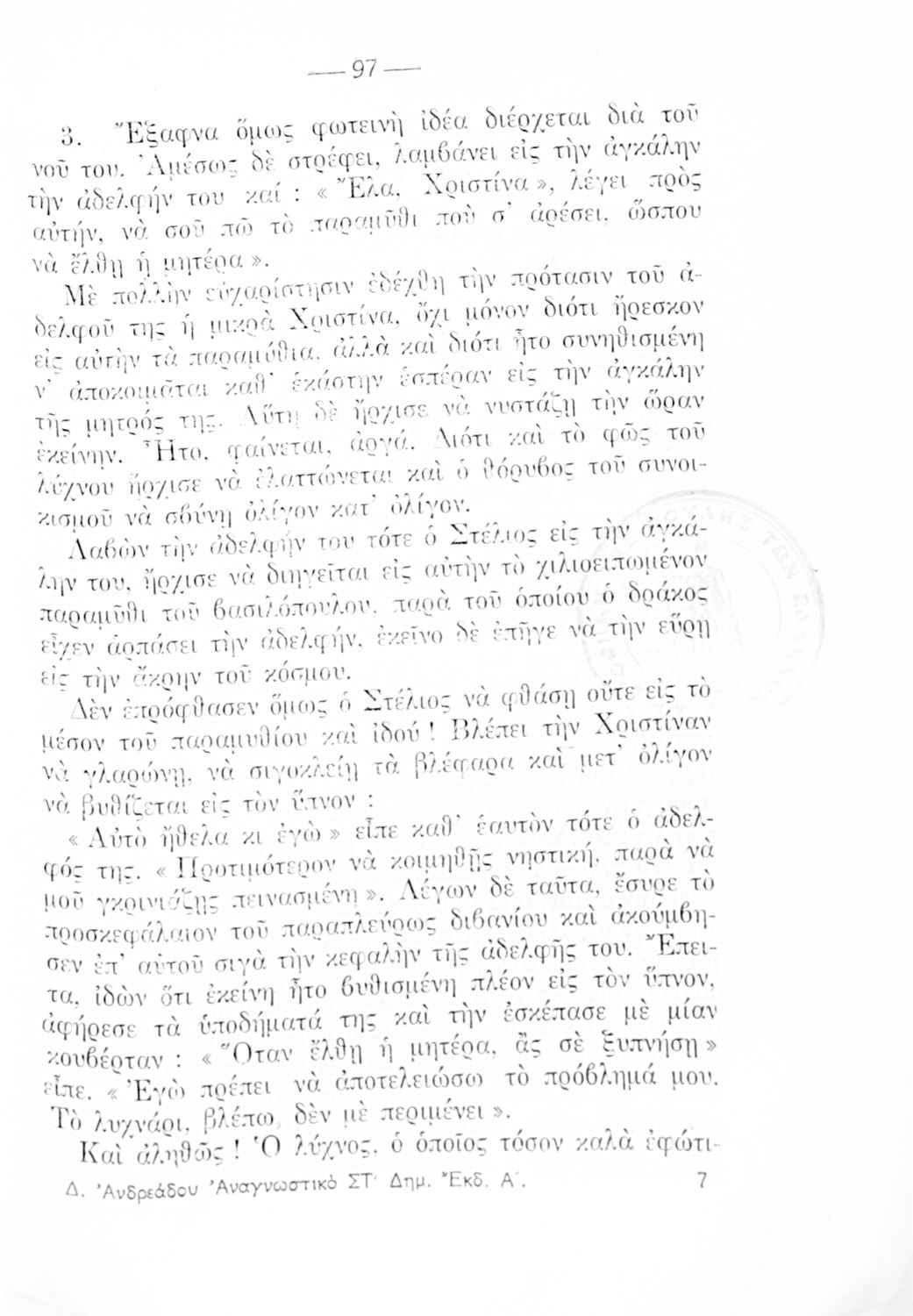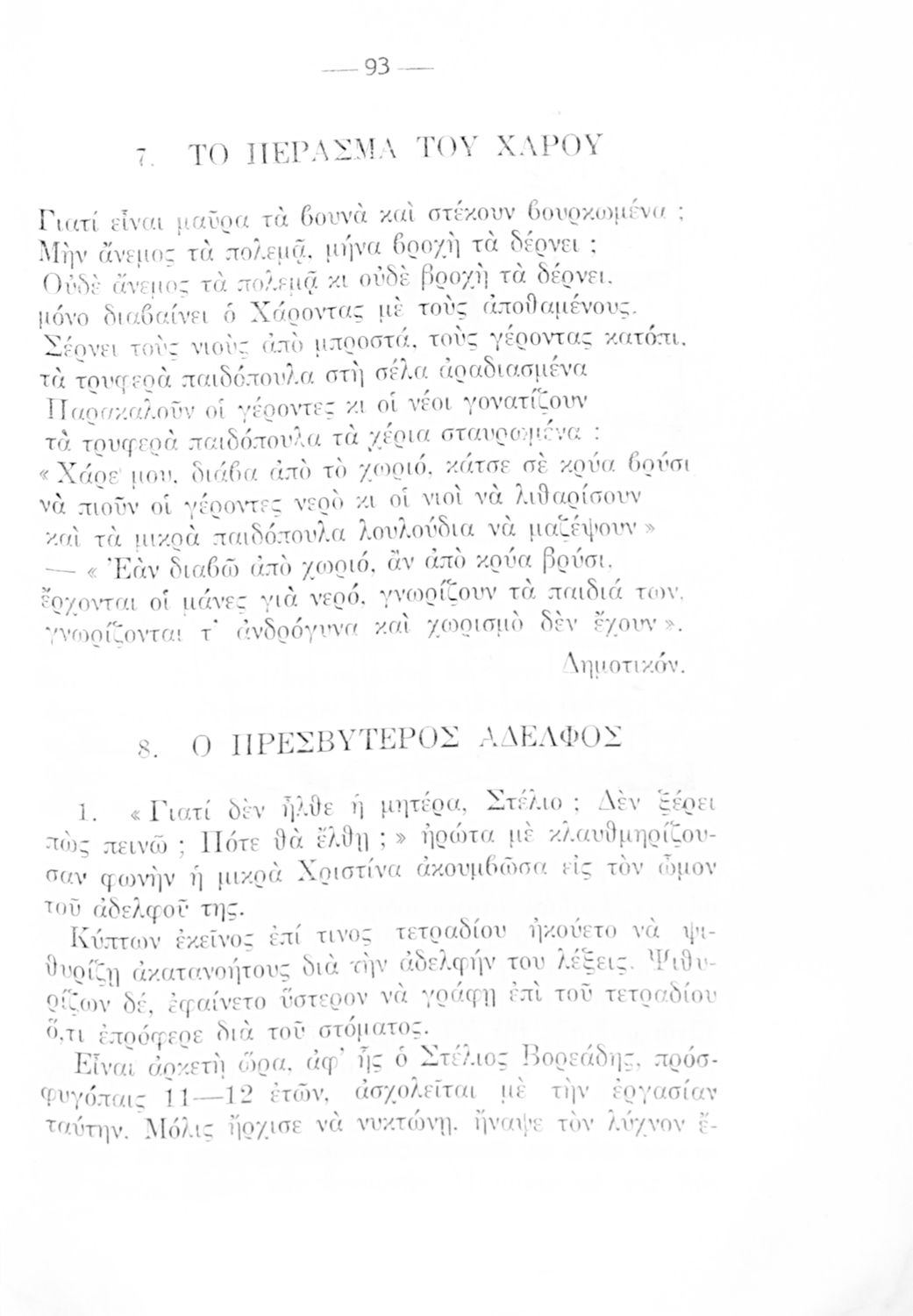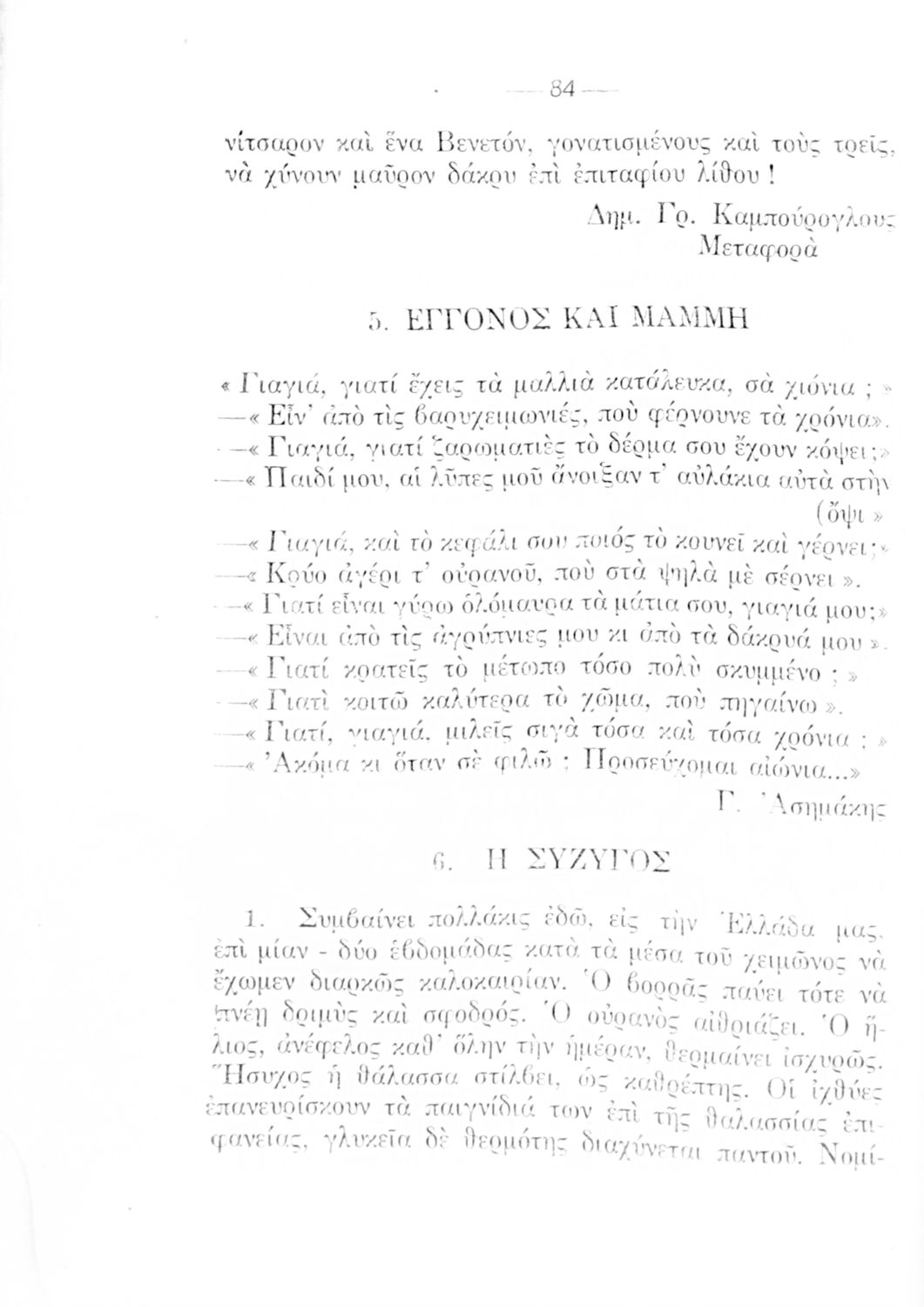 Αναγνωστικό ΣΤ΄ Δημοτικού που περιλαμβάνει πεζά και ποιήματα εμπνευσμένα από τη θρησκευτική, εθνική και κοινωνική ζωή καθώς και από τις ασχολίες των Ελλήνων.