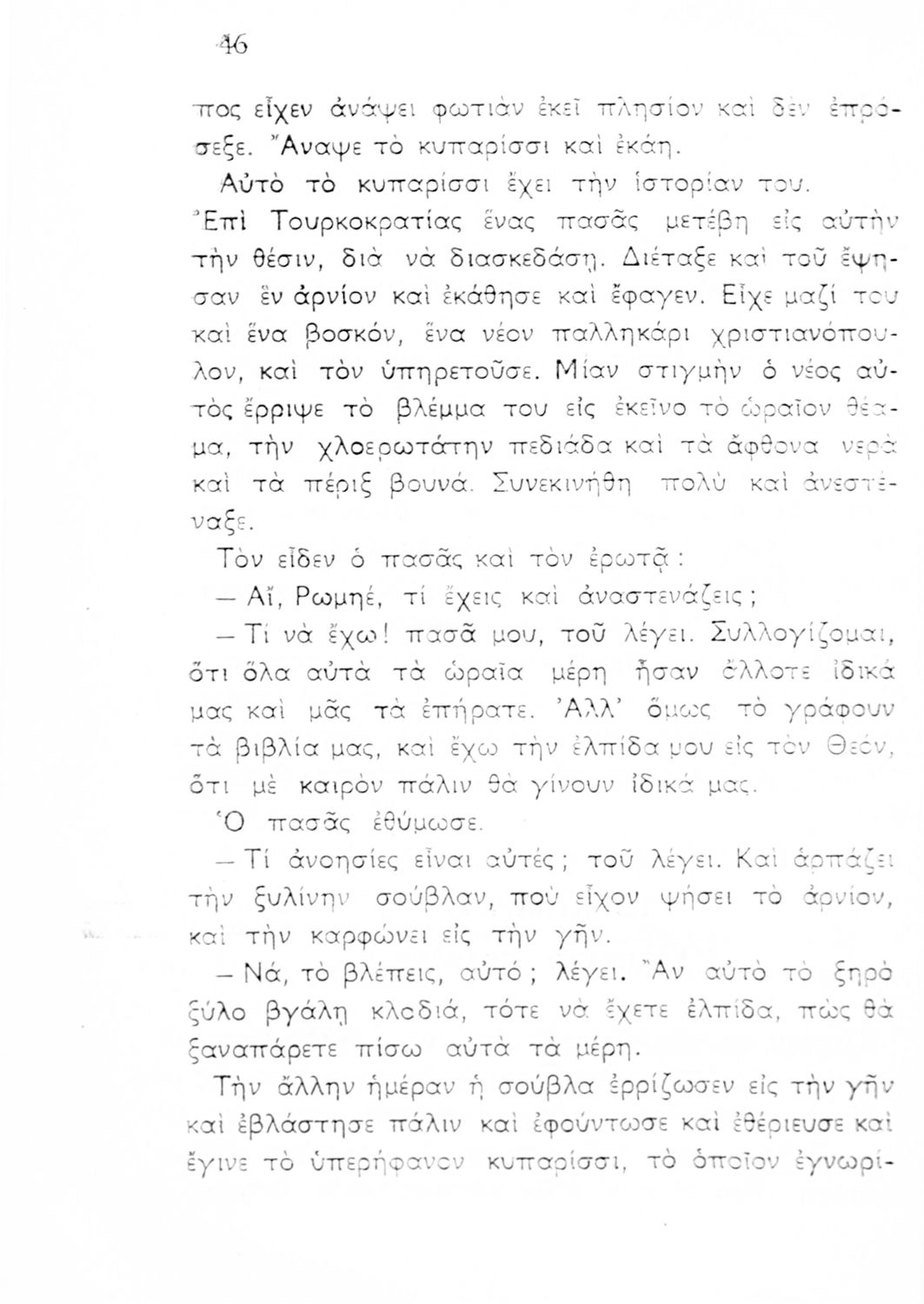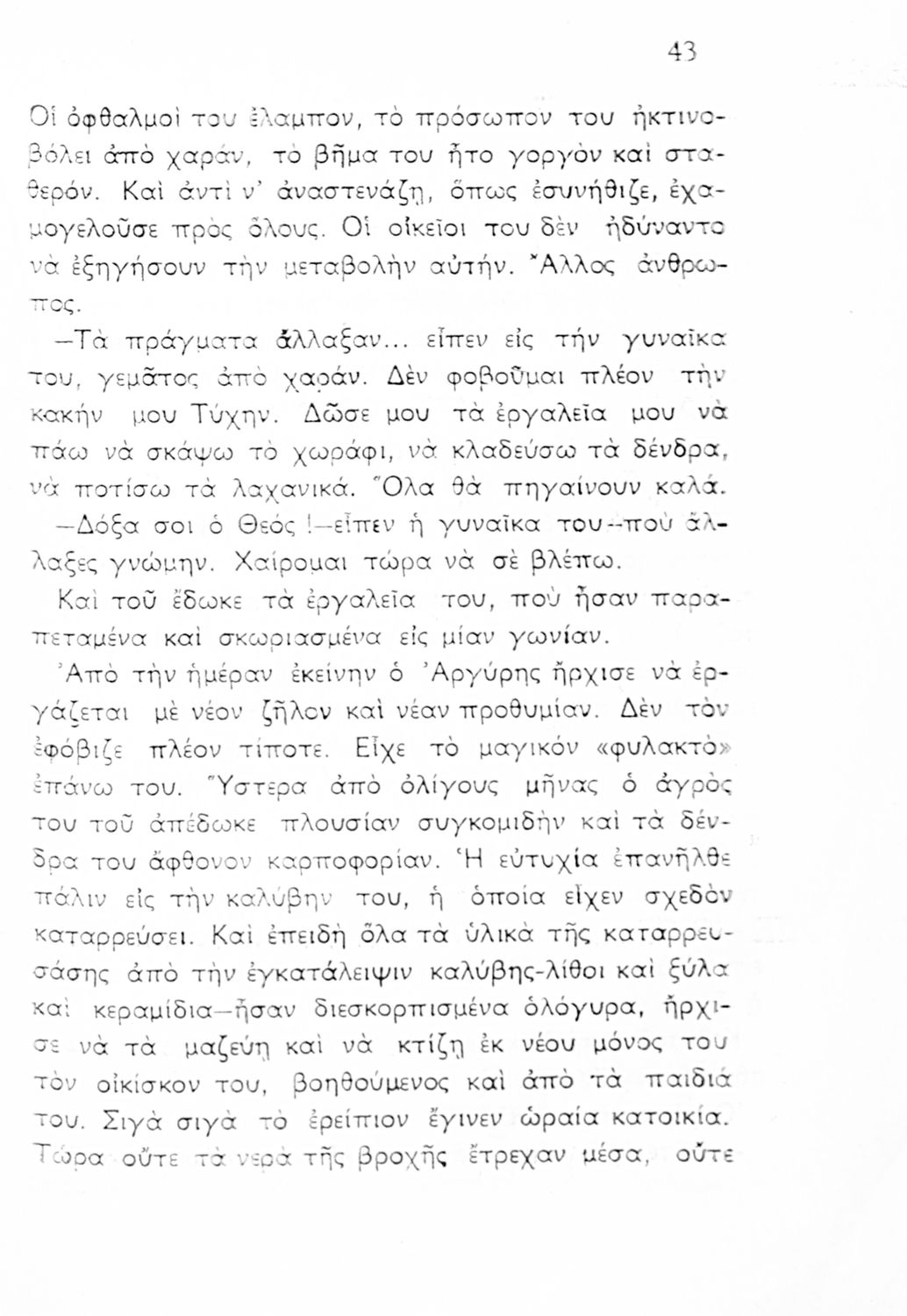 Αναγνωστικό Ε΄ Δημοτικού που περιλαμβάνει πεζογραφήματα εμπνευσμένα από την ελληνική φύση, την αγροτική ζωή και από το τρίπτυχο "Πατρίς- θρησκεία- οικογένεια".
