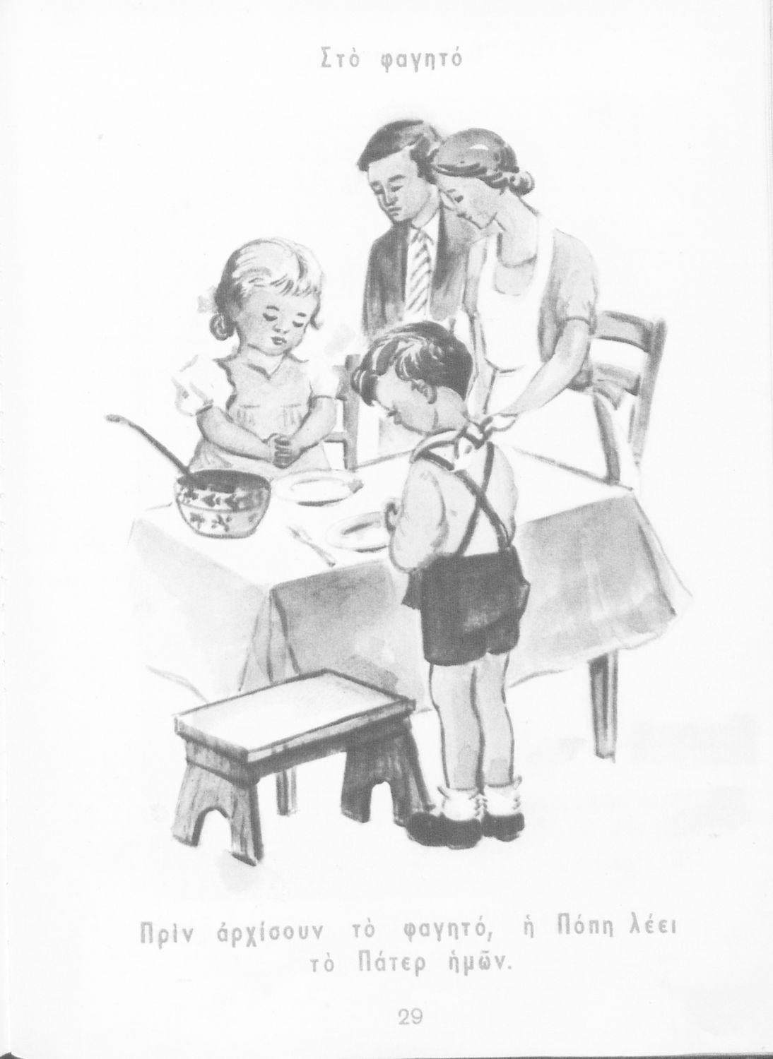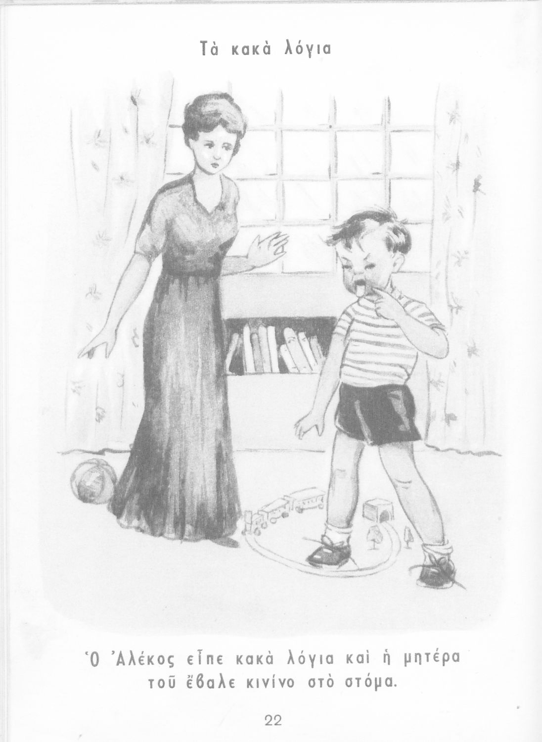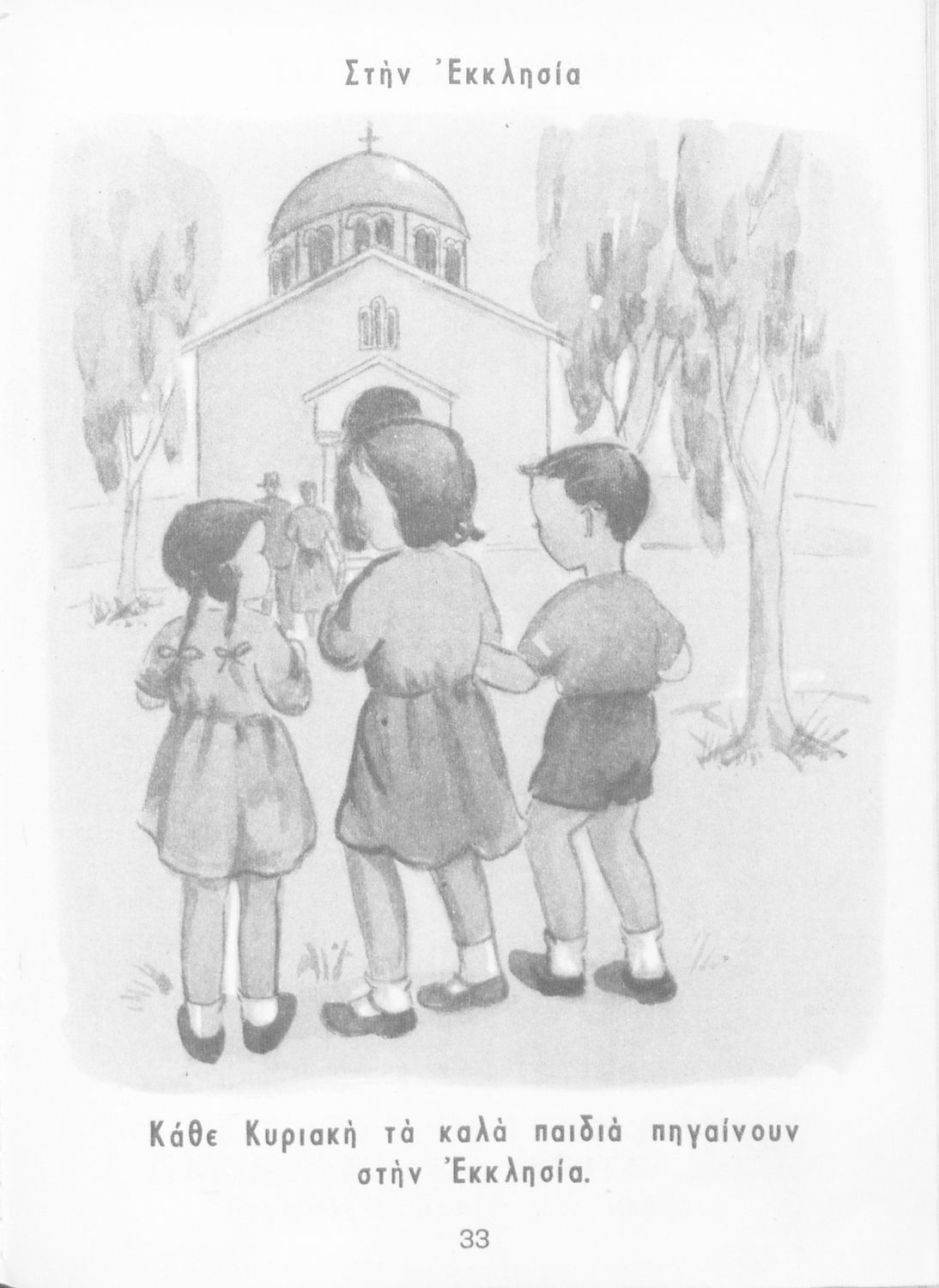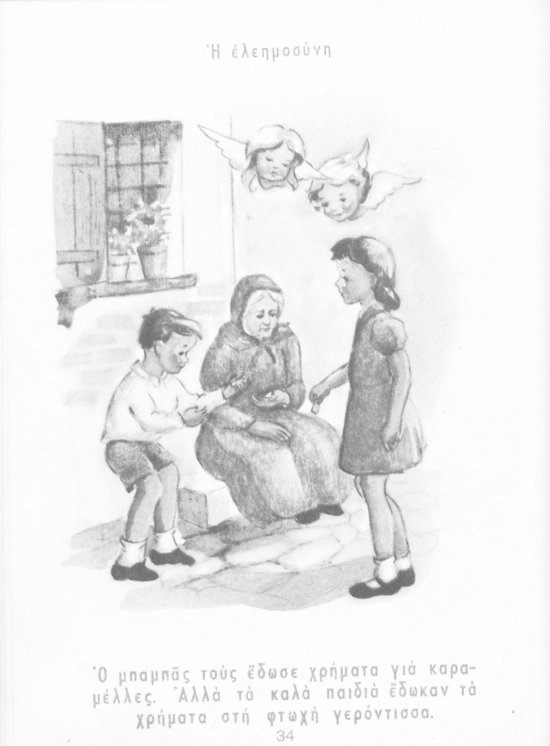 Μαθητικό βοήθημα Γλώσσας Α΄ Δημοτικού που περιλαμβάνει εικόνες με λεζάντες με ηθικό και θρησκευτικό περιεχόμενο.