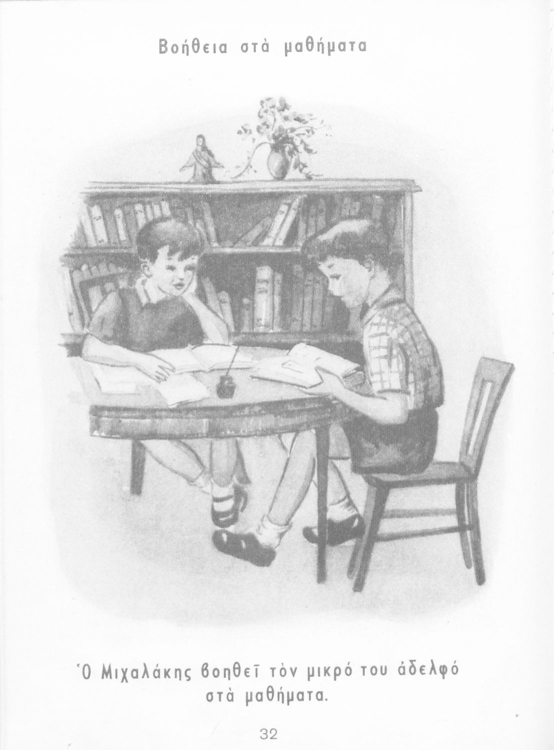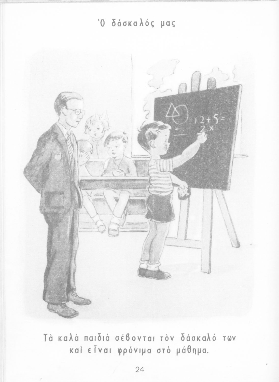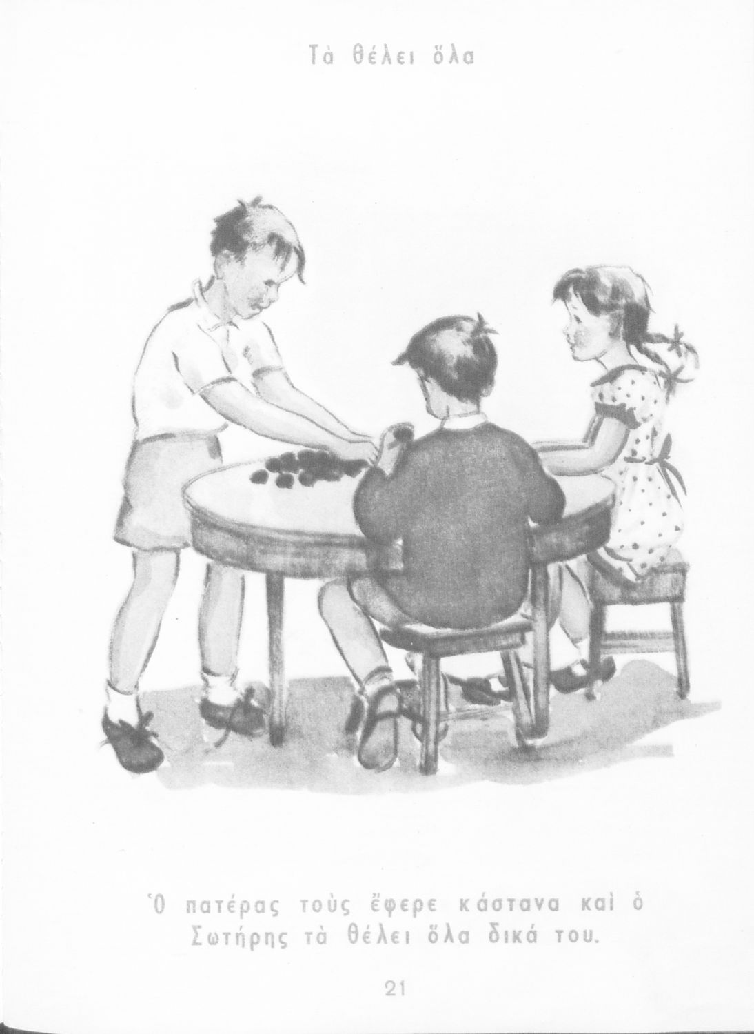 Μαθητικό βοήθημα Γλώσσας Α΄ Δημοτικού που περιλαμβάνει εικόνες με λεζάντες με ηθικό και θρησκευτικό περιεχόμενο.