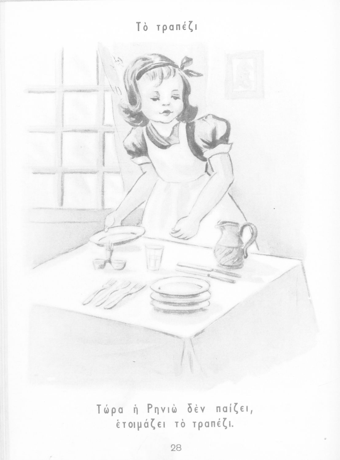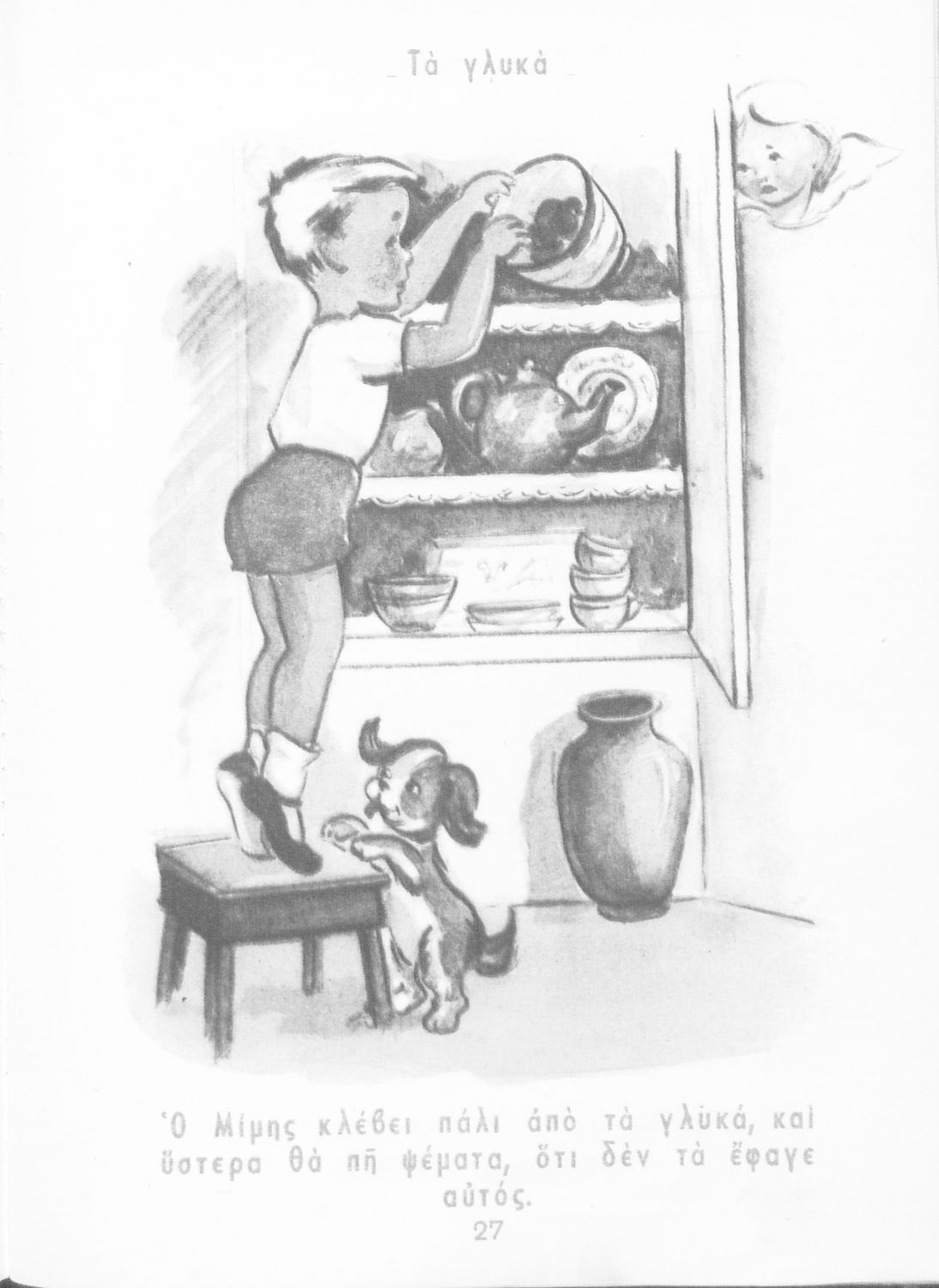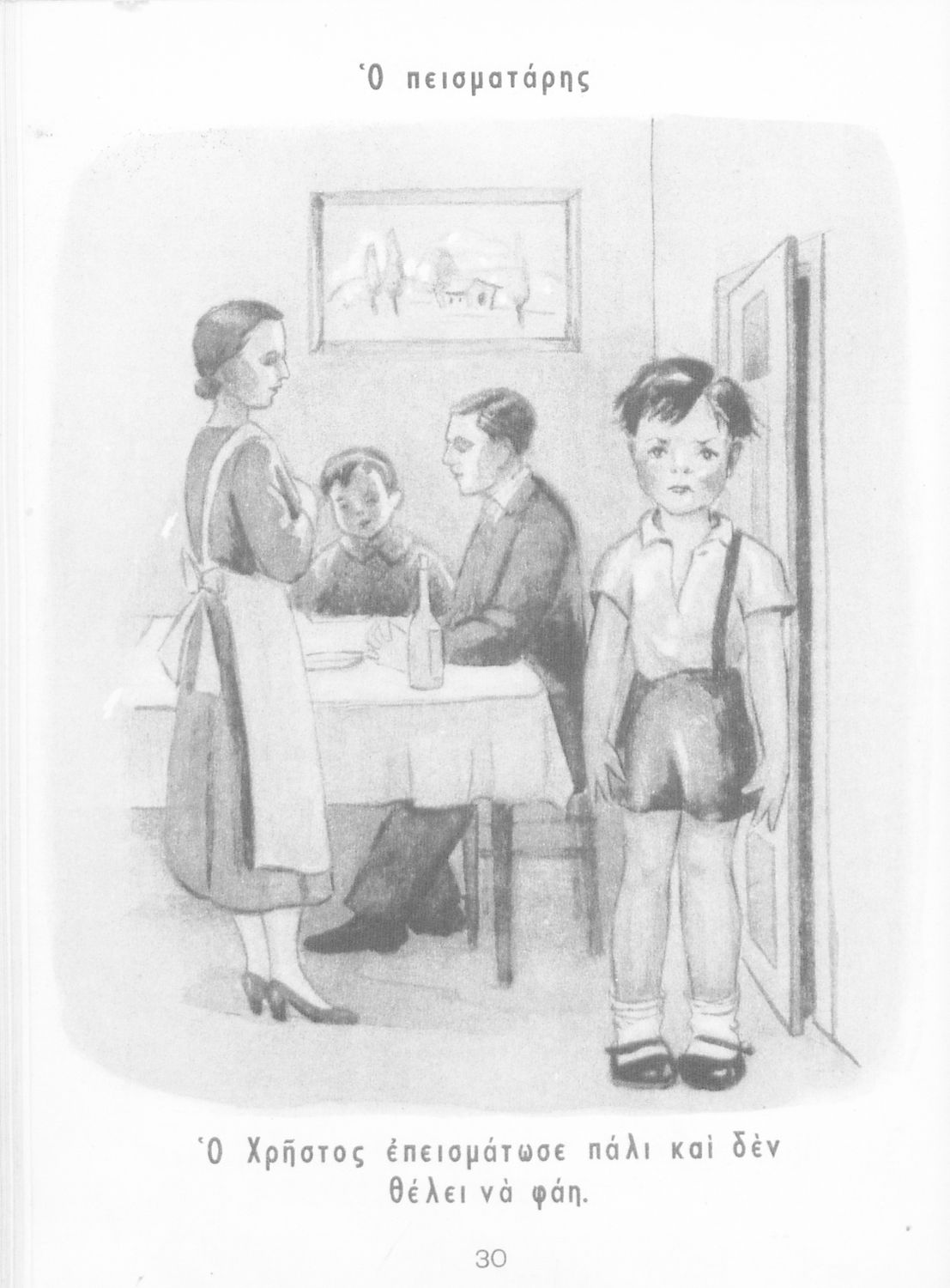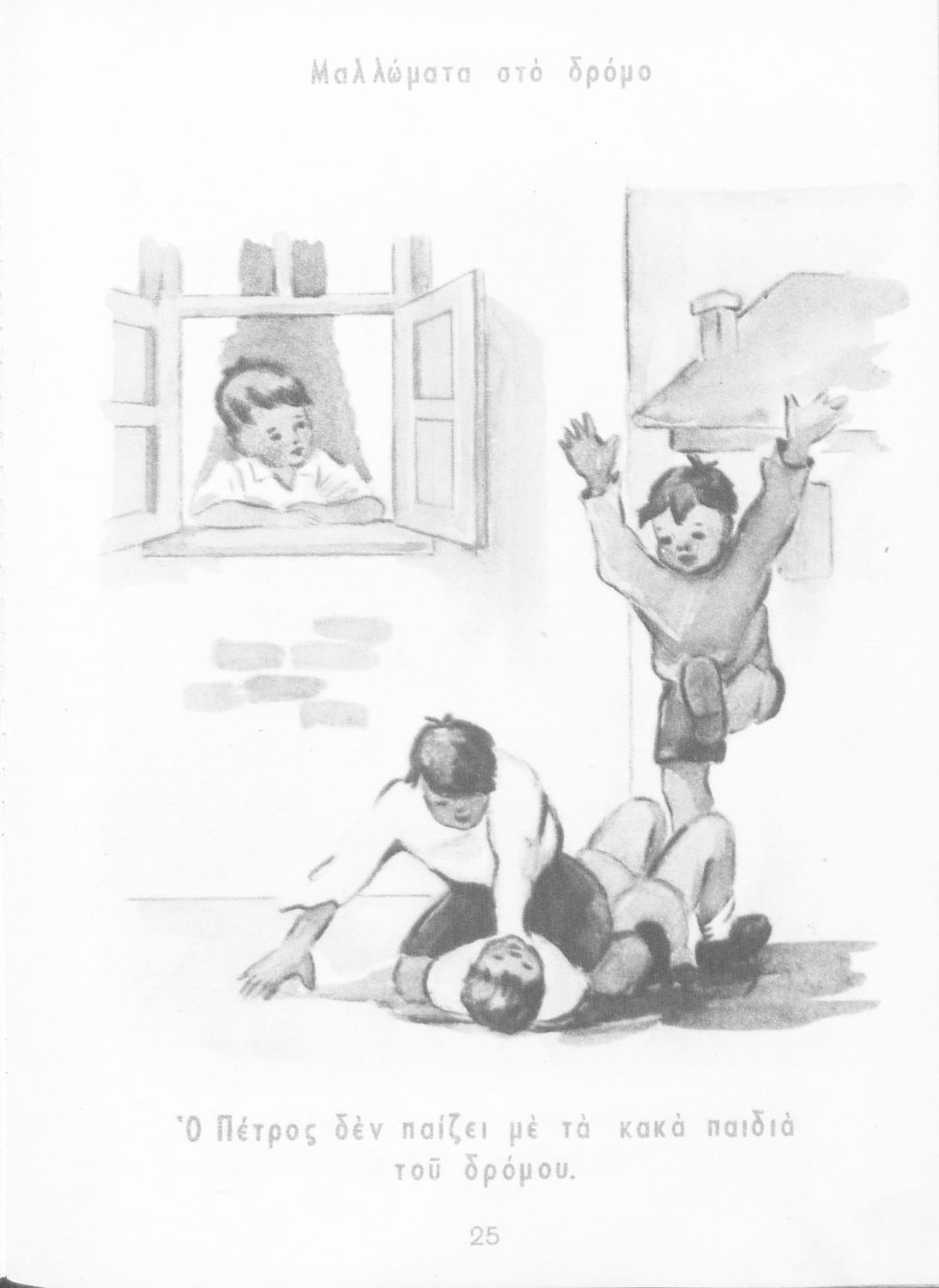 Μαθητικό βοήθημα Γλώσσας Α΄ Δημοτικού που περιλαμβάνει εικόνες με λεζάντες με ηθικό και θρησκευτικό περιεχόμενο.