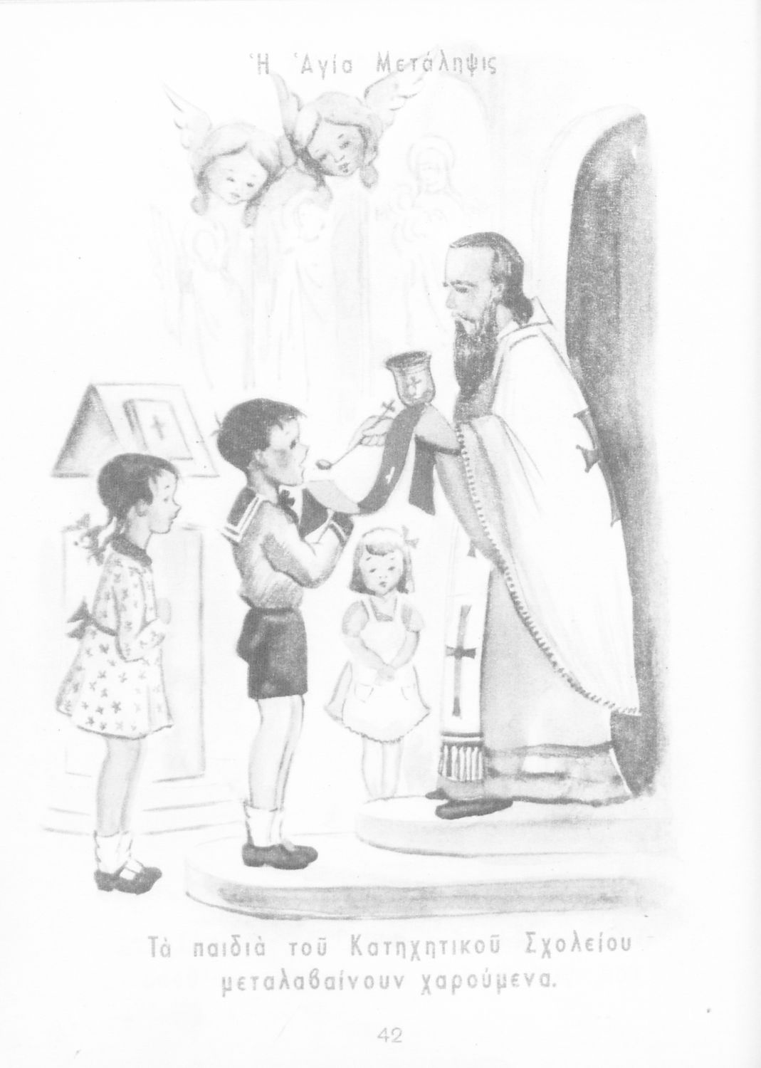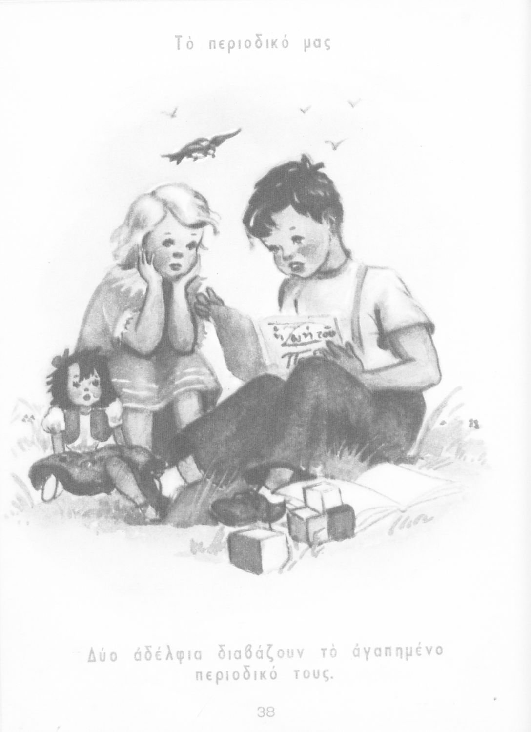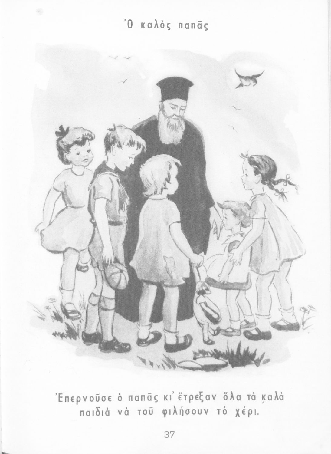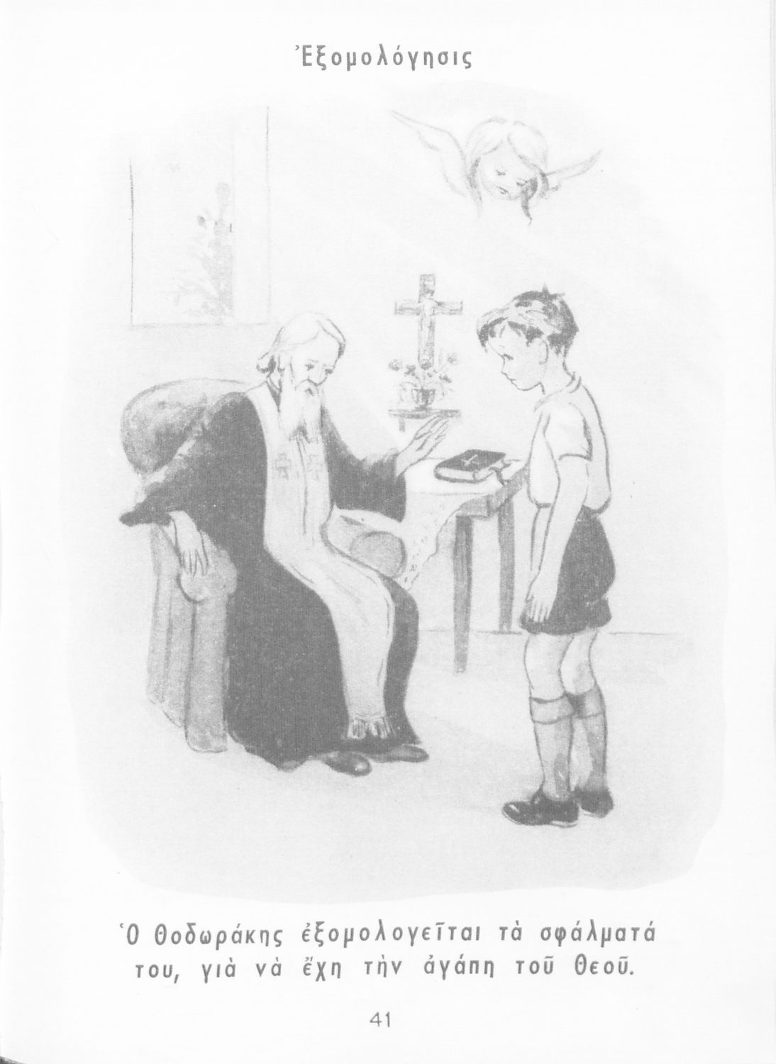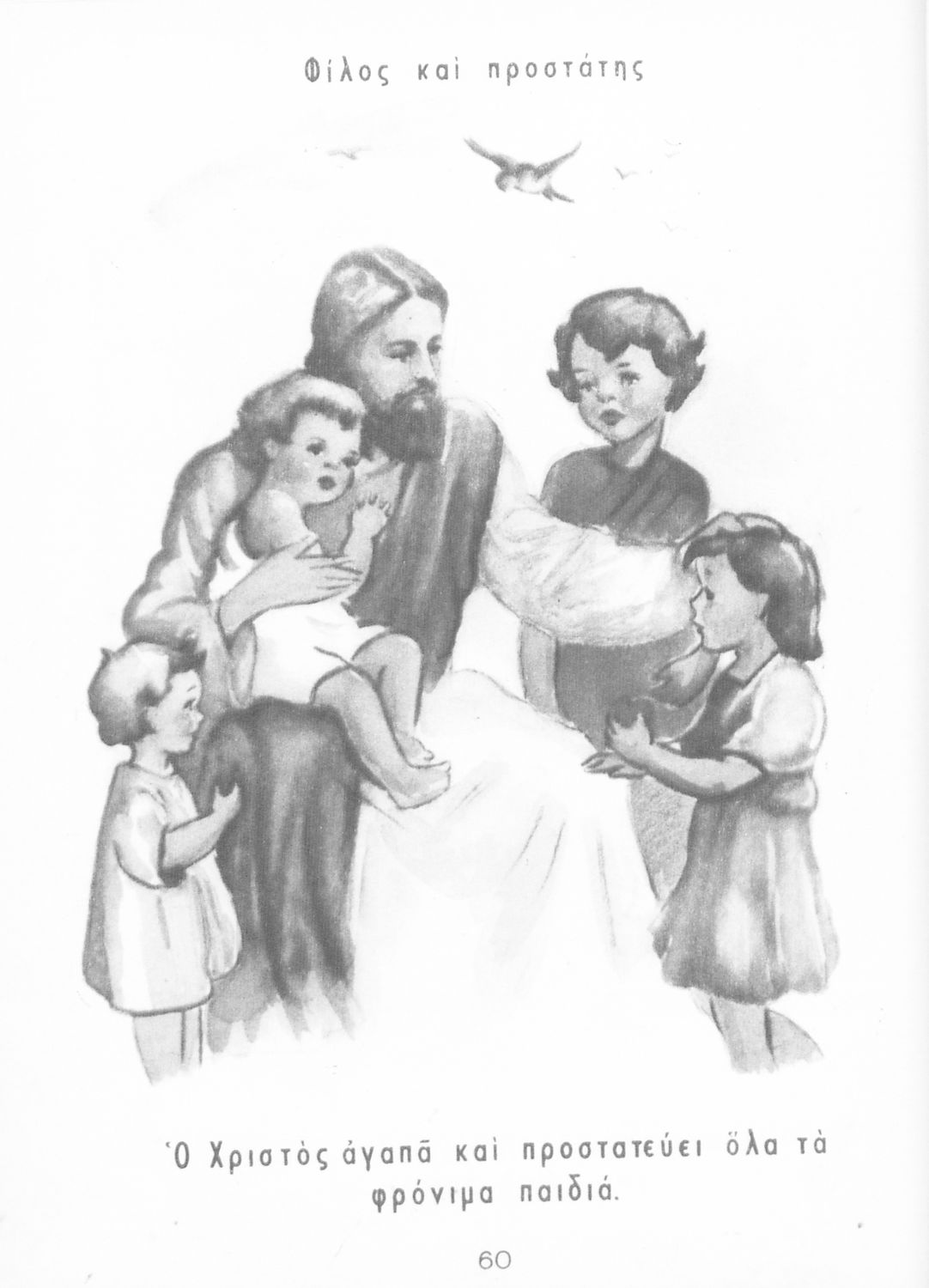 Μαθητικό βοήθημα Γλώσσας Α΄ Δημοτικού που περιλαμβάνει εικόνες με λεζάντες με ηθικό και θρησκευτικό περιεχόμενο.