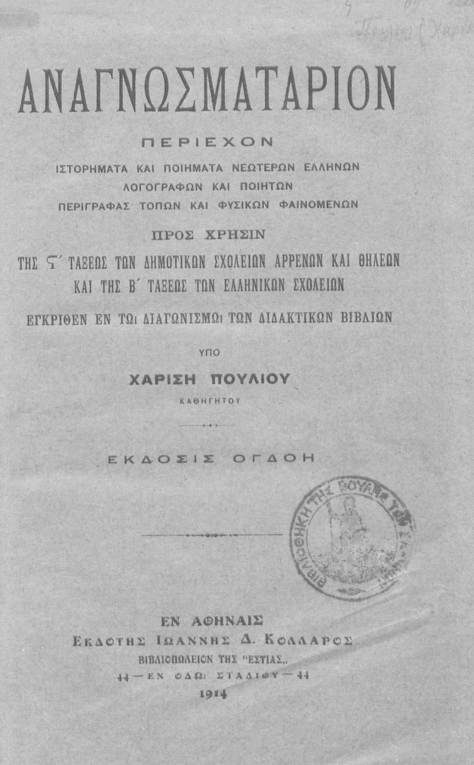 Τίτλος: Αναγνωσματάριον περιέχον ιστορήματα και ποιήματα νεωτέρων Ελλήνων λογογράφων και ποιητών περιγραφάς τόπων και φυσικών φαινομένων προς χρήσιν της ΣΤ΄ τάξεως των Δημοτικών Σχολείων αρρένων και θηλέων και της Β΄ τάξεως των Ελληνικών Σχολείων