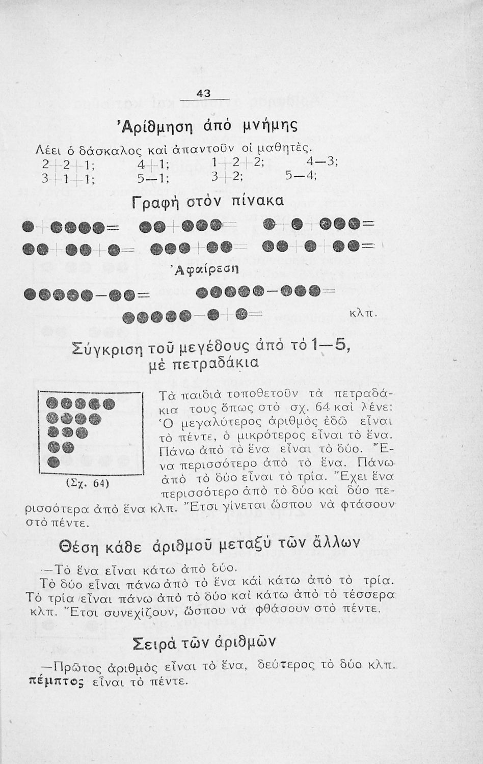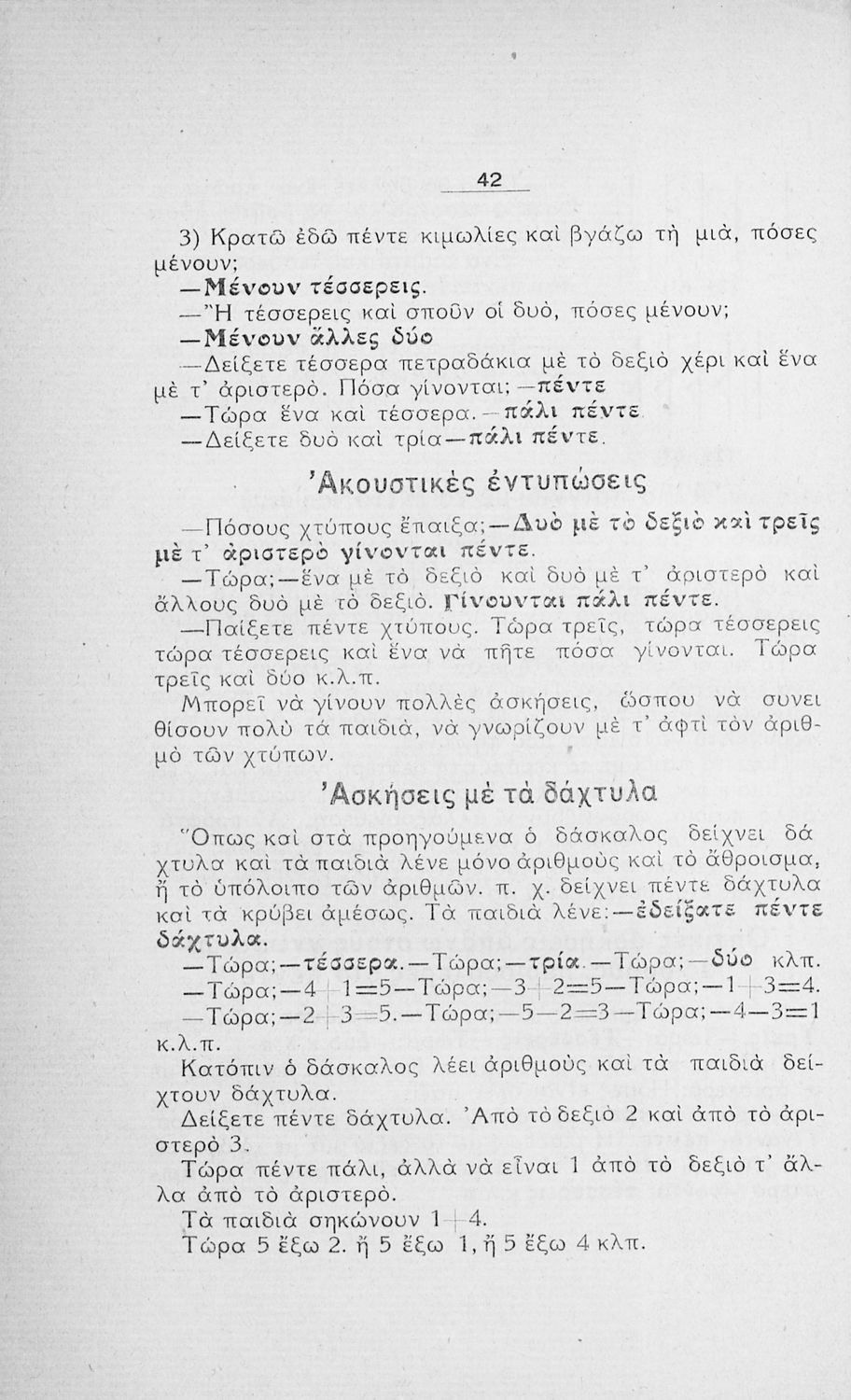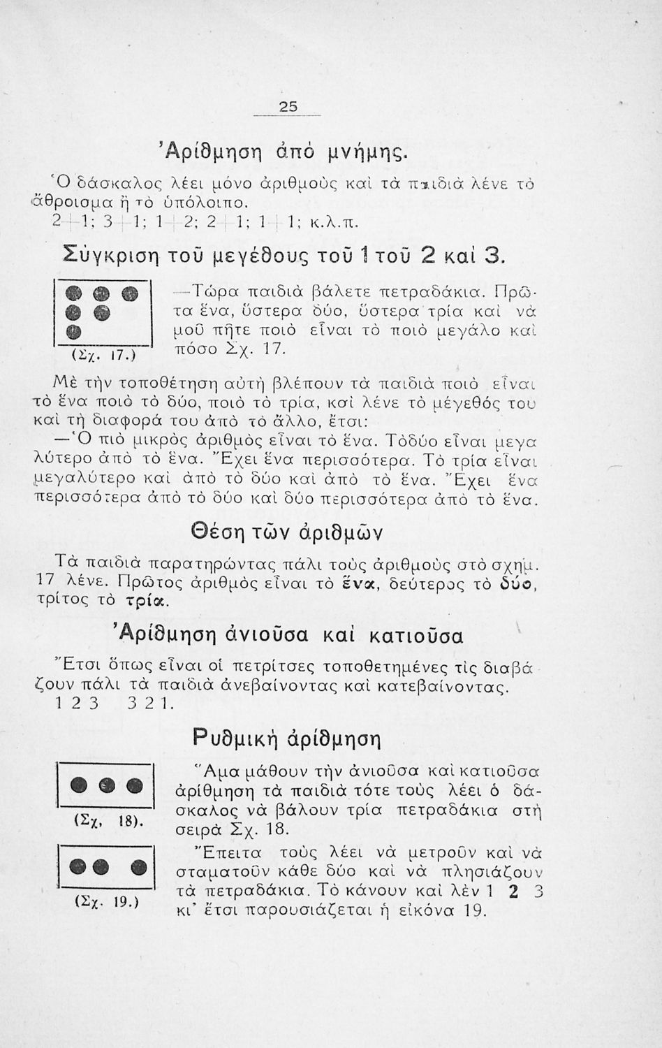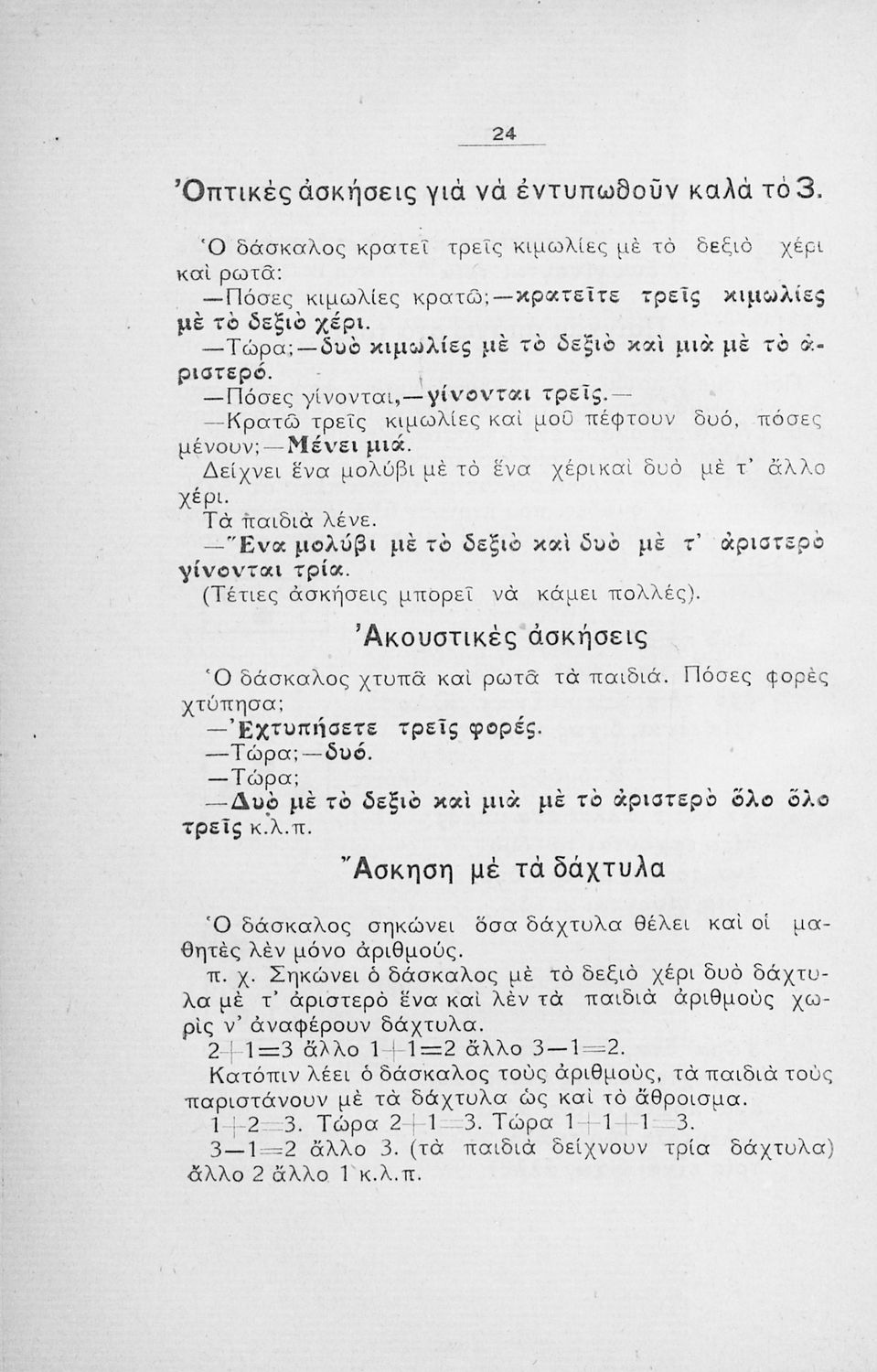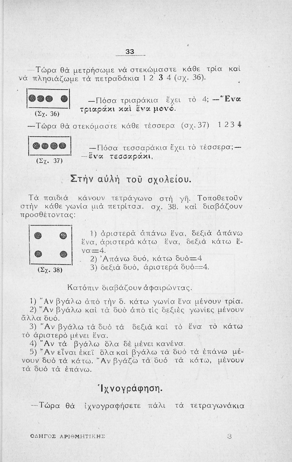 Παρουσίαση περιεχομένου: Το σύγγραμμα ήταν παιδαγωγικό βοήθημα για τη διδασκαλία των Μαθηματικών στο Δημοτικό. Αποτελεί οδηγό για τον εκπαιδευτικό, προτείνοντας μεθόδους διδασκαλίας για την αριθμητική. Περιέχει θεωρία, ασκήσεις, προβλήματα, καθώς και σχήματα, τα οποία αισθητοποιούν τις μαθηματικές έννοιες και διευκολύνουν τη διδασκαλία.