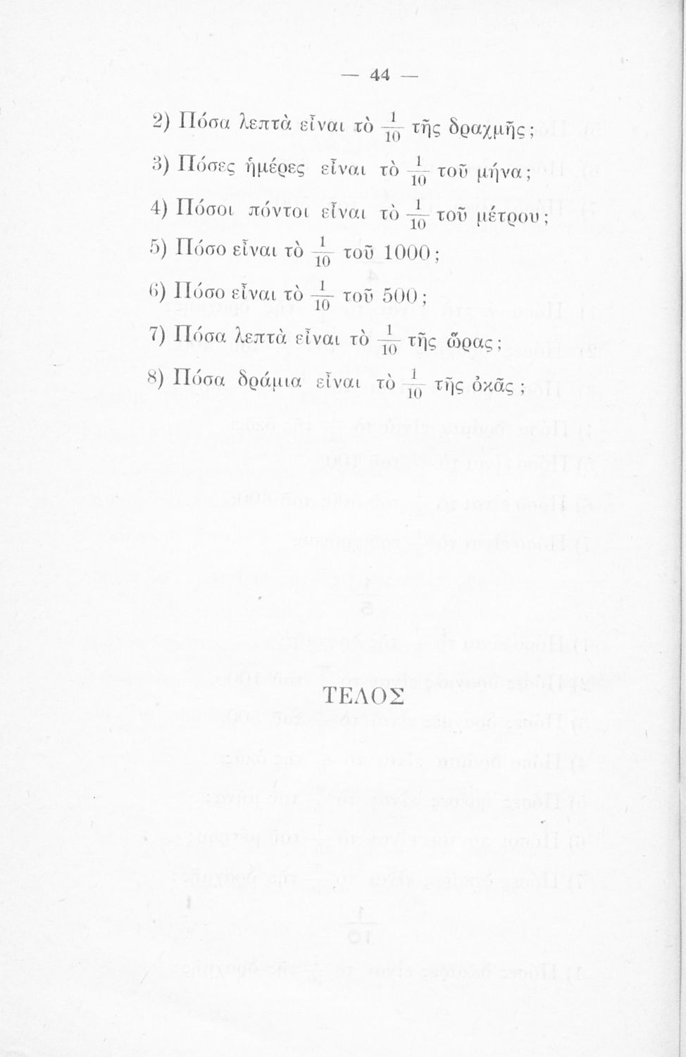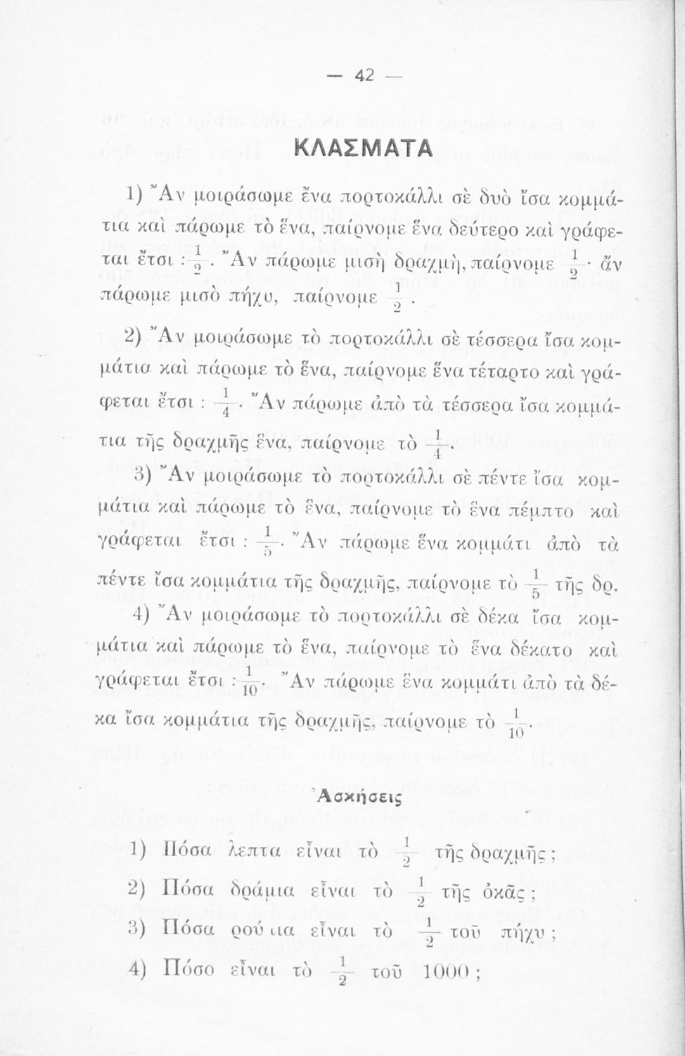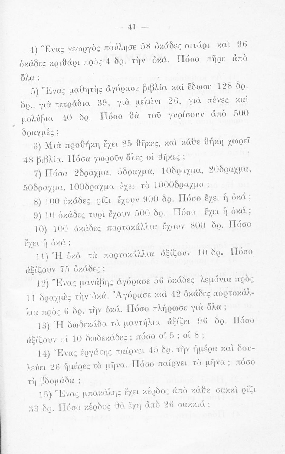 Το σύγγραμμα ήταν μαθητικό βοήθημα για τα Μαθηματικά του Δημοτικού. Περιλαμβάνει ασκήσεις και προβλήματα για την εξάσκηση των μαθητών στις μαθηματικές έννοιες. Αναφέρεται στις 4 βασικές πράξεις περιλαμβάνοντας