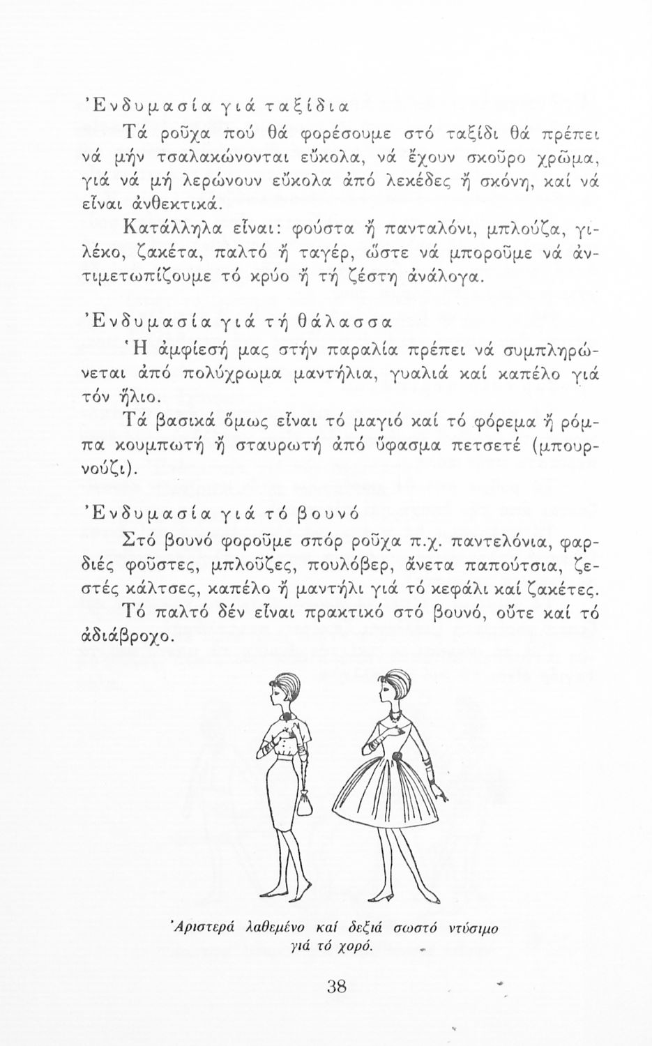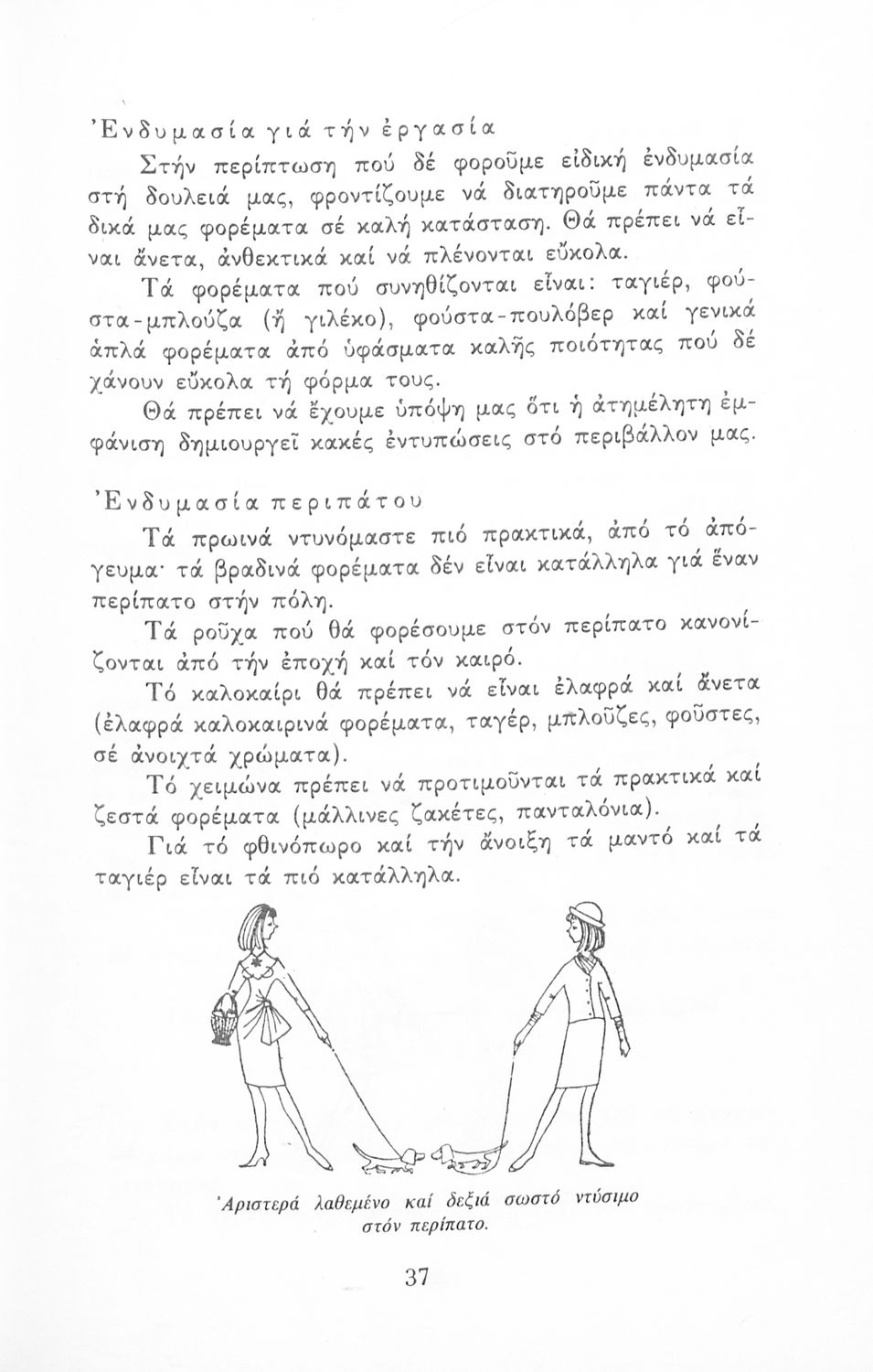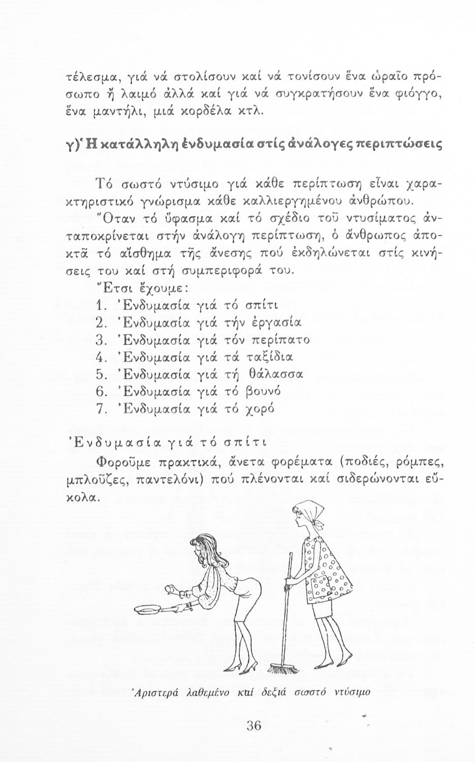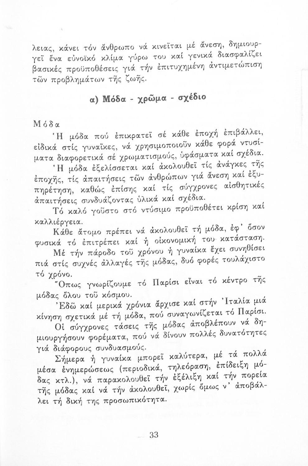 Σχολικό Εγχειρίδιο Οικιακής Οικονομίας της Α' Γυμνασίου. Το βιβλίο εξετάζει την κοινωνική αγωγή, την συμπεριφορά, την εμφάνιση, την ενδυμασία, την χρήση των ρούχων, την αισθητική της ενδυμασίας, την ταξινόμησή τους ανάλογα με τις πρώτες ύλες. Επίσης αναφέρεται στην κατοικία και στις μορφές της καθώς και στην αισθητική και στις διαφορετικές χρήσεις των κατοικιών.
