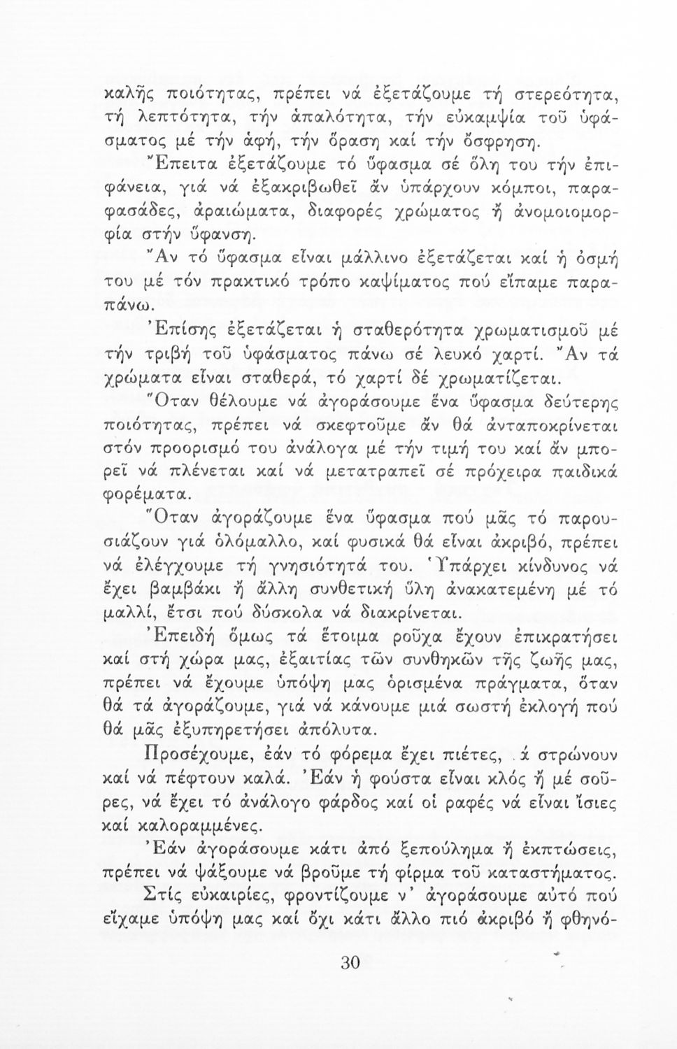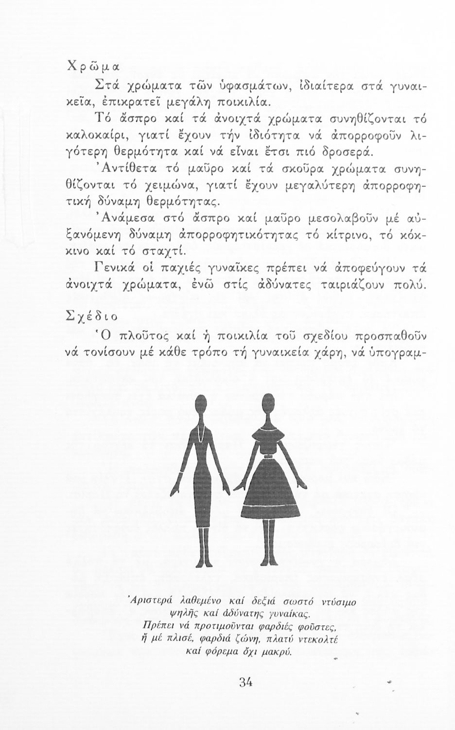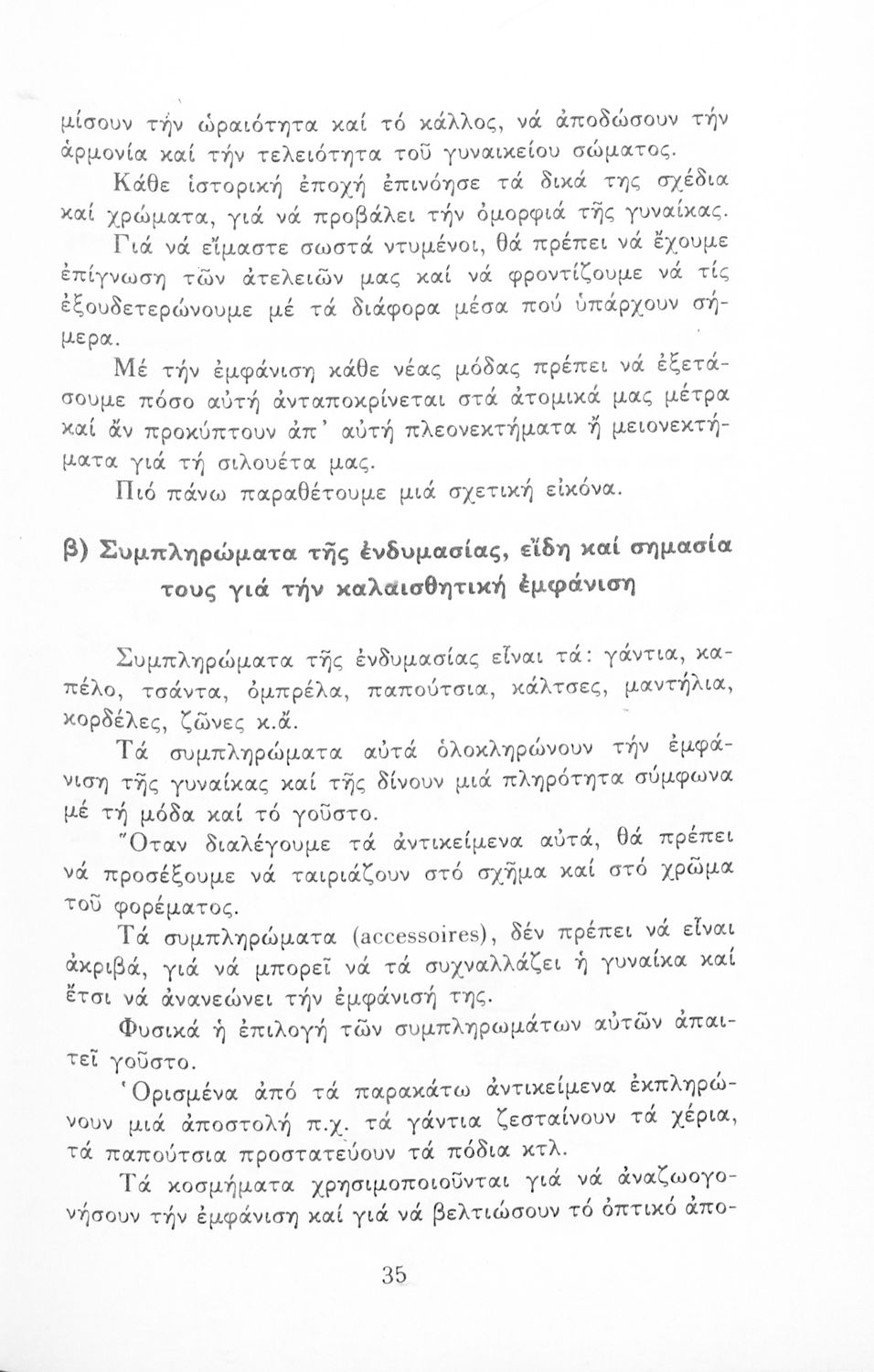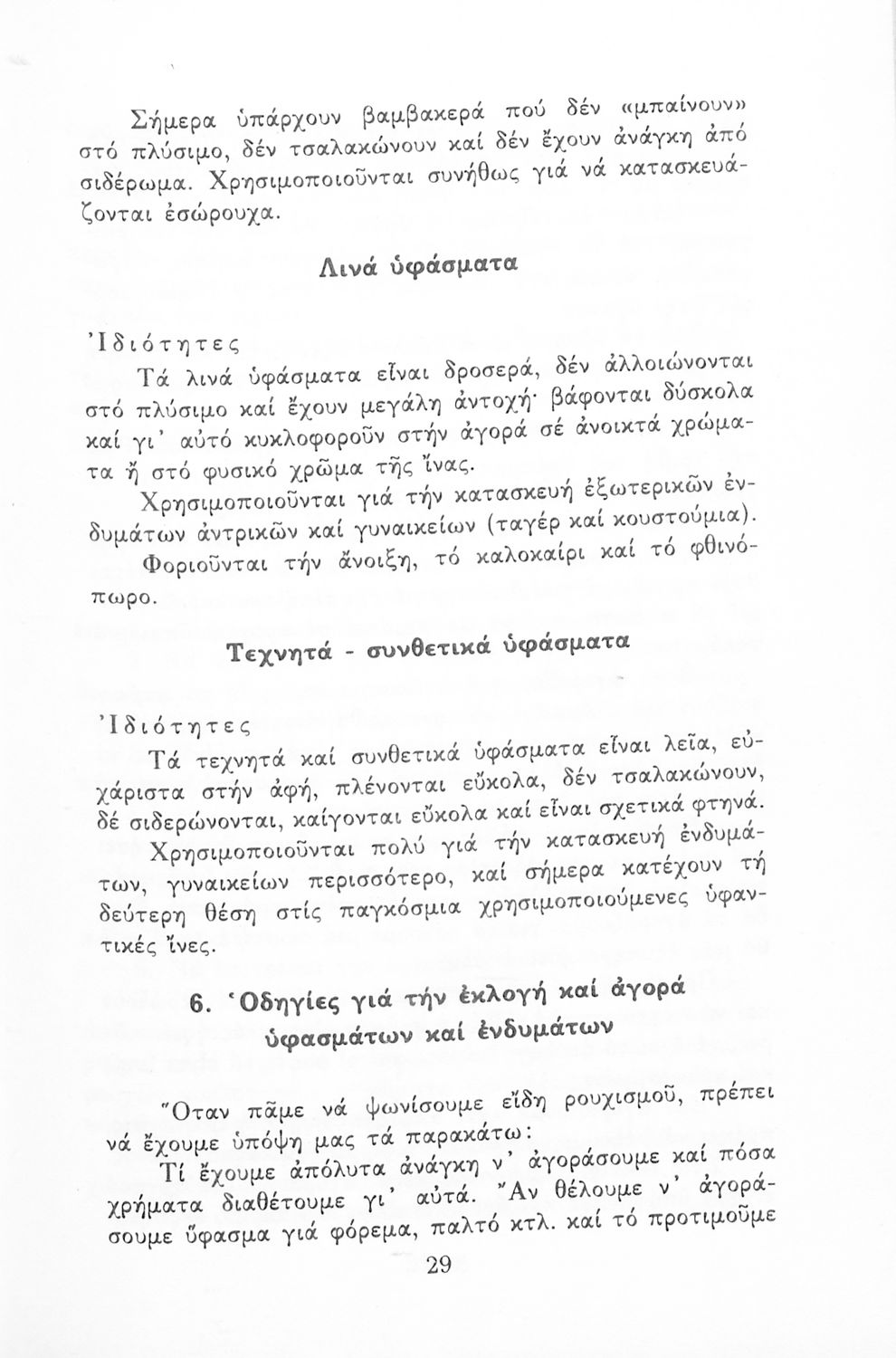 Σχολικό Εγχειρίδιο Οικιακής Οικονομίας της Α' Γυμνασίου. Το βιβλίο εξετάζει την κοινωνική αγωγή, την συμπεριφορά, την εμφάνιση, την ενδυμασία, την χρήση των ρούχων, την αισθητική της ενδυμασίας, την ταξινόμησή τους ανάλογα με τις πρώτες ύλες. Επίσης αναφέρεται στην κατοικία και στις μορφές της καθώς και στην αισθητική και στις διαφορετικές χρήσεις των κατοικιών.