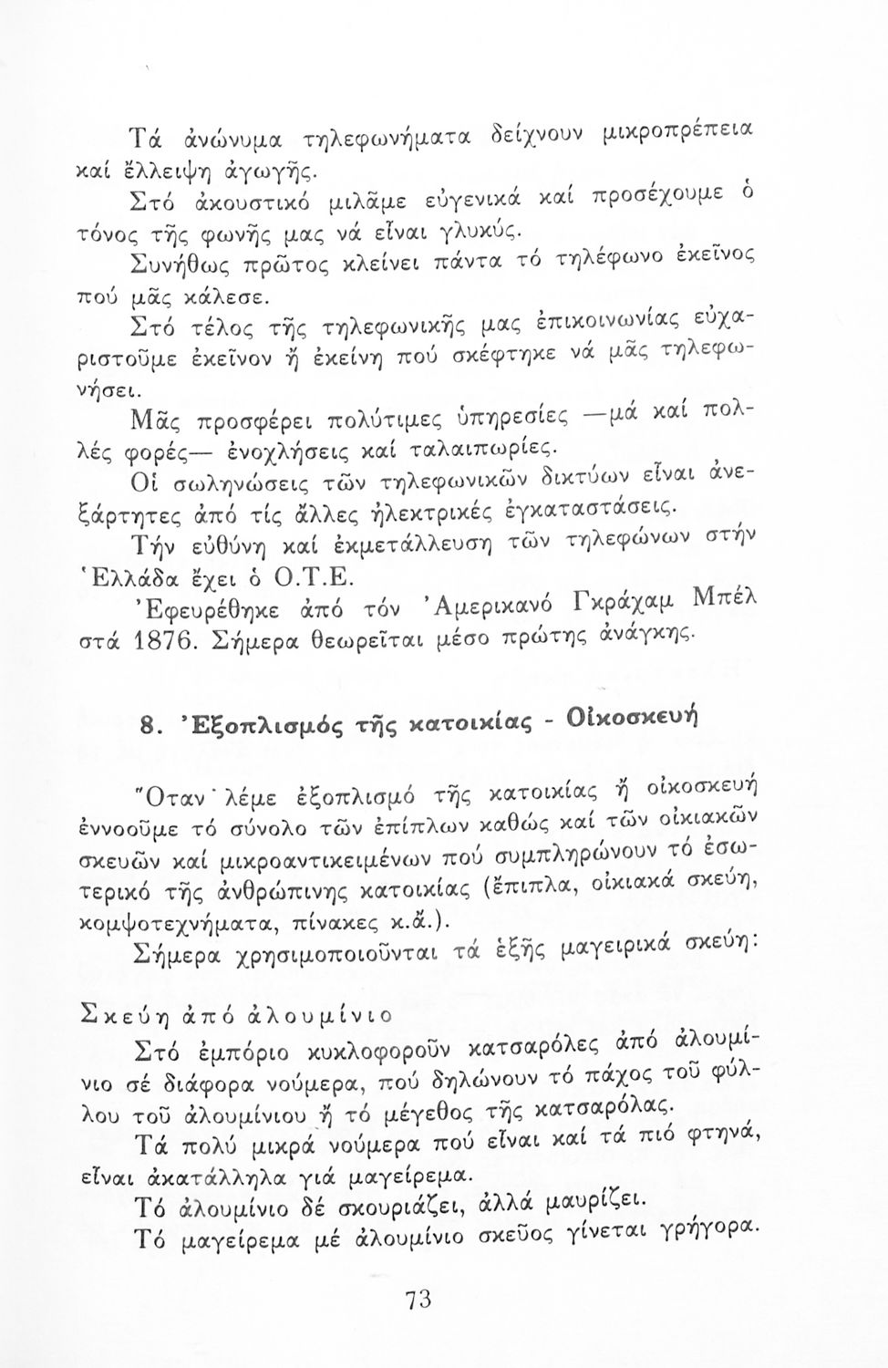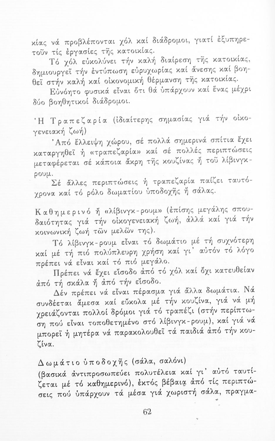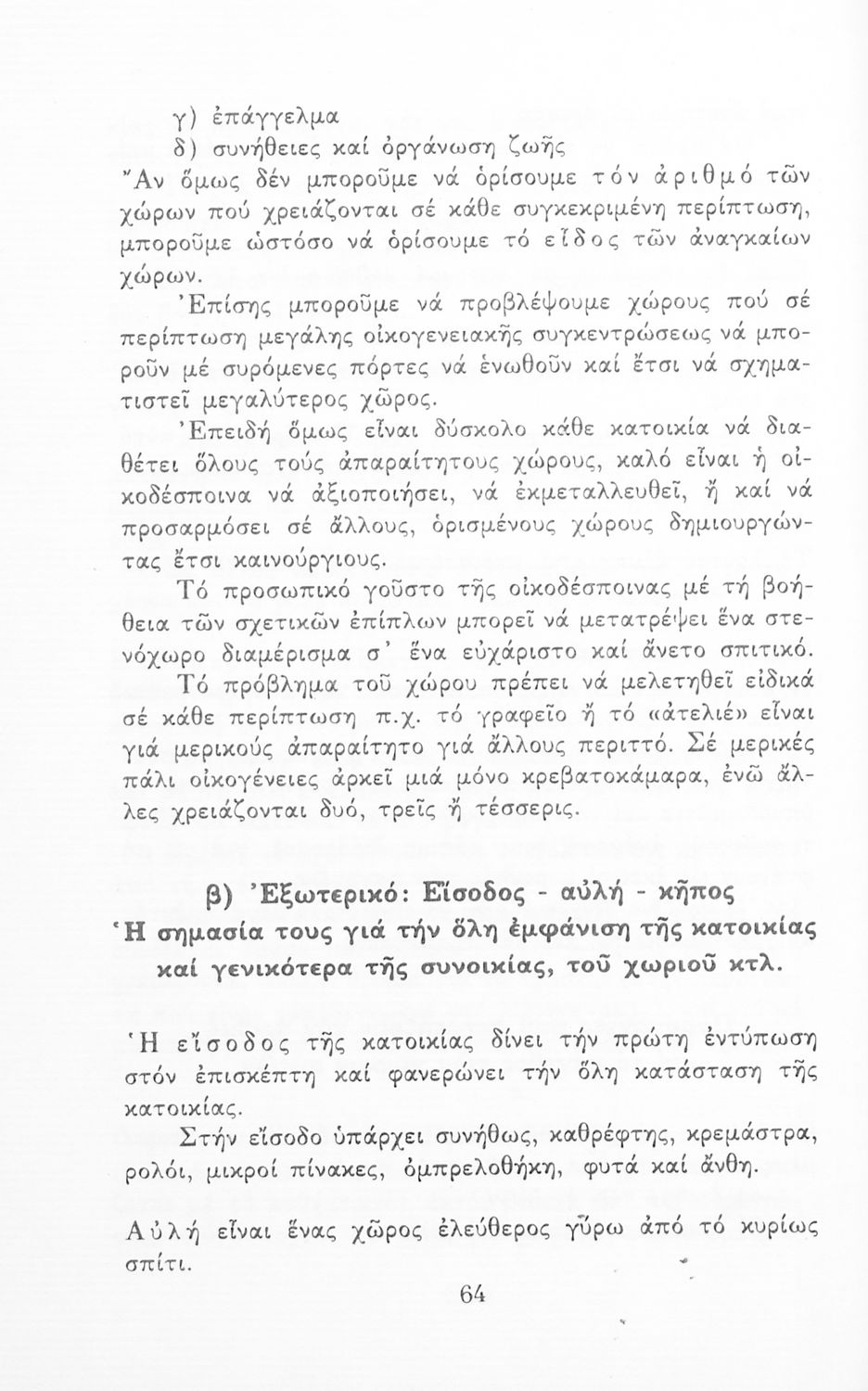 Σχολικό Εγχειρίδιο Οικιακής Οικονομίας της Α' Γυμνασίου. Το βιβλίο εξετάζει την κοινωνική αγωγή, την συμπεριφορά, την εμφάνιση, την ενδυμασία, την χρήση των ρούχων, την αισθητική της ενδυμασίας, την ταξινόμησή τους ανάλογα με τις πρώτες ύλες. Επίσης αναφέρεται στην κατοικία και στις μορφές της καθώς και στην αισθητική και στις διαφορετικές χρήσεις των κατοικιών.
