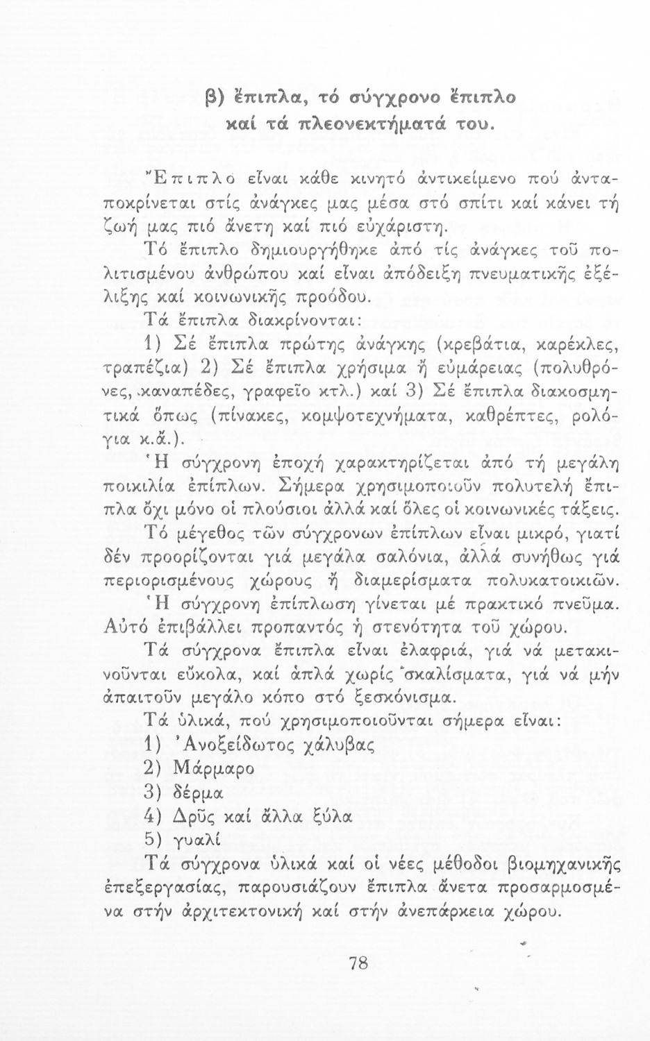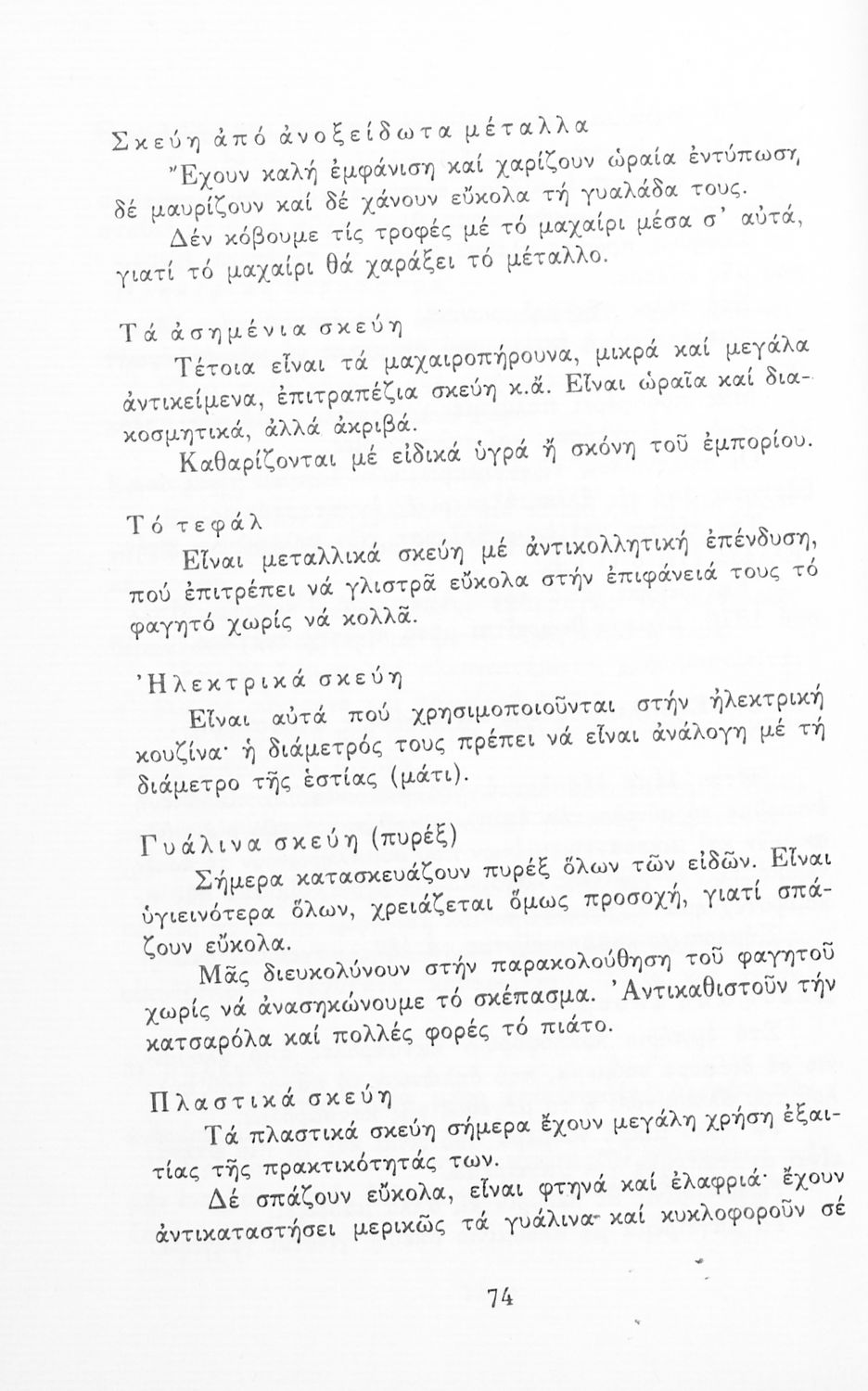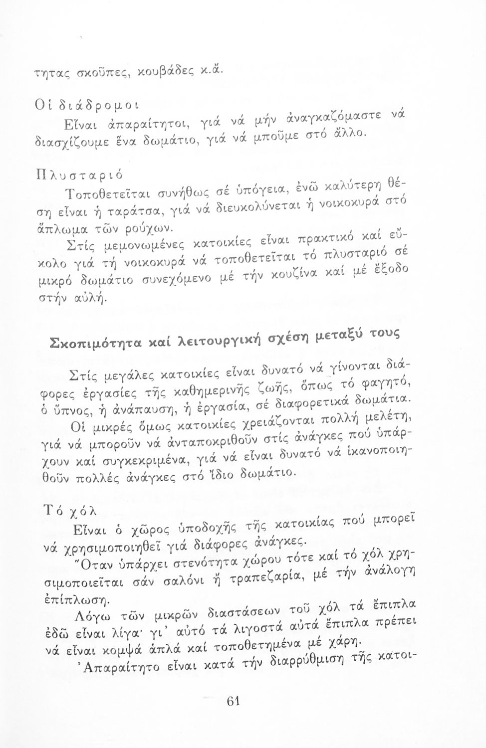 Σχολικό Εγχειρίδιο Οικιακής Οικονομίας της Α' Γυμνασίου. Το βιβλίο εξετάζει την κοινωνική αγωγή, την συμπεριφορά, την εμφάνιση, την ενδυμασία, την χρήση των ρούχων, την αισθητική της ενδυμασίας, την ταξινόμησή τους ανάλογα με τις πρώτες ύλες. Επίσης αναφέρεται στην κατοικία και στις μορφές της καθώς και στην αισθητική και στις διαφορετικές χρήσεις των κατοικιών.