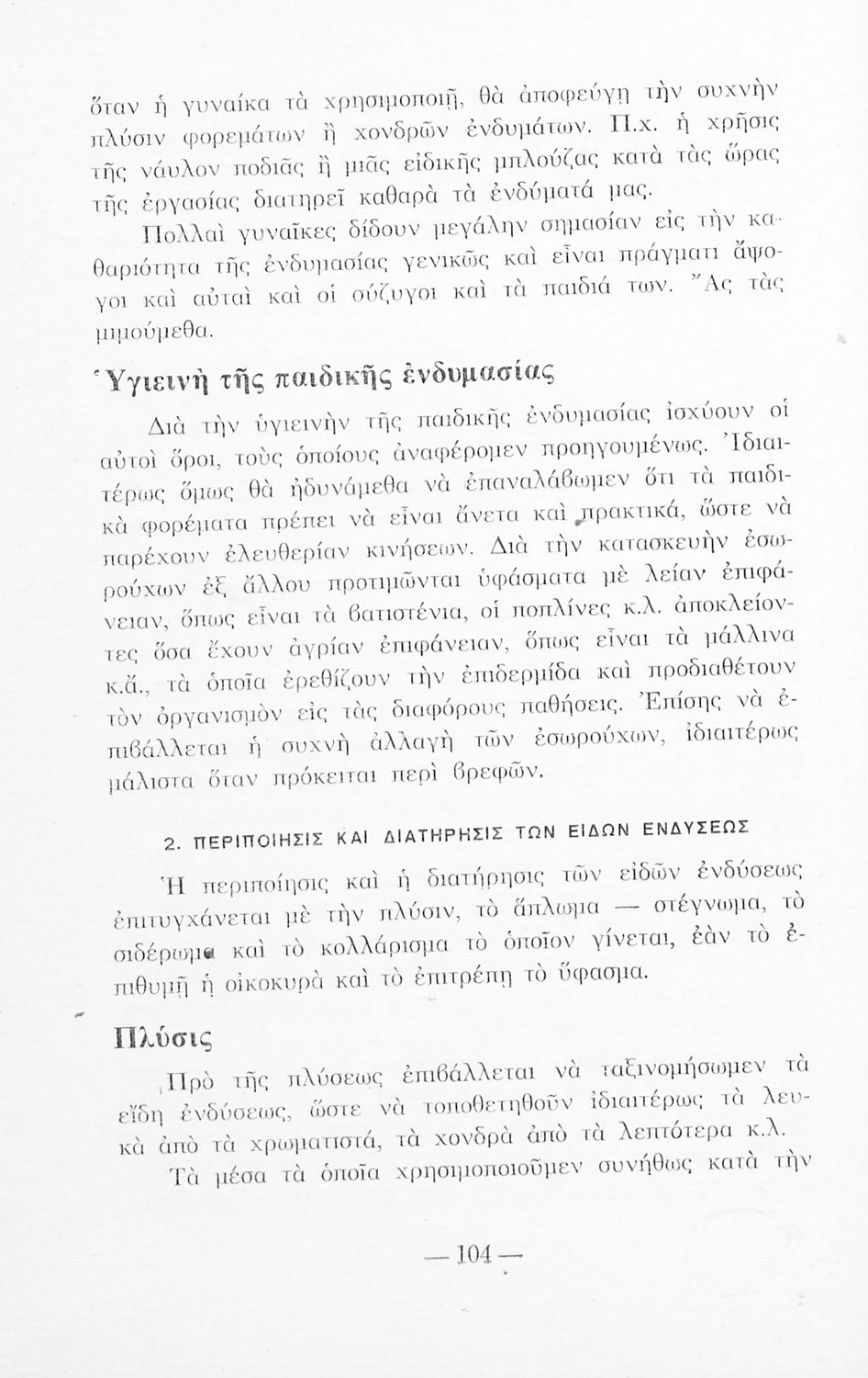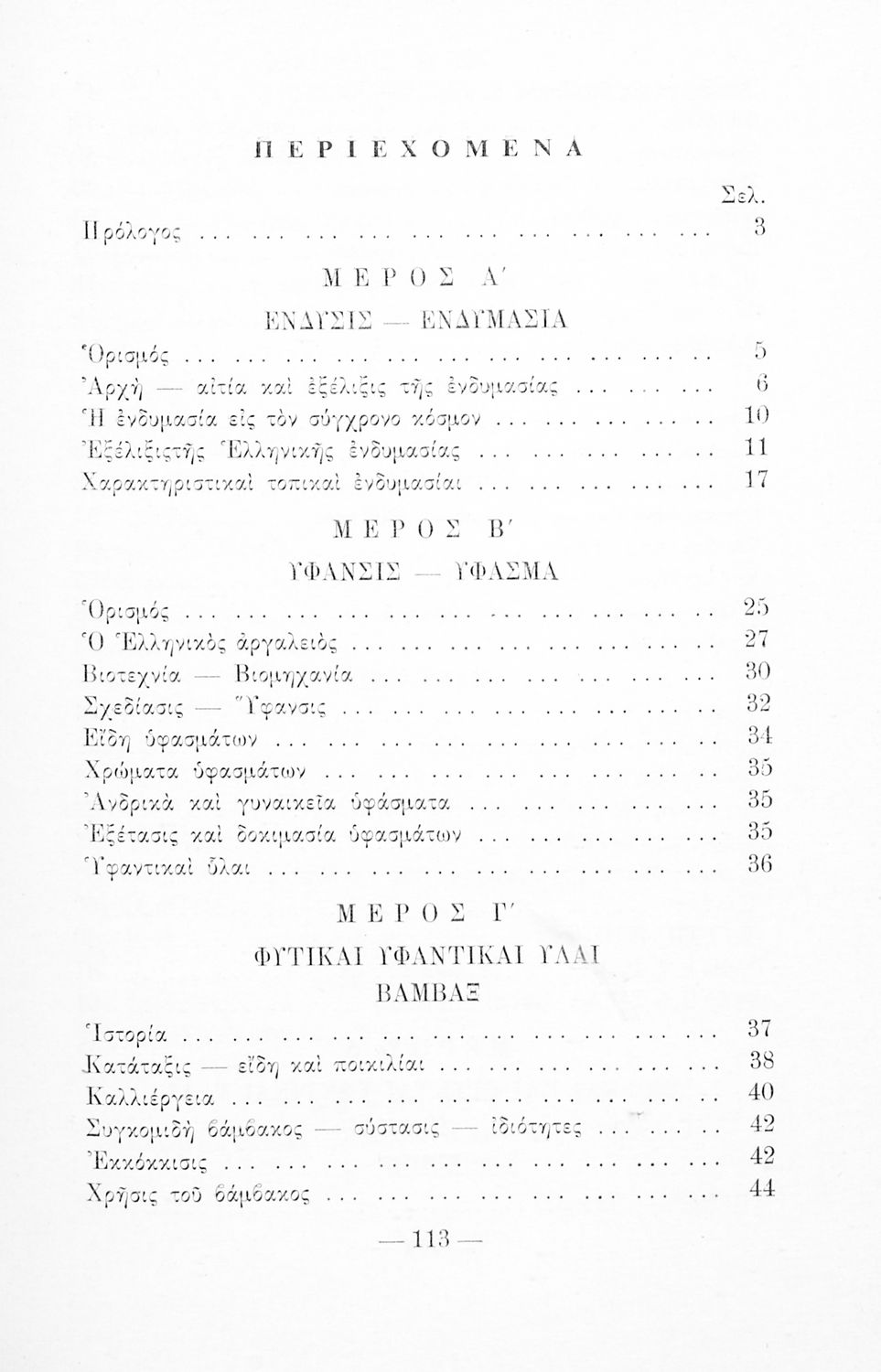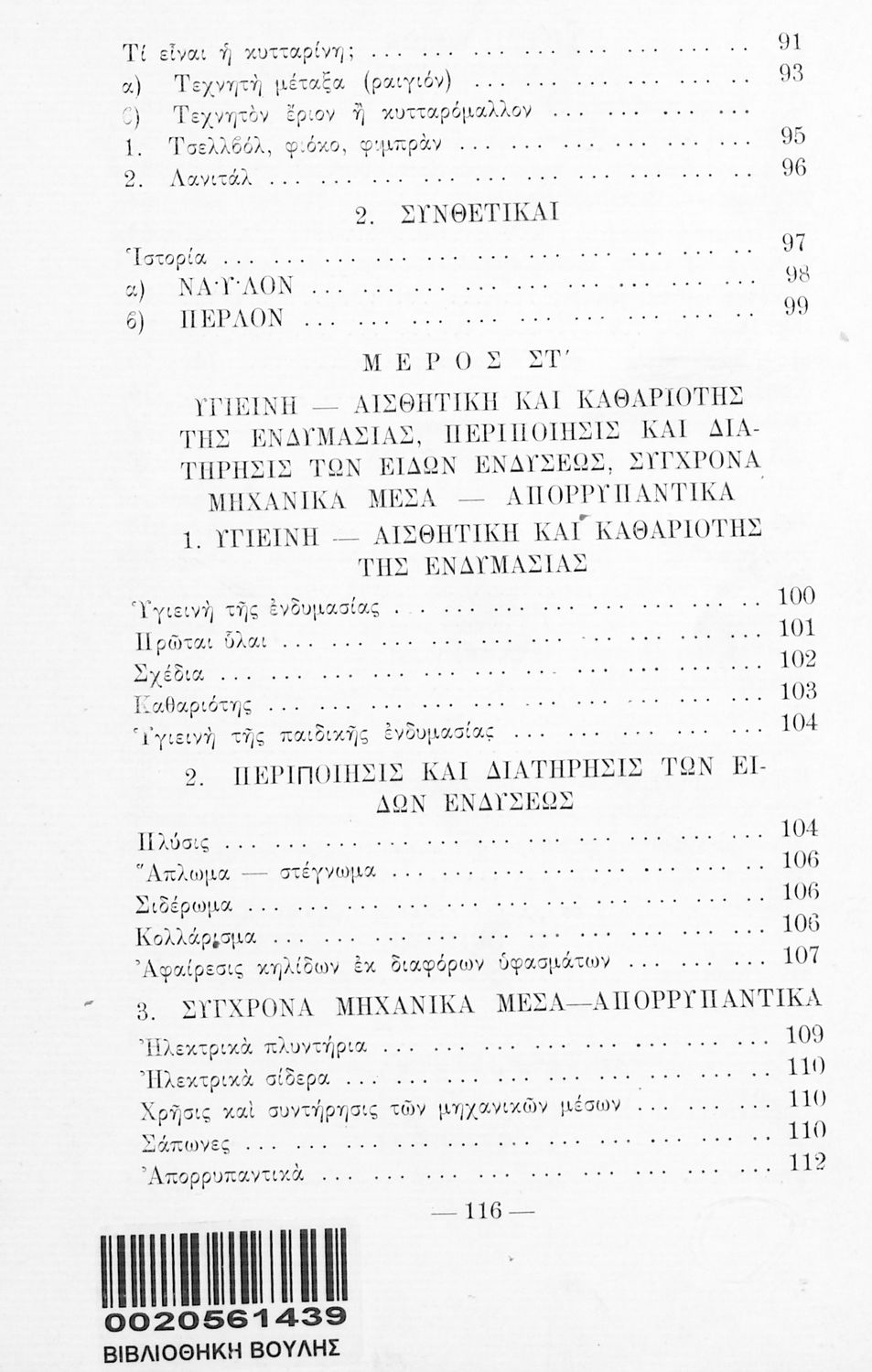 Παρουσίαση περιεχομένου: Το σύγγραμμα ήταν σχολικό εγχειρίδιο για το μάθημα της Οικιακής Οικονομίας στο Γυμνάσιο. Περιέχει πληροφορίες σχετικά με την ένδυση, την υφαντουργίας, τη βαμβακοβιομηχανία και την ανάπτυξη του κλάδου στην Ελλάδα. Επίσης, αναφέρει πληροφορίες για τα φυσικά και συνθετικά υλικά που χρησιμοποιούνται στη βιοτεχνία.