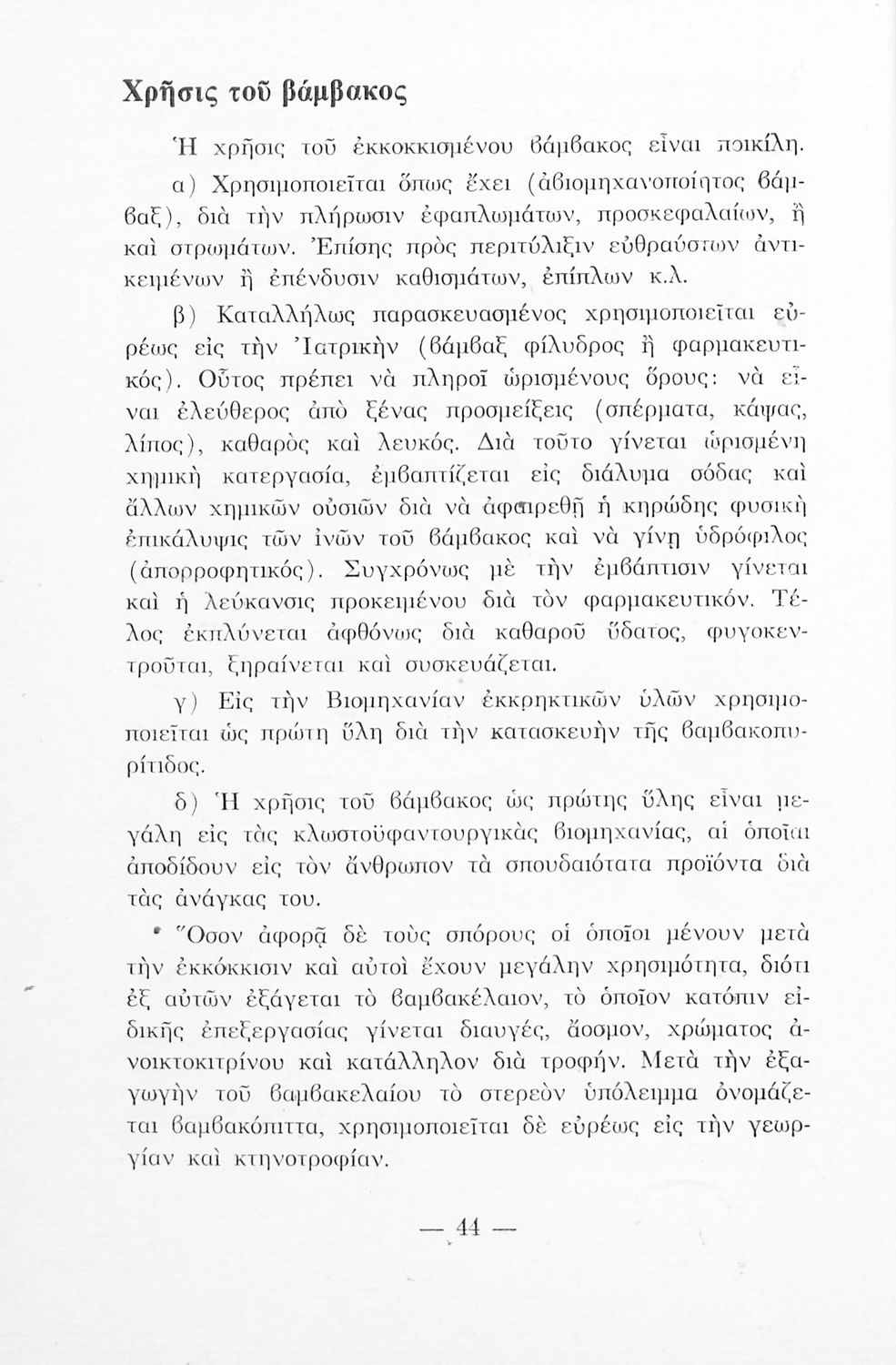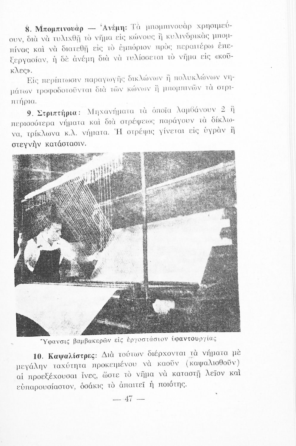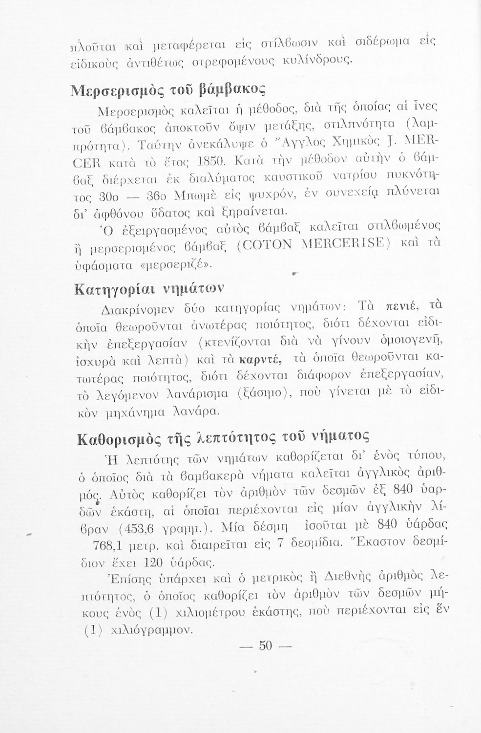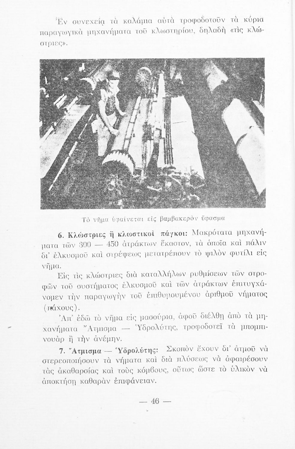 Βαθμίδα εκπαίδευσης: Δευτεροβάθμια Τάξη: Α' Γυμνασίου Μάθημα: Οικιακή Οικονομία Γλώσσα: Απλή καθαρεύουσα Παρουσίαση περιεχομένου: Το σύγγραμμα ήταν σχολικό εγχειρίδιο για το μάθημα της Οικιακής Οικονομίας στο Γυμνάσιο. Περιέχει πληροφορίες σχετικά με την ένδυση, την υφαντουργίας, τη βαμβακοβιομηχανία και την ανάπτυξη του κλάδου στην Ελλάδα. Επίσης, αναφέρει πληροφορίες για τα φυσικά και συνθετικά υλικά που χρησιμοποιούνται στη βιοτεχνία. |