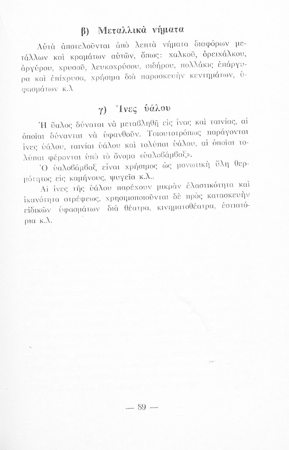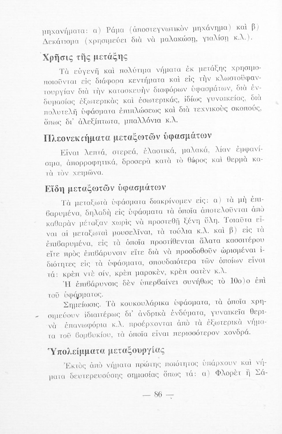Βαθμίδα εκπαίδευσης: Δευτεροβάθμια Τάξη: Α' Γυμνασίου Μάθημα: Οικιακή Οικονομία Γλώσσα: Απλή καθαρεύουσα Παρουσίαση περιεχομένου: Το σύγγραμμα ήταν σχολικό εγχειρίδιο για το μάθημα της Οικιακής Οικονομίας στο Γυμνάσιο. Περιέχει πληροφορίες σχετικά με την ένδυση, την υφαντουργίας, τη βαμβακοβιομηχανία και την ανάπτυξη του κλάδου στην Ελλάδα. Επίσης, αναφέρει πληροφορίες για τα φυσικά και συνθετικά υλικά που χρησιμοποιούνται στη βιοτεχνία. |