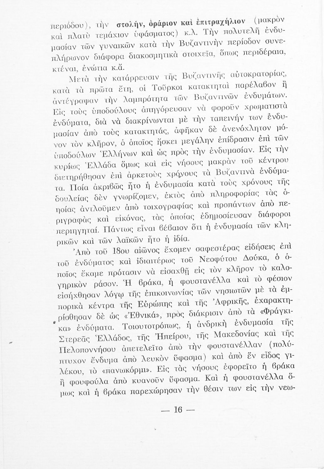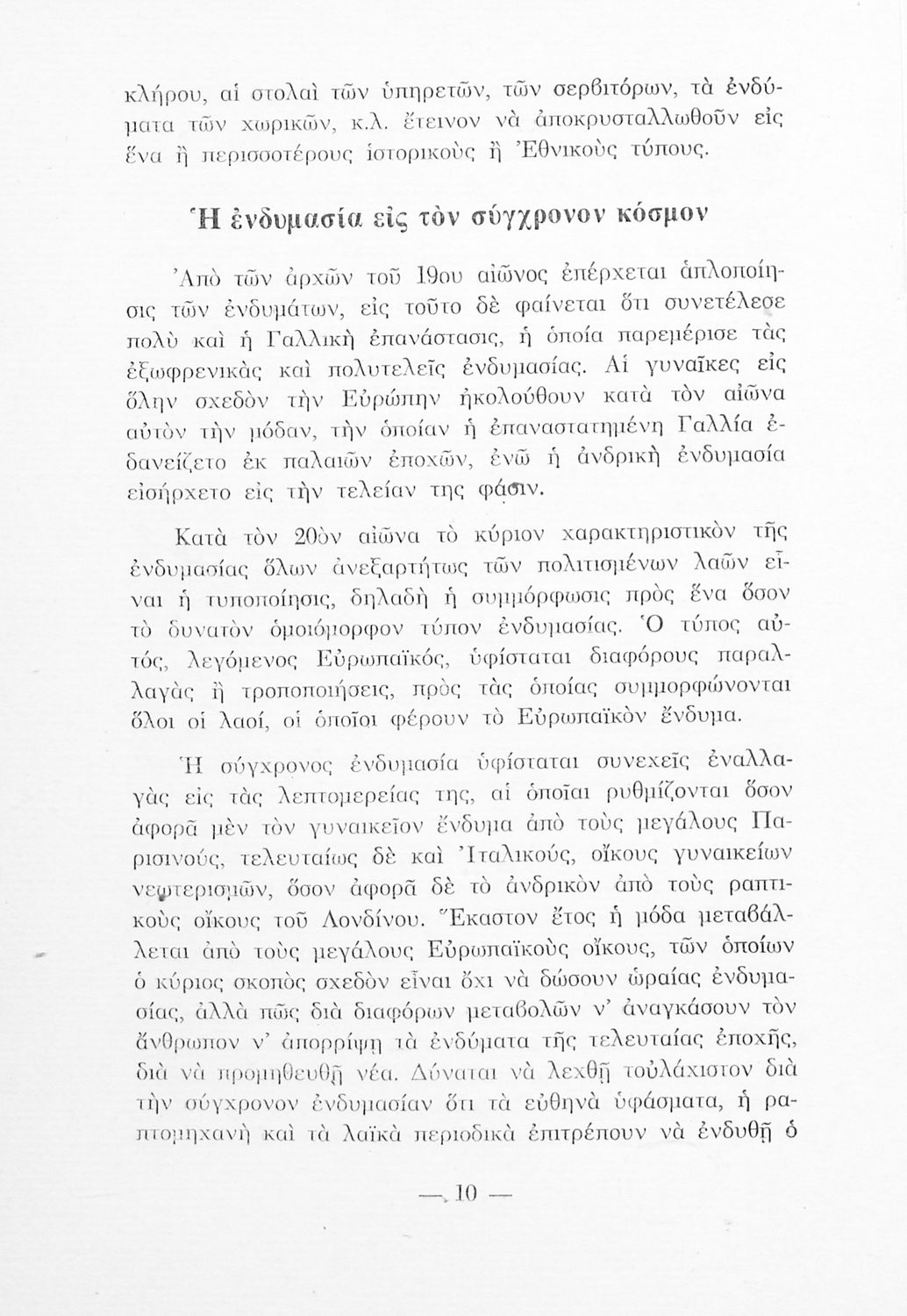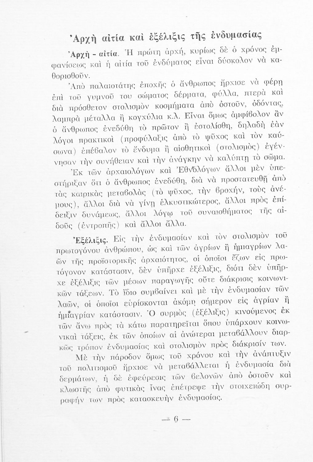Το σύγγραμμα ήταν σχολικό εγχειρίδιο για το μάθημα της Οικιακής Οικονομίας στο Γυμνάσιο. Περιέχει πληροφορίες σχετικά με την ένδυση, την υφαντουργίας, τη βαμβακοβιομηχανία και την ανάπτυξη του κλάδου στην Ελλάδα. Επίσης, αναφέρει πληροφορίες για τα φυσικά και συνθετικά υλικά που χρησιμοποιούνται στη βιοτεχνία.