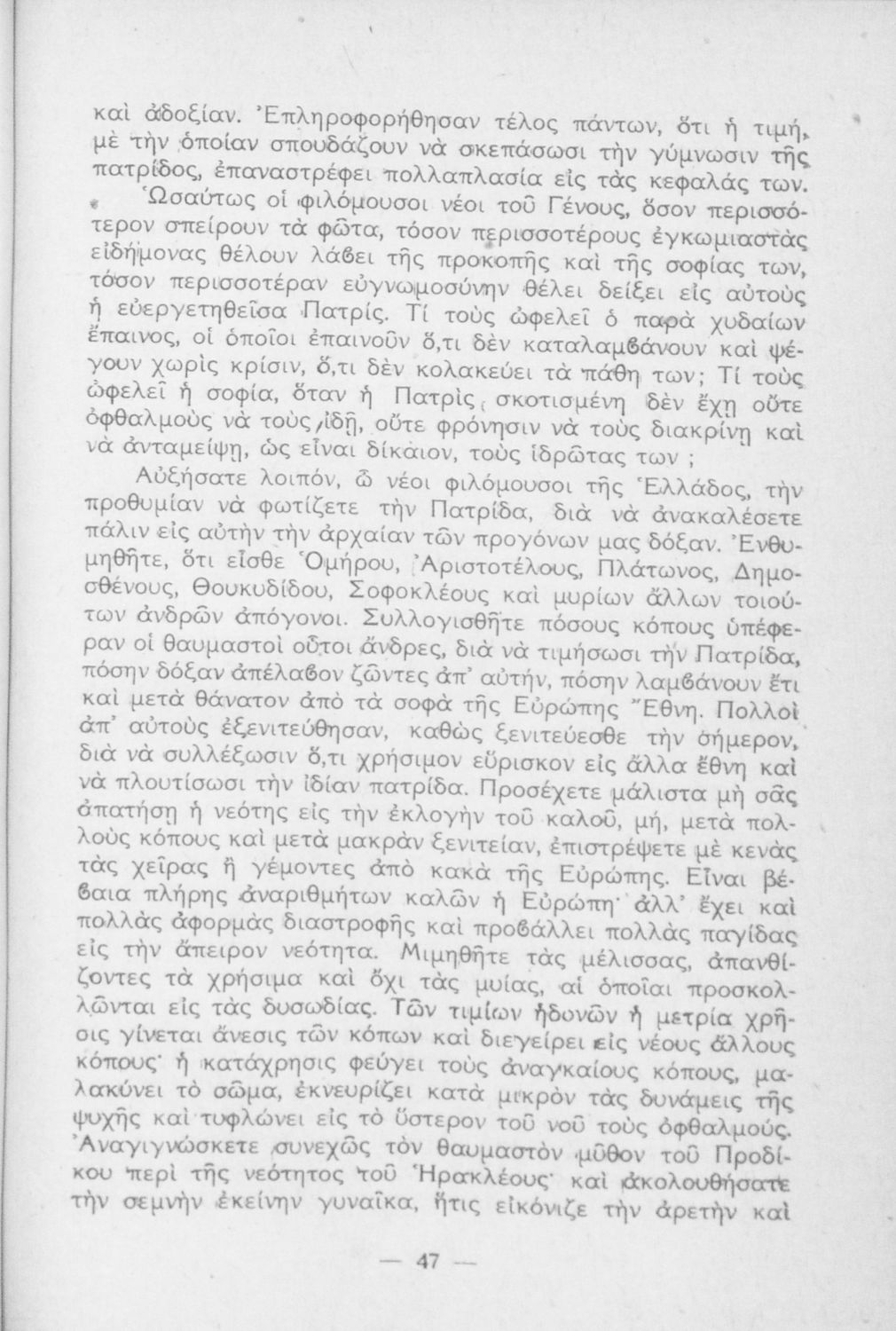 Σχολικό εγχειρίδιο Νέων Ελληνικών του 1889. Περιέχει πεζά και ποιήματα Ελλήνων λογοτεχνών εμπνευσμένα από την καθημερινή και ιστορική ζωή του τόπου. Έχει την έγκριση του Υπουργείου Δημόσιας Εκπαίδευσης.