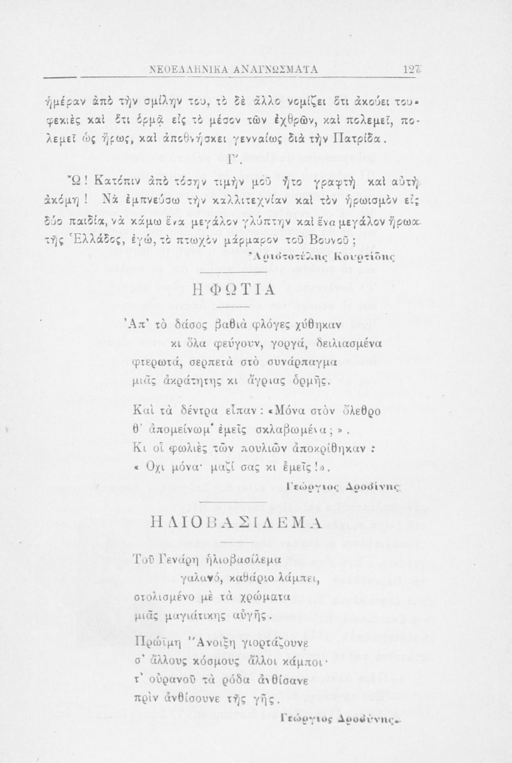 Σχολικό εγχειρίδιο Νέων Ελληνικών Γ' Ελληνικού Σχολείου που περιλαμβάνει ποιήματα και πεζά Ελλήνων συγγραφέων εμπνευσμένα από την σύγχρονη ελληνική ιστορία, την ελληνική φύση και τη ζωή στην ύπαιθρο, και τη ...