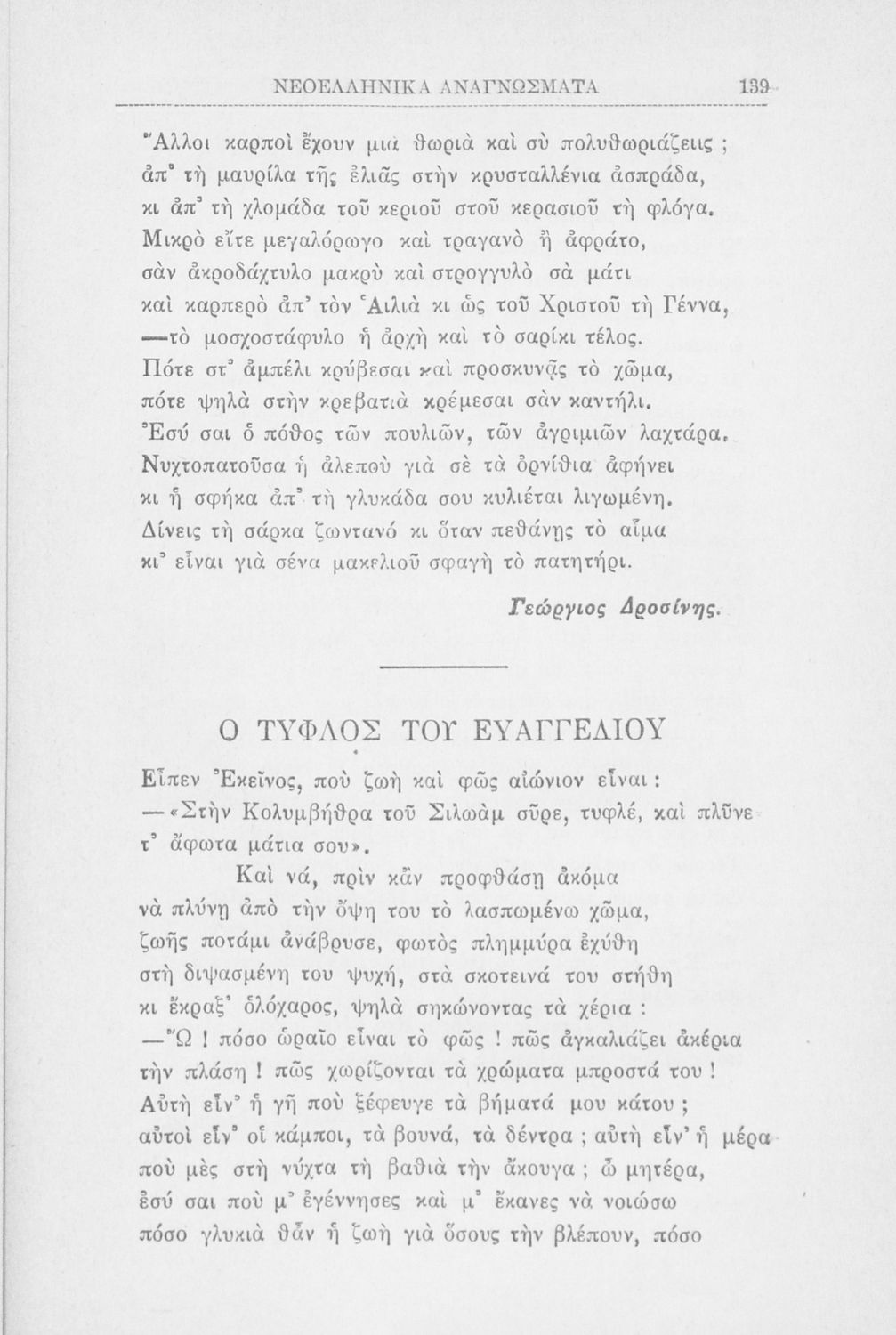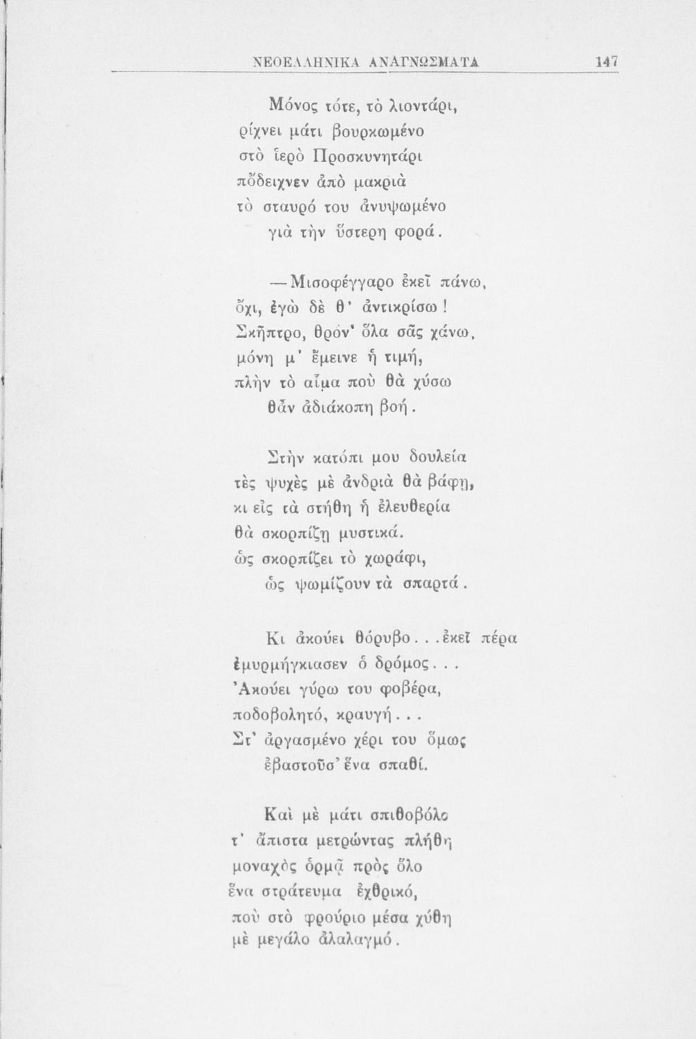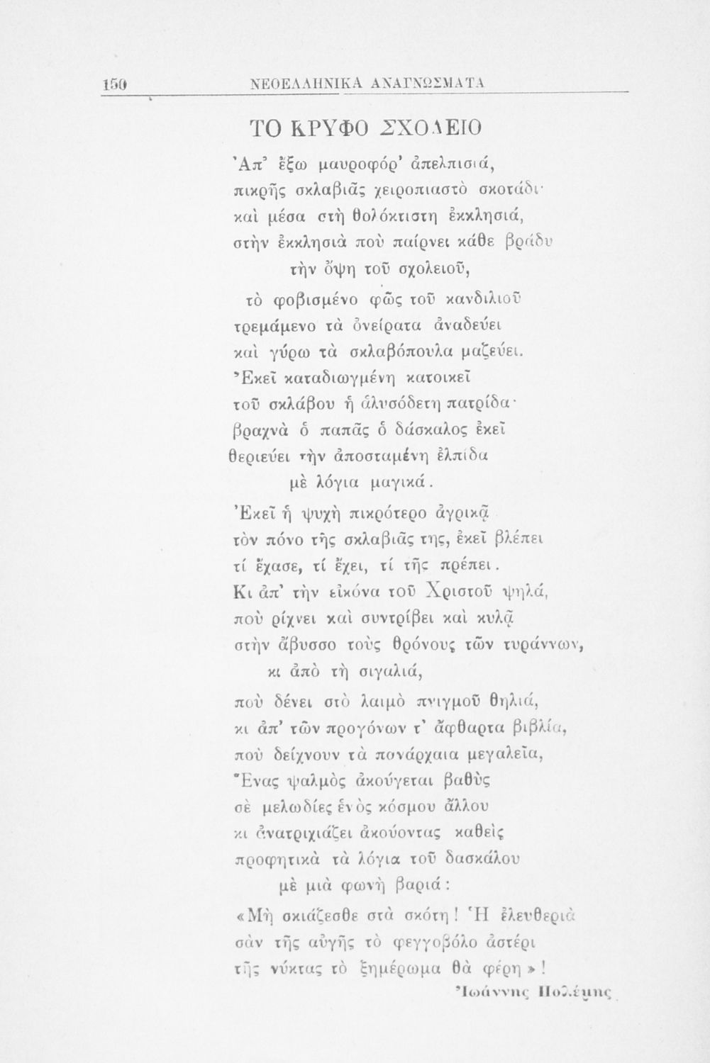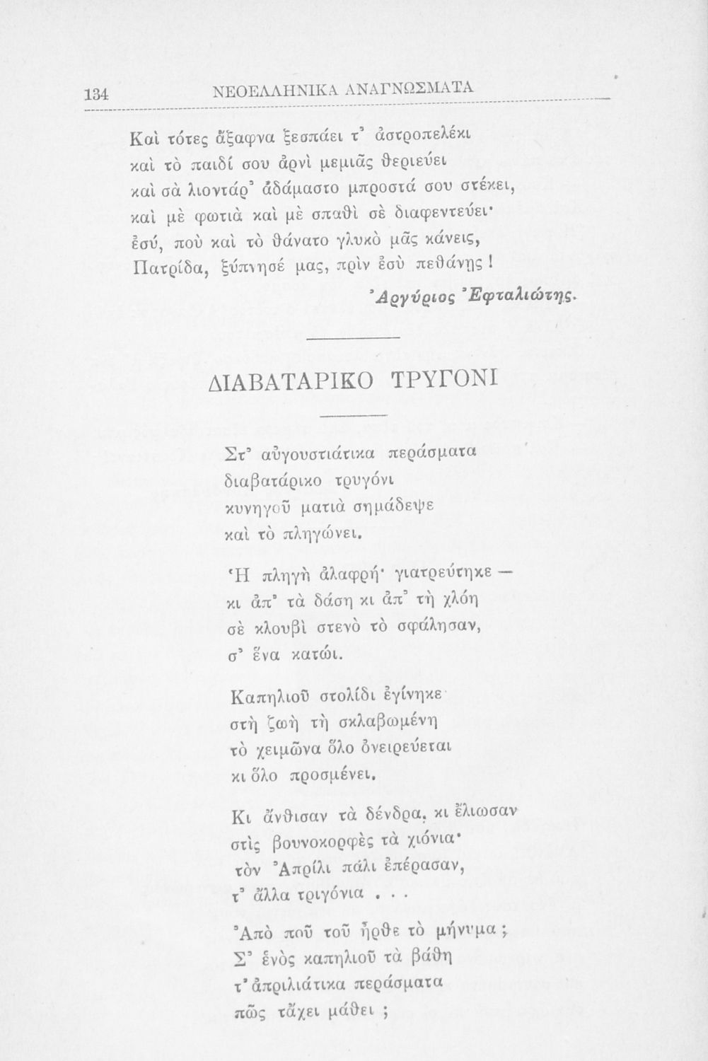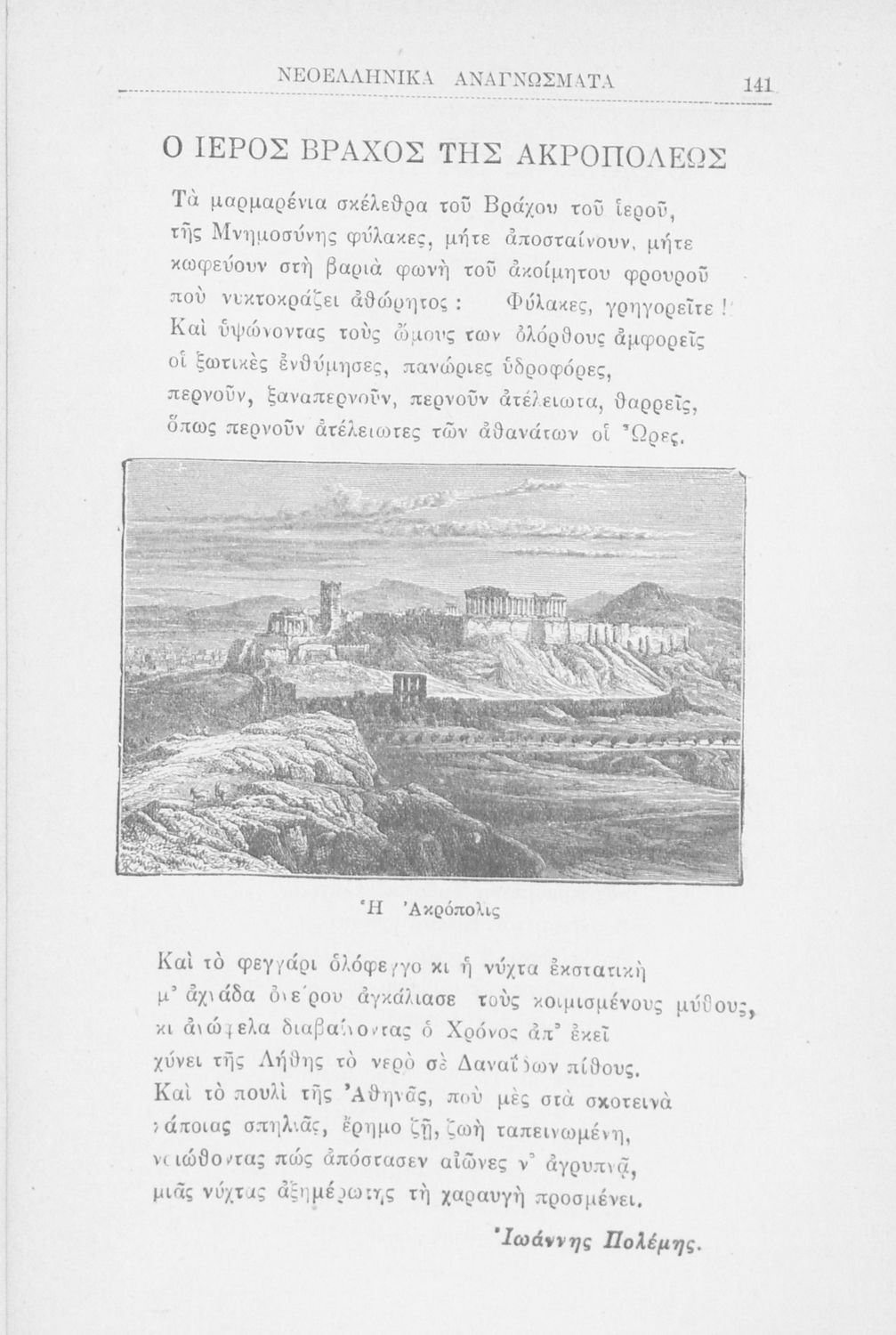 Σχολικό εγχειρίδιο Νέων Ελληνικών Γ' Ελληνικού Σχολείου που περιλαμβάνει ποιήματα και πεζά Ελλήνων συγγραφέων εμπνευσμένα από την σύγχρονη ελληνική ιστορία, την ελληνική φύση και τη ζωή στην ύπαιθρο, και τη ...