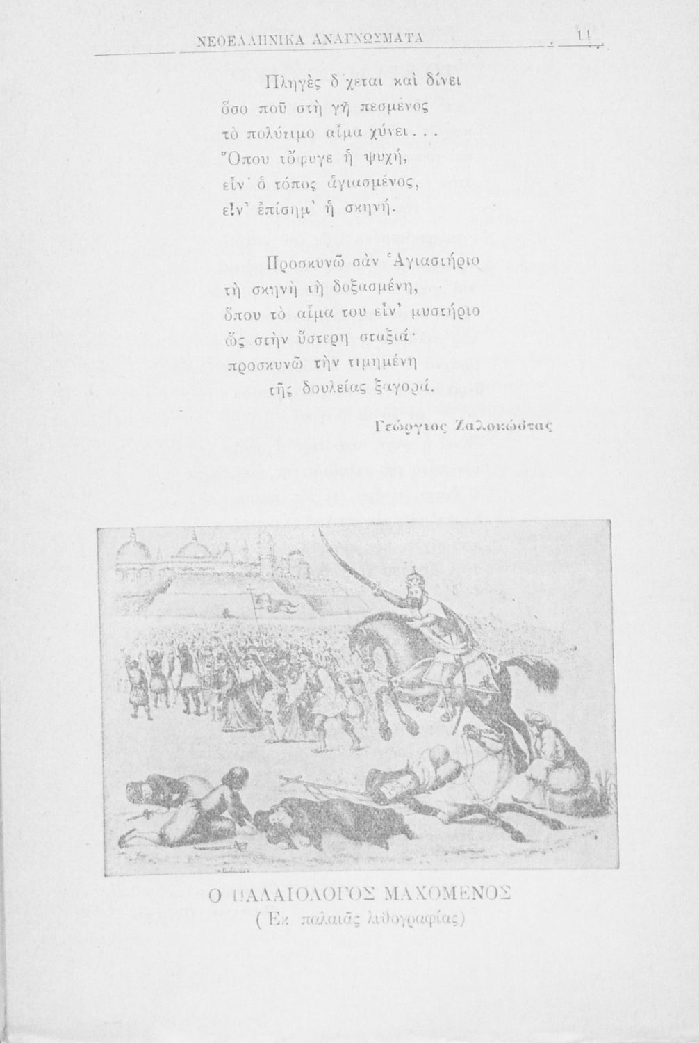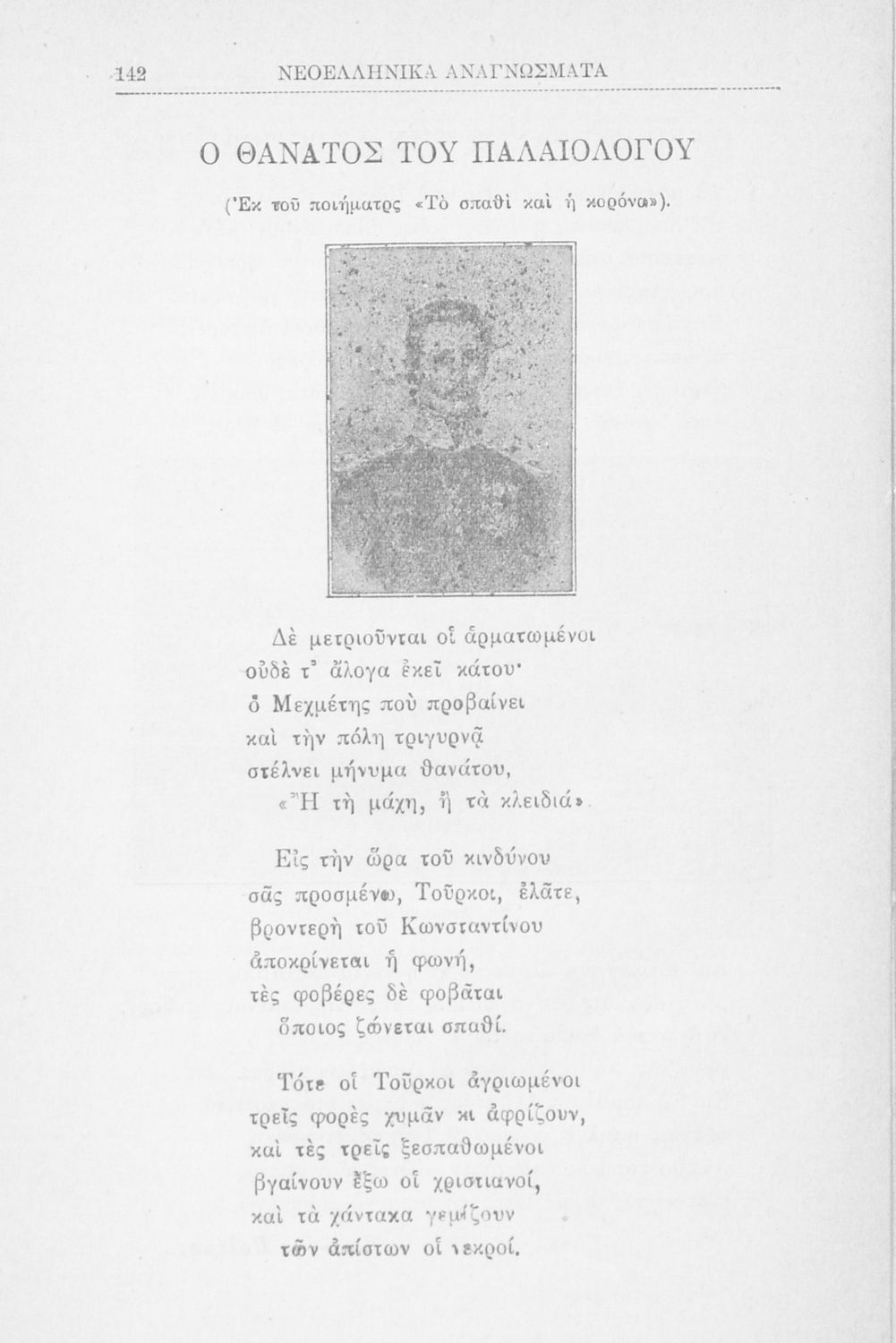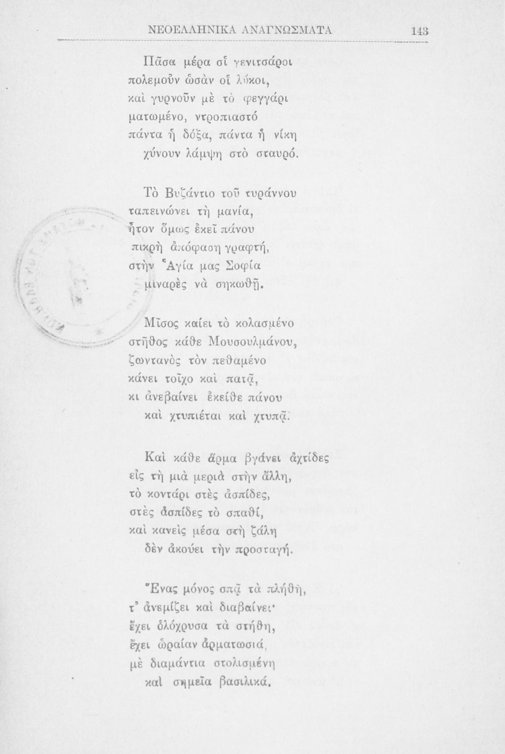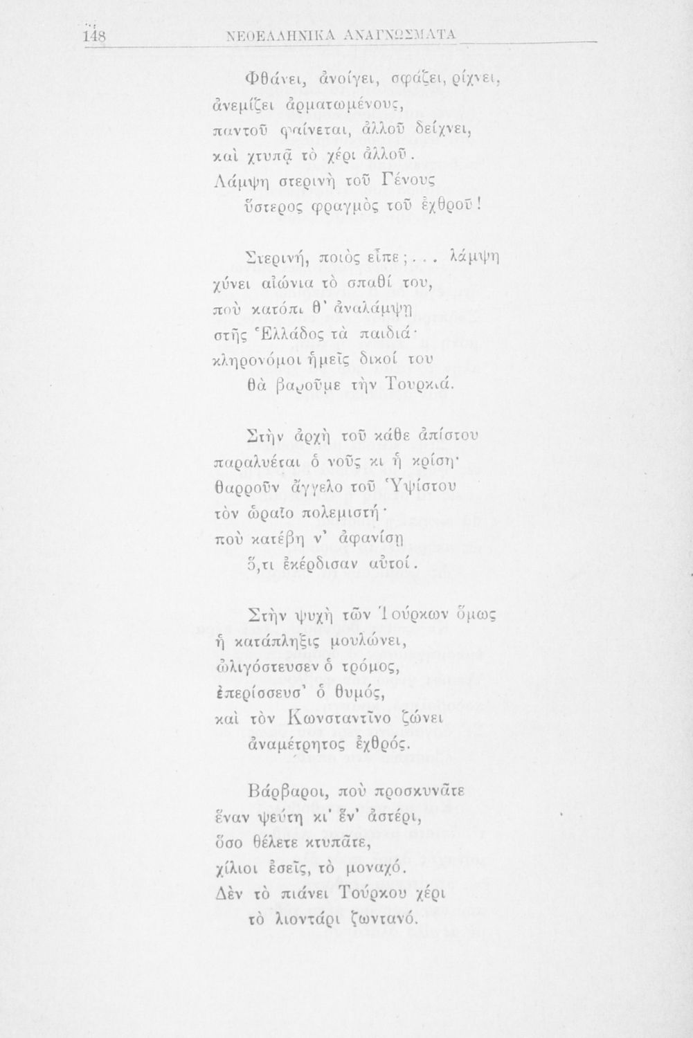 Σχολικό εγχειρίδιο Νέων Ελληνικών Γ' Ελληνικού Σχολείου που περιλαμβάνει ποιήματα και πεζά Ελλήνων συγγραφέων και δημοτικά τραγούδια εμπνευσμένα από την σύγχρονη ελληνική ιστορία, την ελληνική φύση και τη ζωή ...