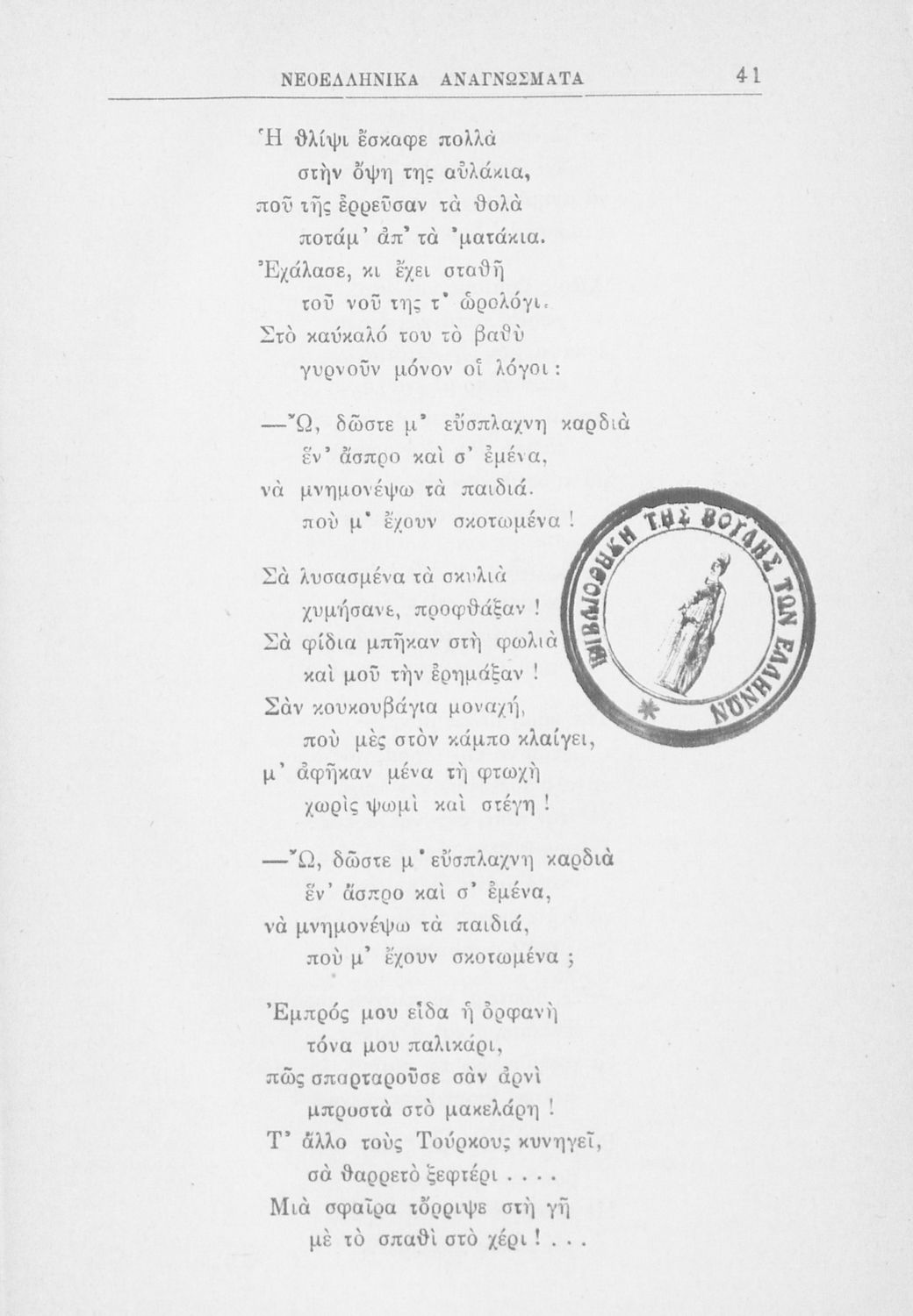 Σχολικό εγχειρίδιο Νέων Ελληνικών Γ' Ελληνικού Σχολείου που περιλαμβάνει ποιήματα και πεζά Ελλήνων συγγραφέων και δημοτικά τραγούδια εμπνευσμένα από την σύγχρονη ελληνική ιστορία, την ελληνική φύση και τη ζωή ...