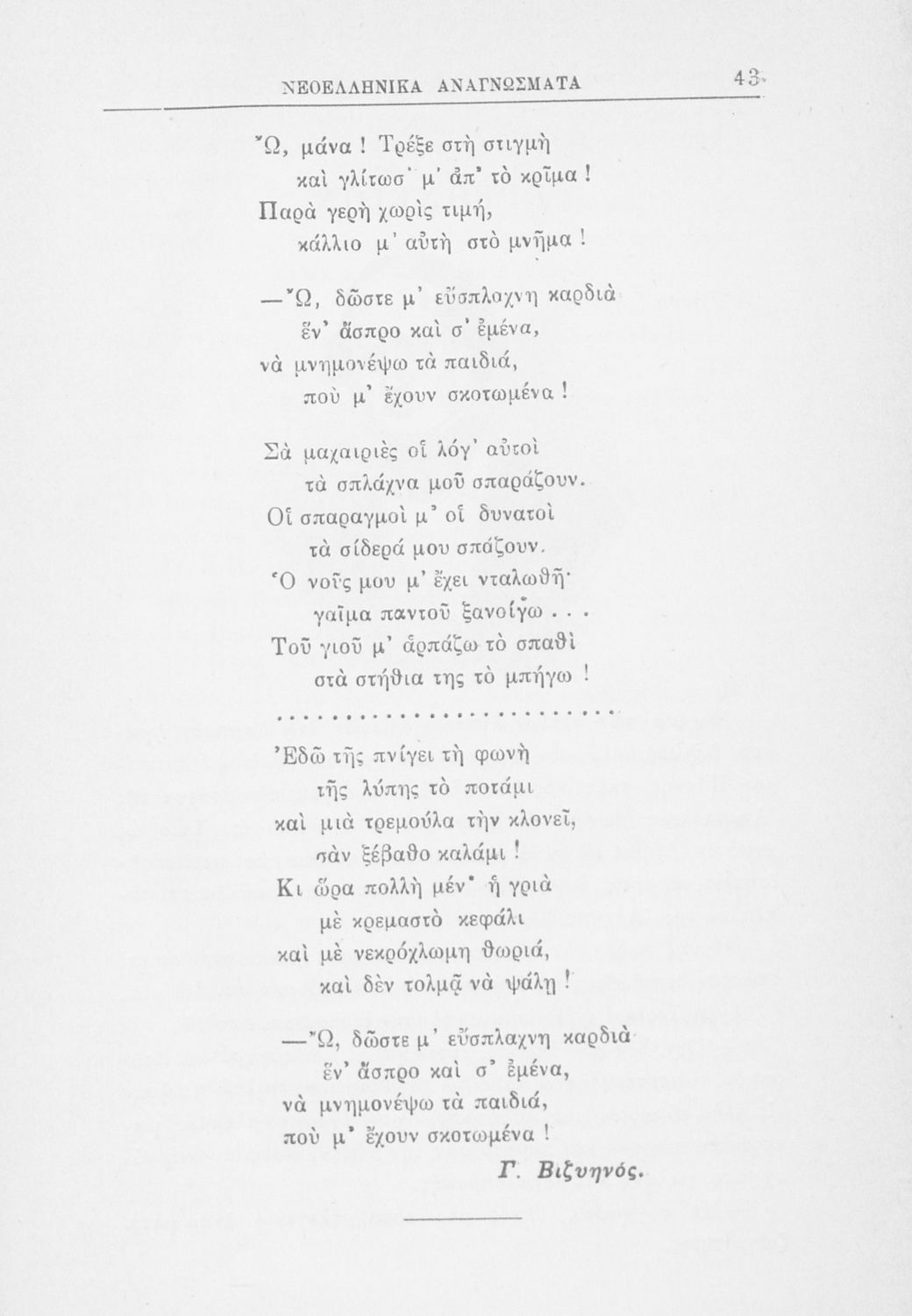Σχολικό εγχειρίδιο Νέων Ελληνικών Γ' Ελληνικού Σχολείου που περιλαμβάνει ποιήματα και πεζά Ελλήνων συγγραφέων εμπνευσμένα από την σύγχρονη ελληνική ιστορία, την ελληνική φύση και τη ζωή στην ύπαιθρο, και τη ...
