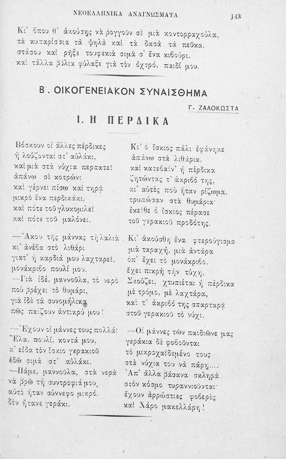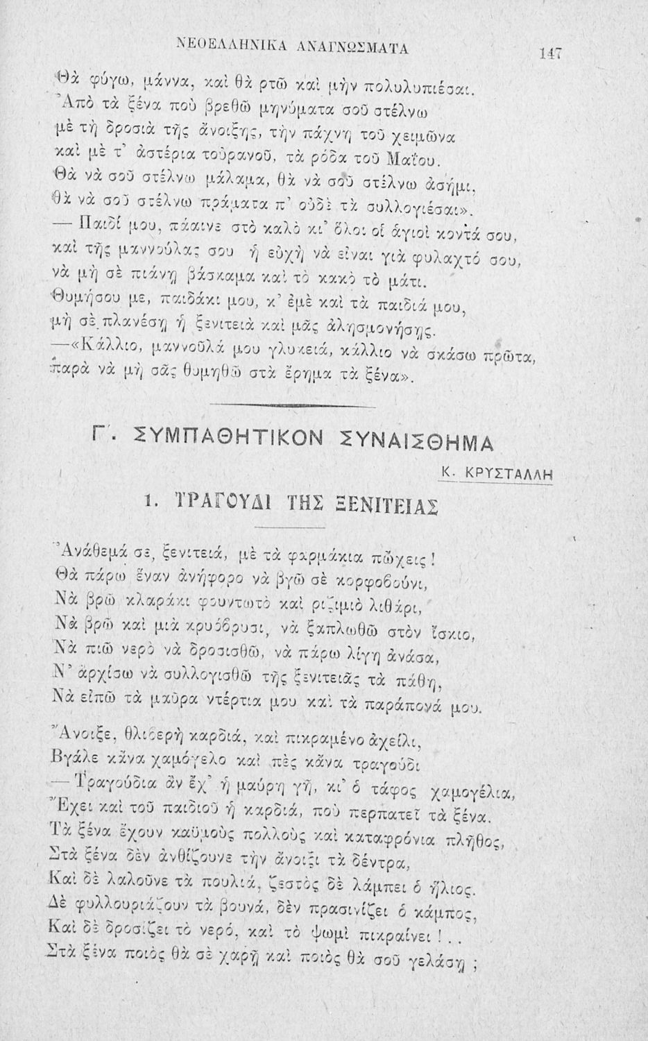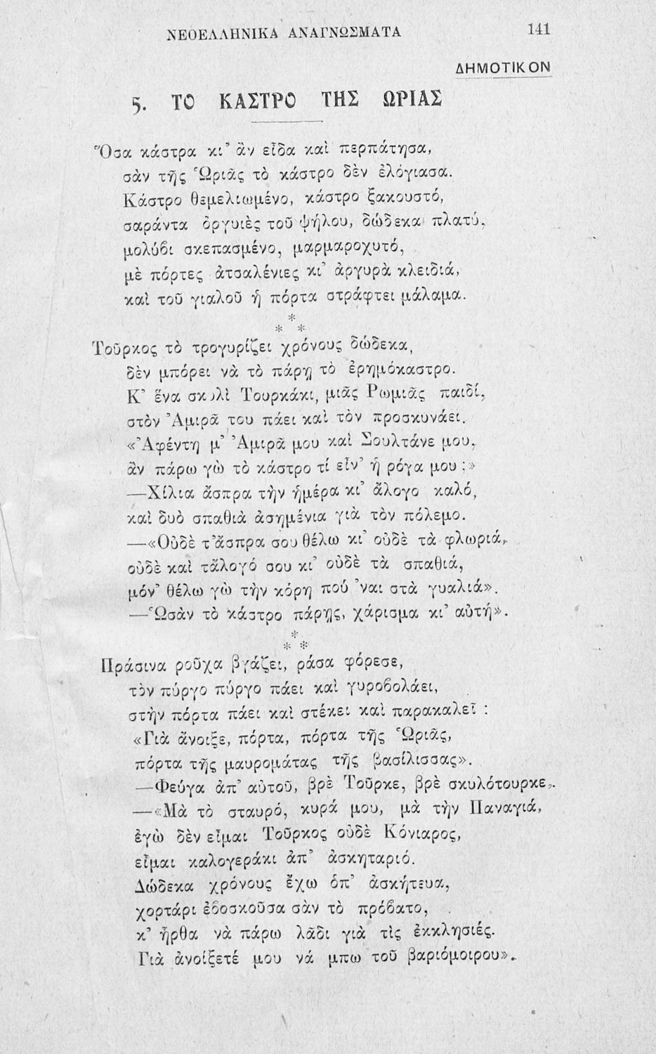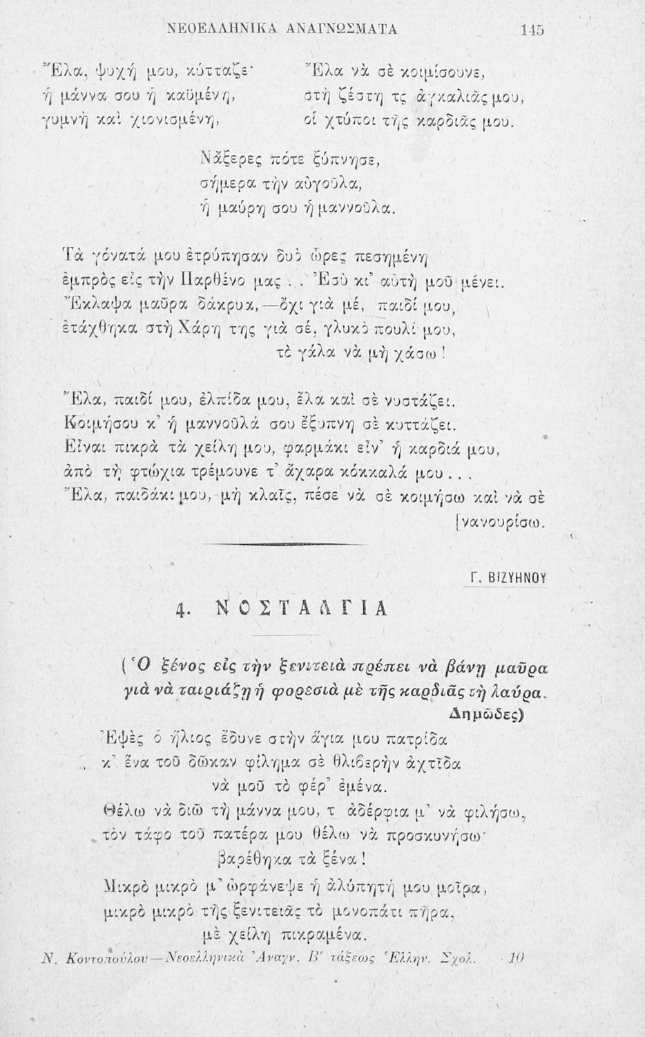 Σχολικό εγχειρίδιο Νέων Ελληνικών Γ' Ελληνικού Σχολείου που περιέχει πεζά και ποιήματα Ελλήνων συγγραφέων και δημοτικά τραγούδια εμπνευσμένα από τη βυζαντινή και σύγχρονη ελληνική ιστορία, και την οικογενειακή