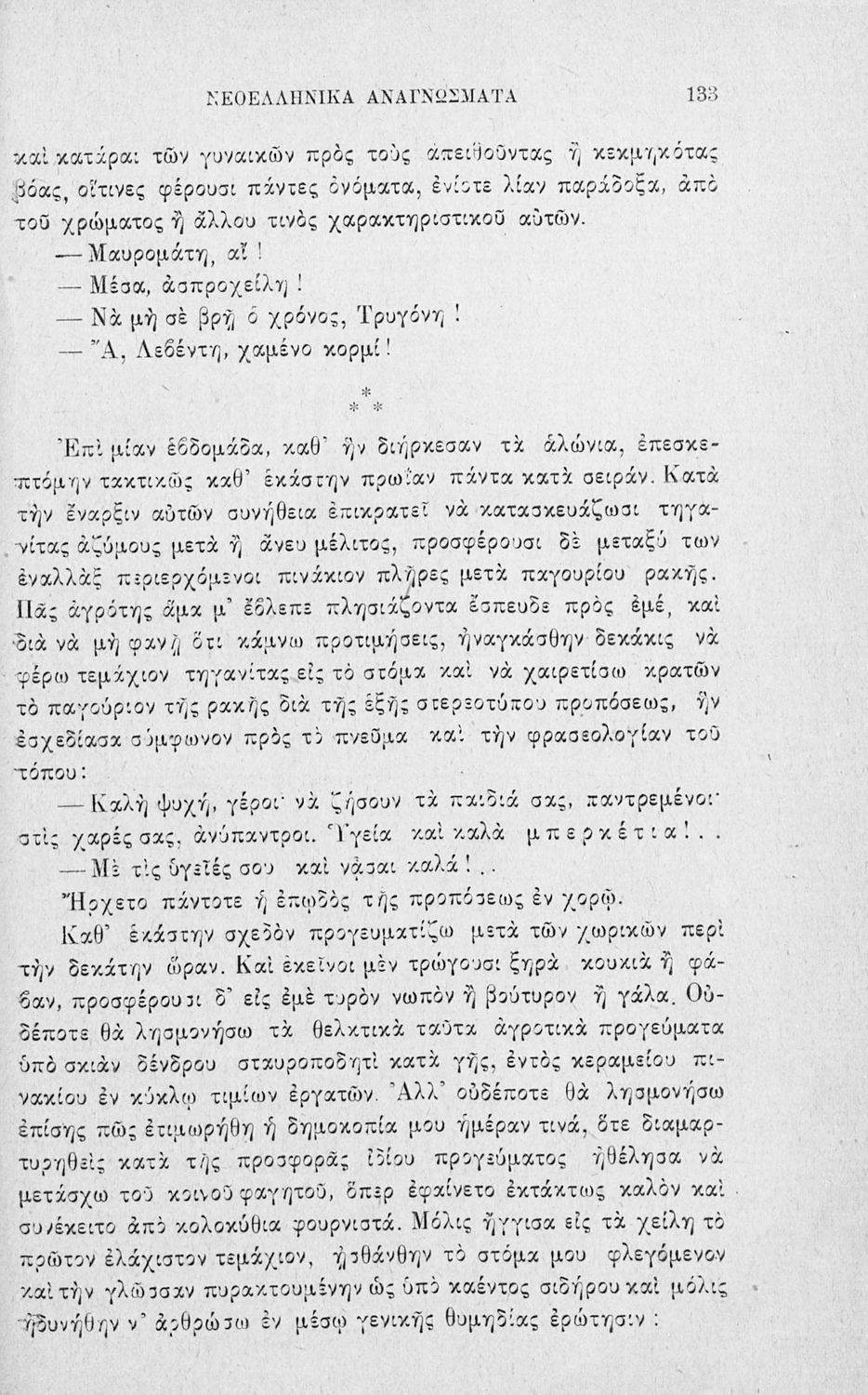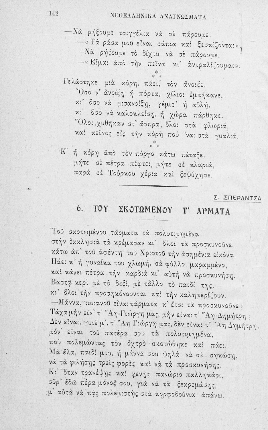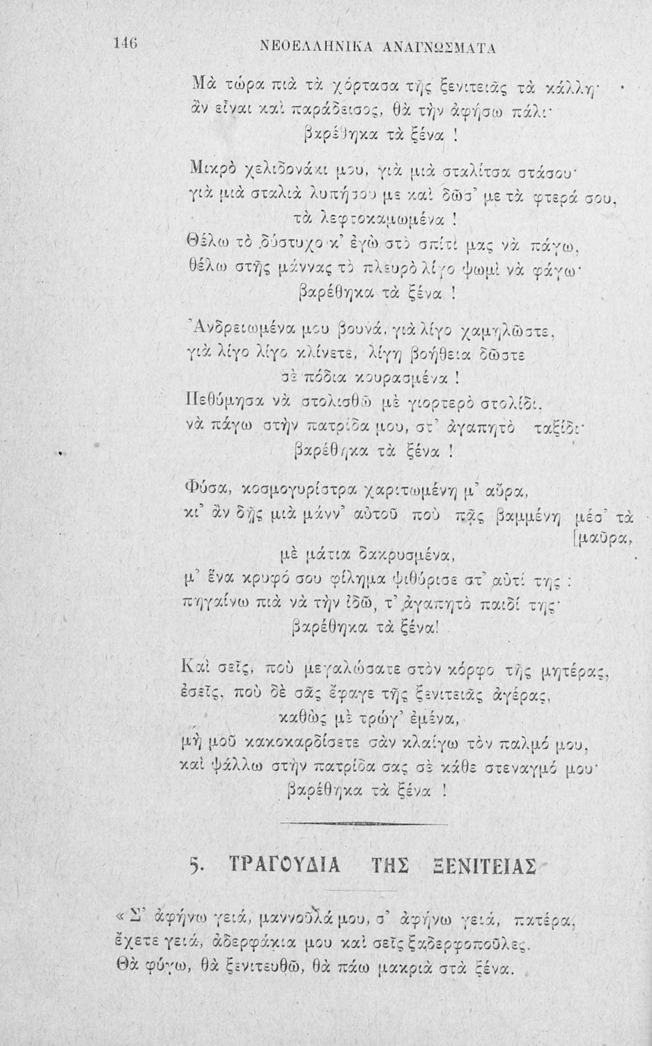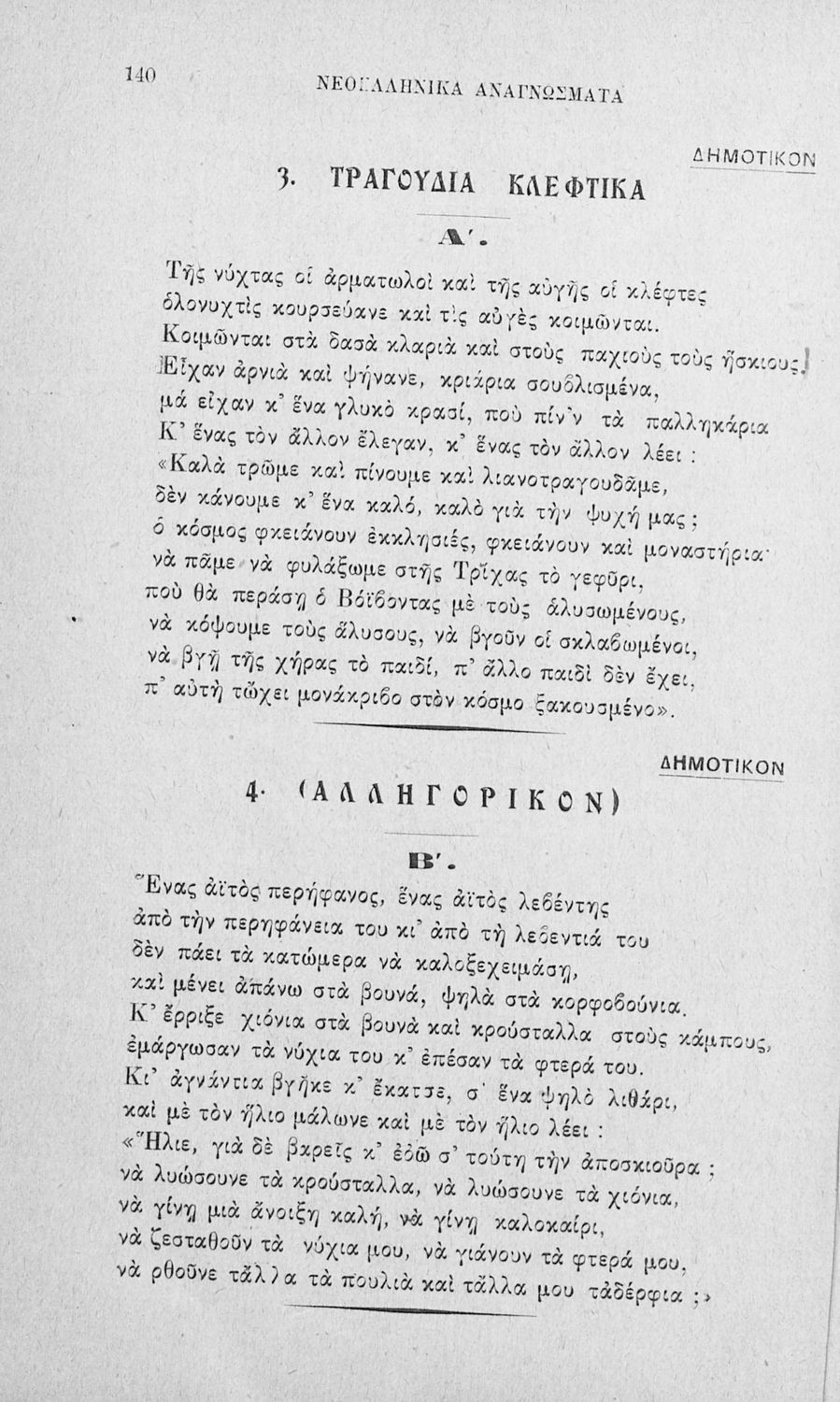 Σχολικό εγχειρίδιο Νέων Ελληνικών Γ' Ελληνικού Σχολείου που περιέχει πεζά και ποιήματα Ελλήνων συγγραφέων και δημοτικά τραγούδια εμπνευσμένα από τη βυζαντινή και σύγχρονη ελληνική ιστορία, και την οικογενειακή