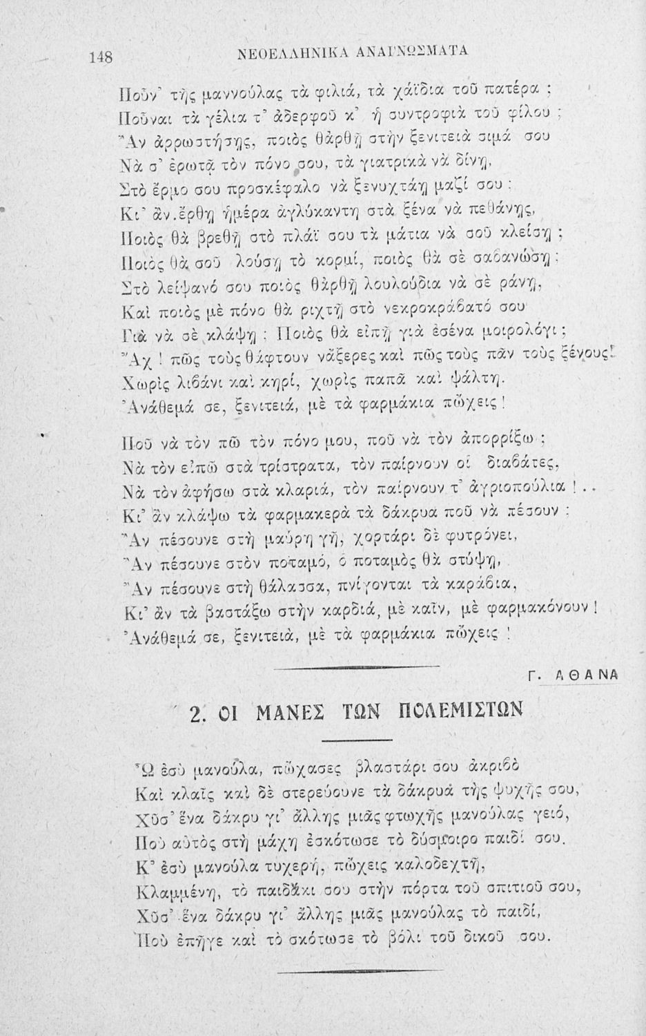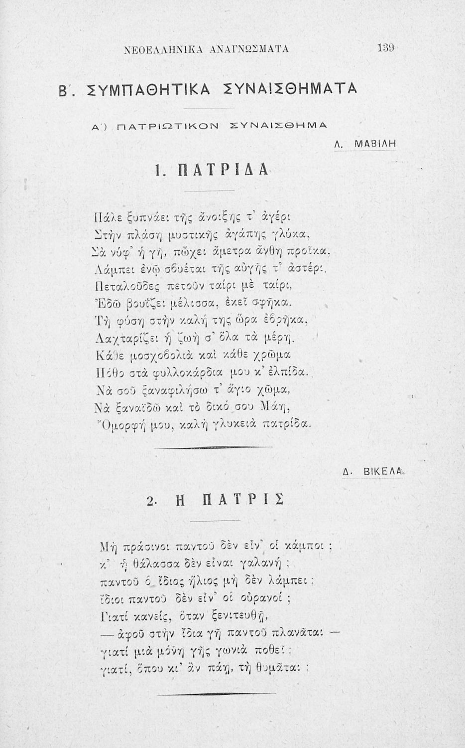 Σχολικό εγχειρίδιο Νέων Ελληνικών Β' Ελληνικού Σχολείου που περιέχει πεζά και ποιήματα Ελλήνων συγγραφέων και δημοτικά τραγούδια εμπνευσμένα από την σύγχρονη ελληνική ιστορία, τη βυζαντινή ιστορία, την οικογενειακή και θρησκευτική ζωή και τη φύση. Περιέχει και παράρτημα με βιογραφίες των συγγραφέων και λεξιλόγιο.