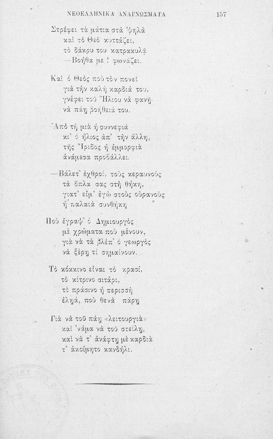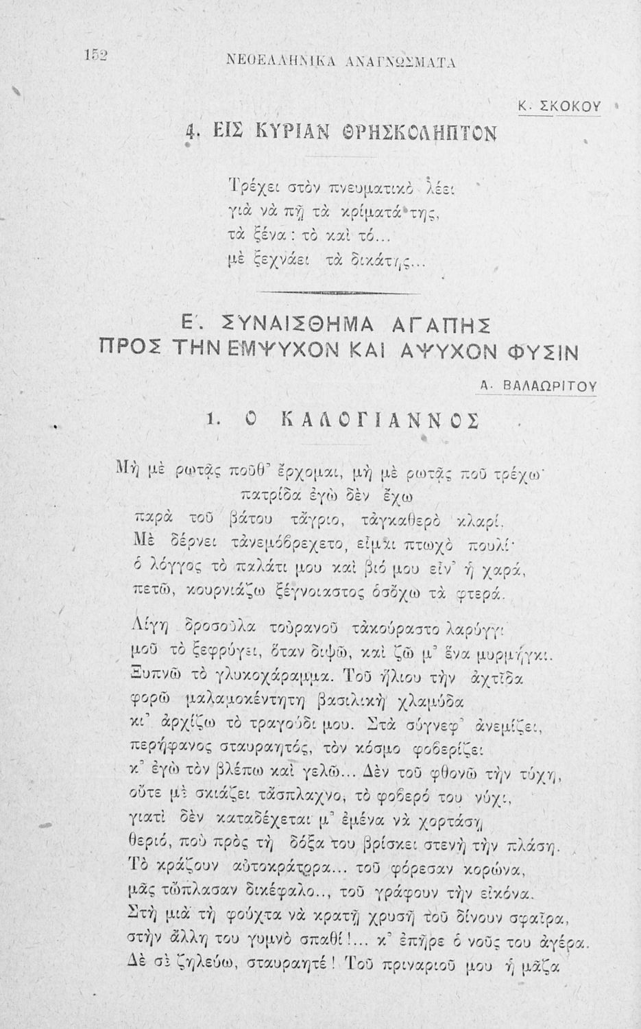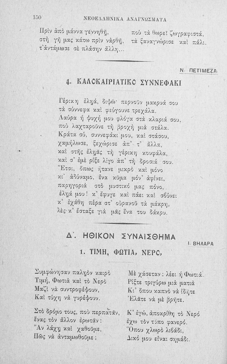 Σχολικό εγχειρίδιο Νέων Ελληνικών Β' Ελληνικού Σχολείου που περιλαμβάνει ποιήματα και πεζά Ελλήνων συγγραφέων και δημοτικά τραγούδια εμπνευσμένα από την σύγχρονη ελληνική ιστορία, την ελληνική φύση και τη ζωή ...