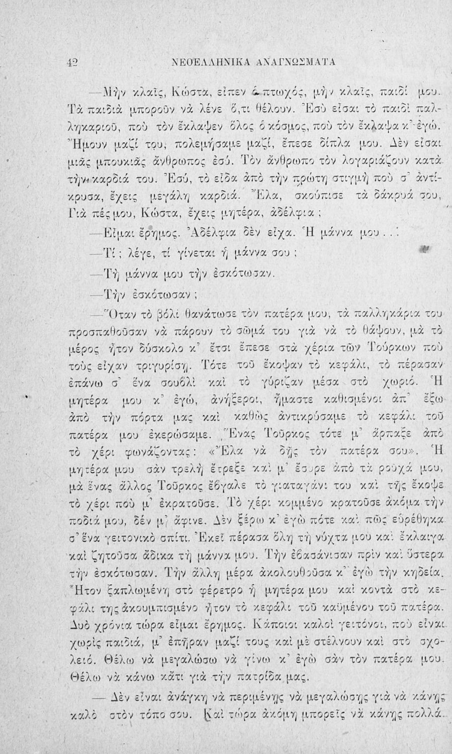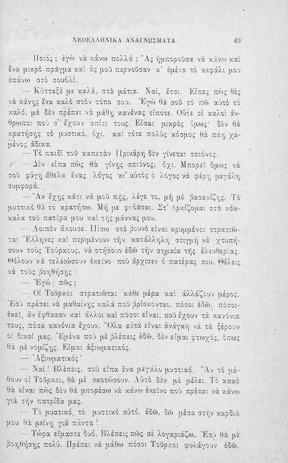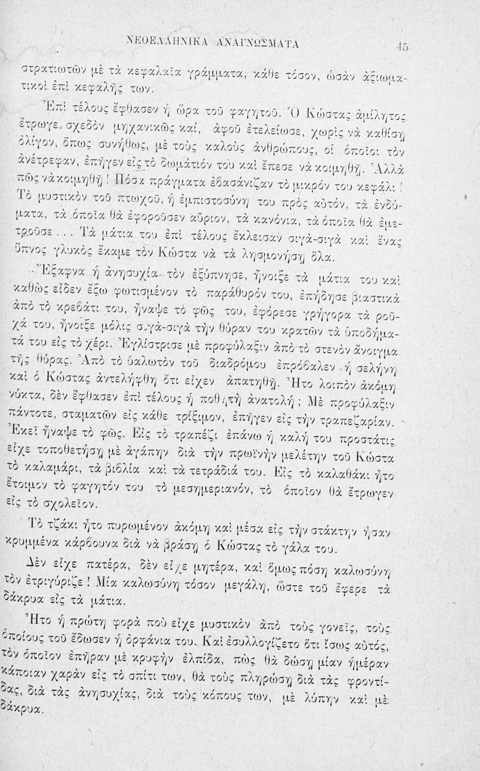 Σχολικό εγχειρίδιο Νέων Ελληνικών Γ' Ελληνικού Σχολείου που περιέχει πεζά και ποιήματα Ελλήνων συγγραφέων και δημοτικά τραγούδια εμπνευσμένα από τη βυζαντινή και σύγχρονη ελληνική ιστορία, και την οικογενειακή