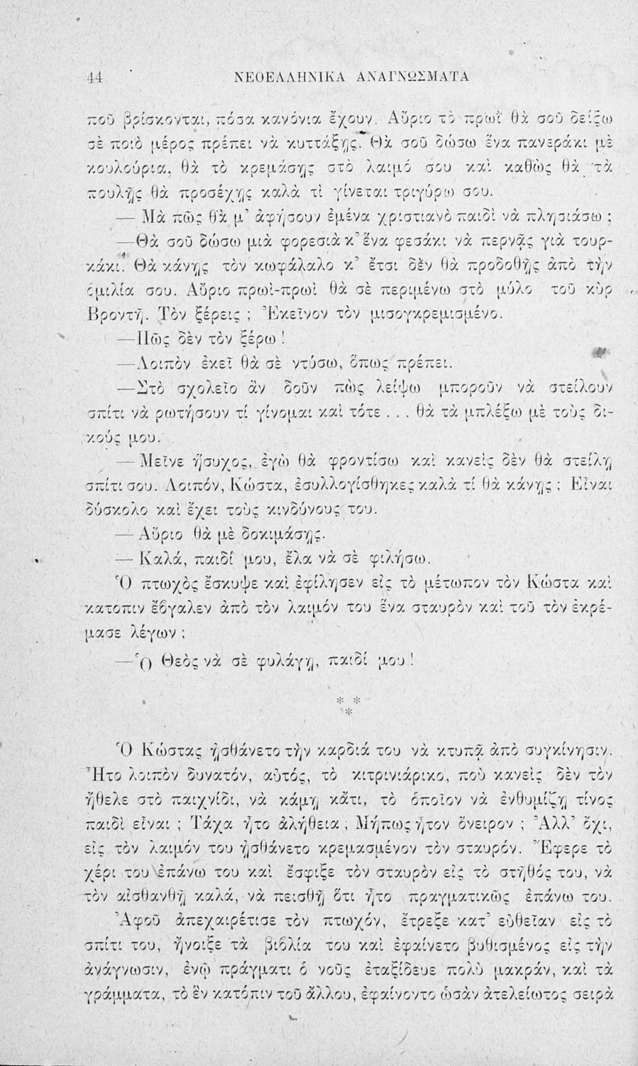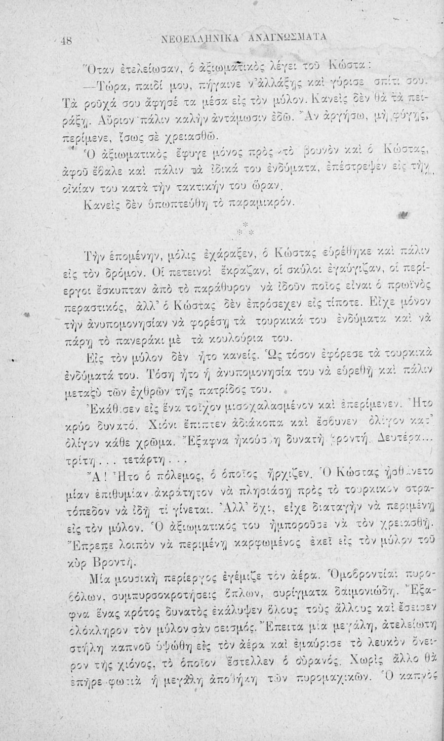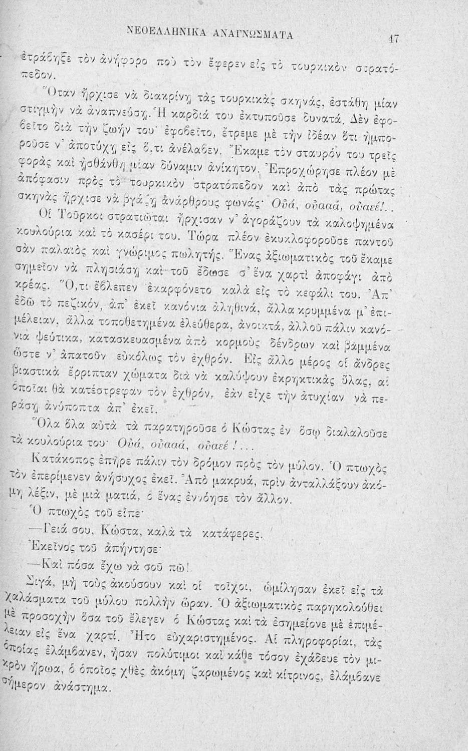Σχολικό εγχειρίδιο Νέων Ελληνικών Γ' Ελληνικού Σχολείου που περιέχει πεζά και ποιήματα Ελλήνων συγγραφέων και δημοτικά τραγούδια εμπνευσμένα από τη βυζαντινή και σύγχρονη ελληνική ιστορία, και την οικογενειακή