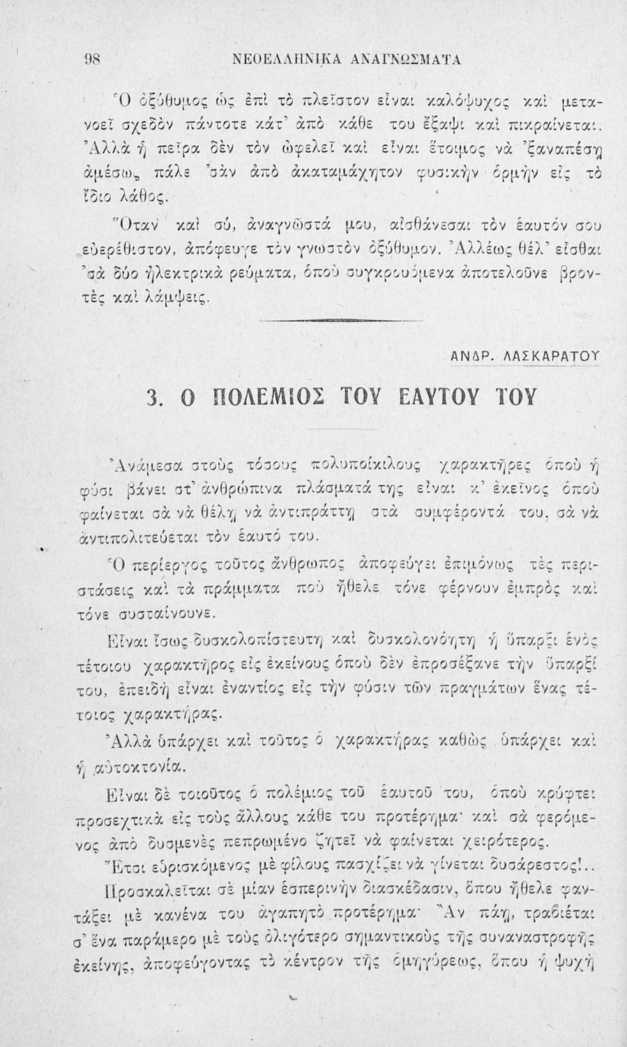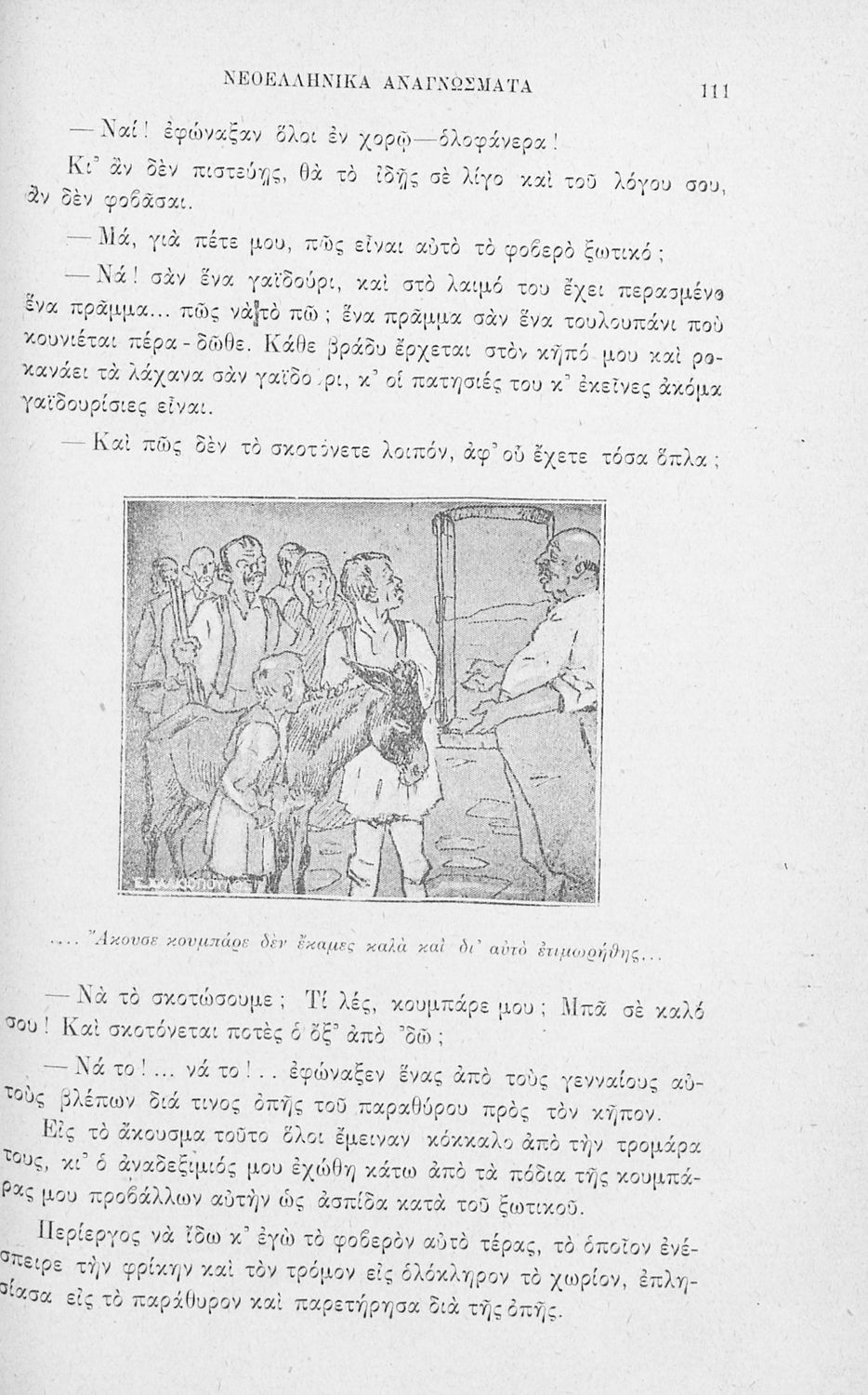 Σχολικό εγχειρίδιο Νέων Ελληνικών Γ' Ελληνικού Σχολείου που περιέχει πεζά και ποιήματα Ελλήνων συγγραφέων και δημοτικά τραγούδια εμπνευσμένα από τη βυζαντινή και σύγχρονη ελληνική ιστορία, και την οικογενειακή