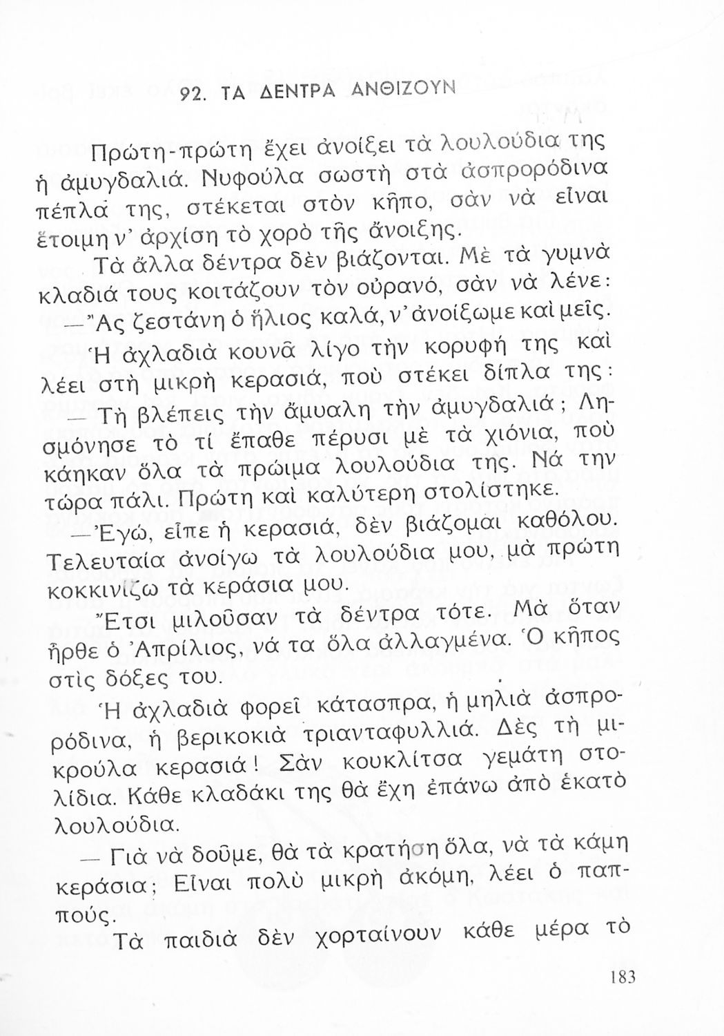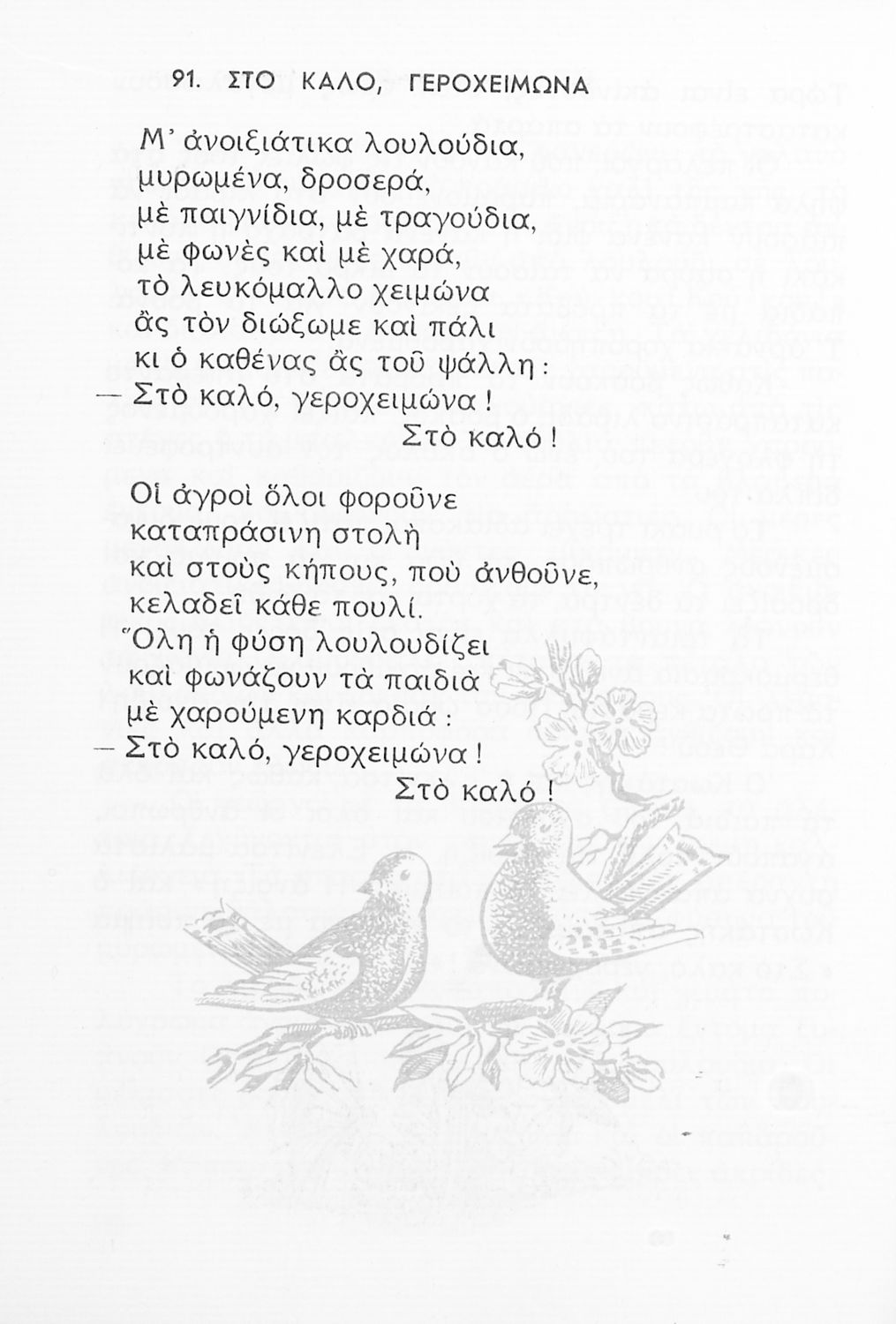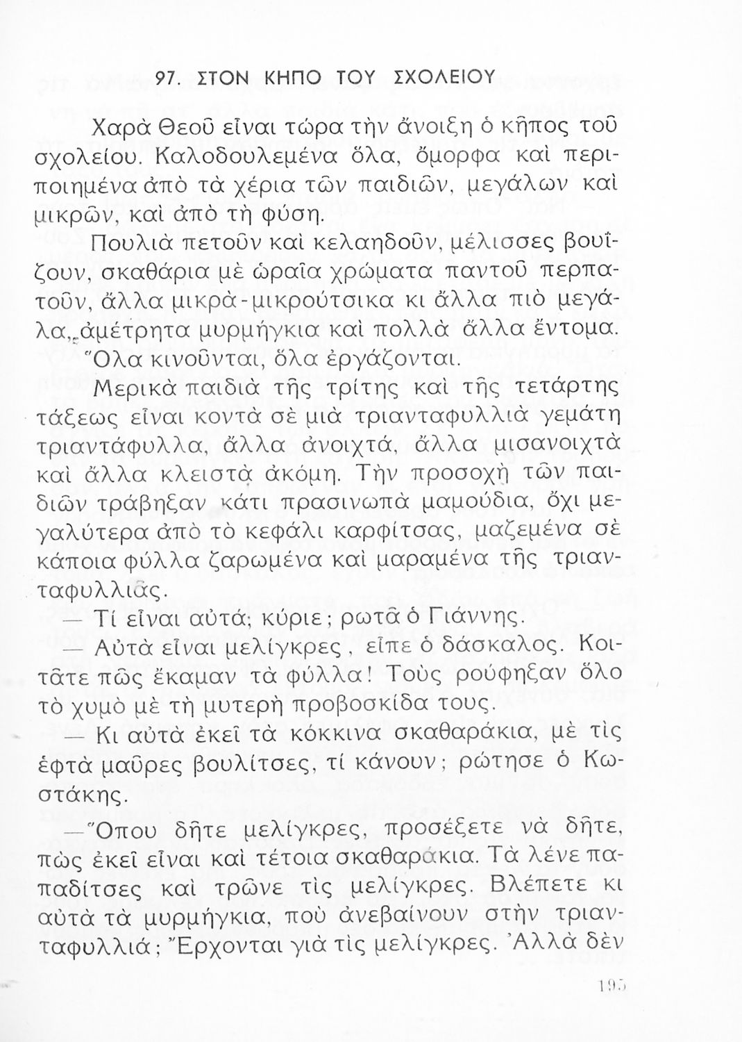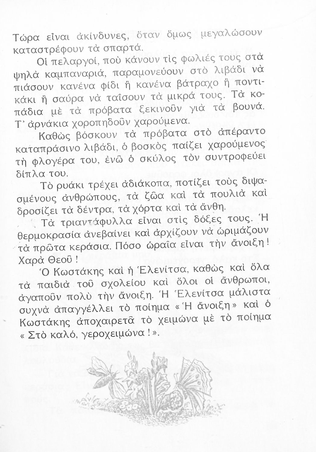 Αναγνωστικό Γ' Δημοτικού που είναι χωρισμένο σύμφωνα με τις εποχές του χρόνου και περιλαμβάνει ποιήματα και πεζά εμπνευσμένα από τη ζωή στην ύπαιθρο, την εθνική, οικογενειακή και κοινωνική ζωή, τη θρησκευτική παράδοση, τις ασχολίες των ανθρώπων, και την ελληνική φύση.