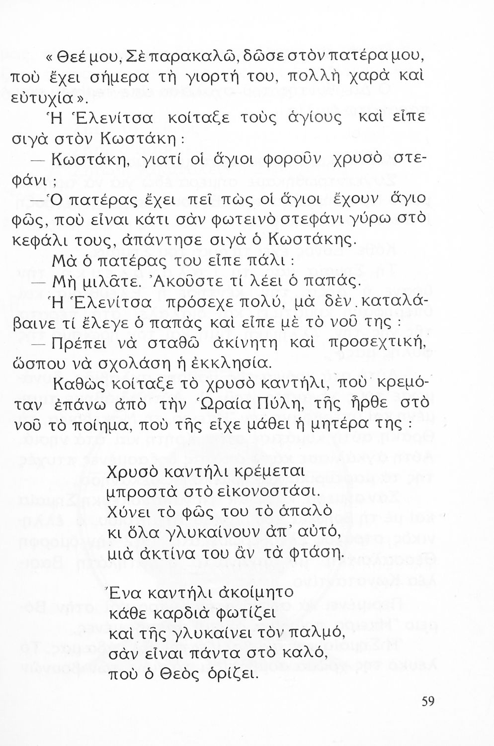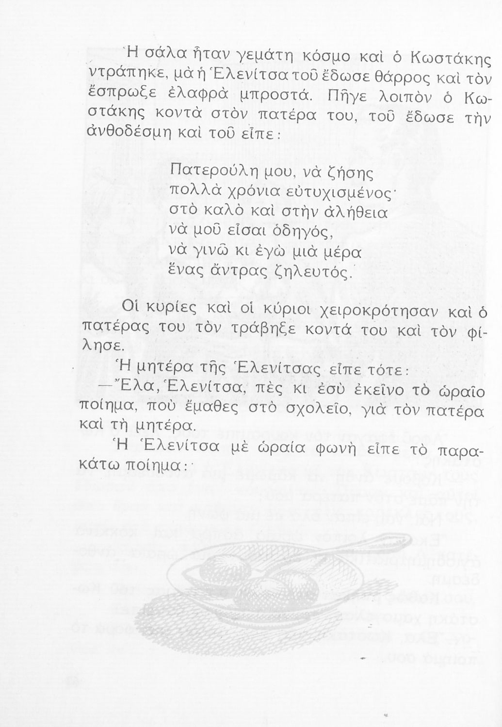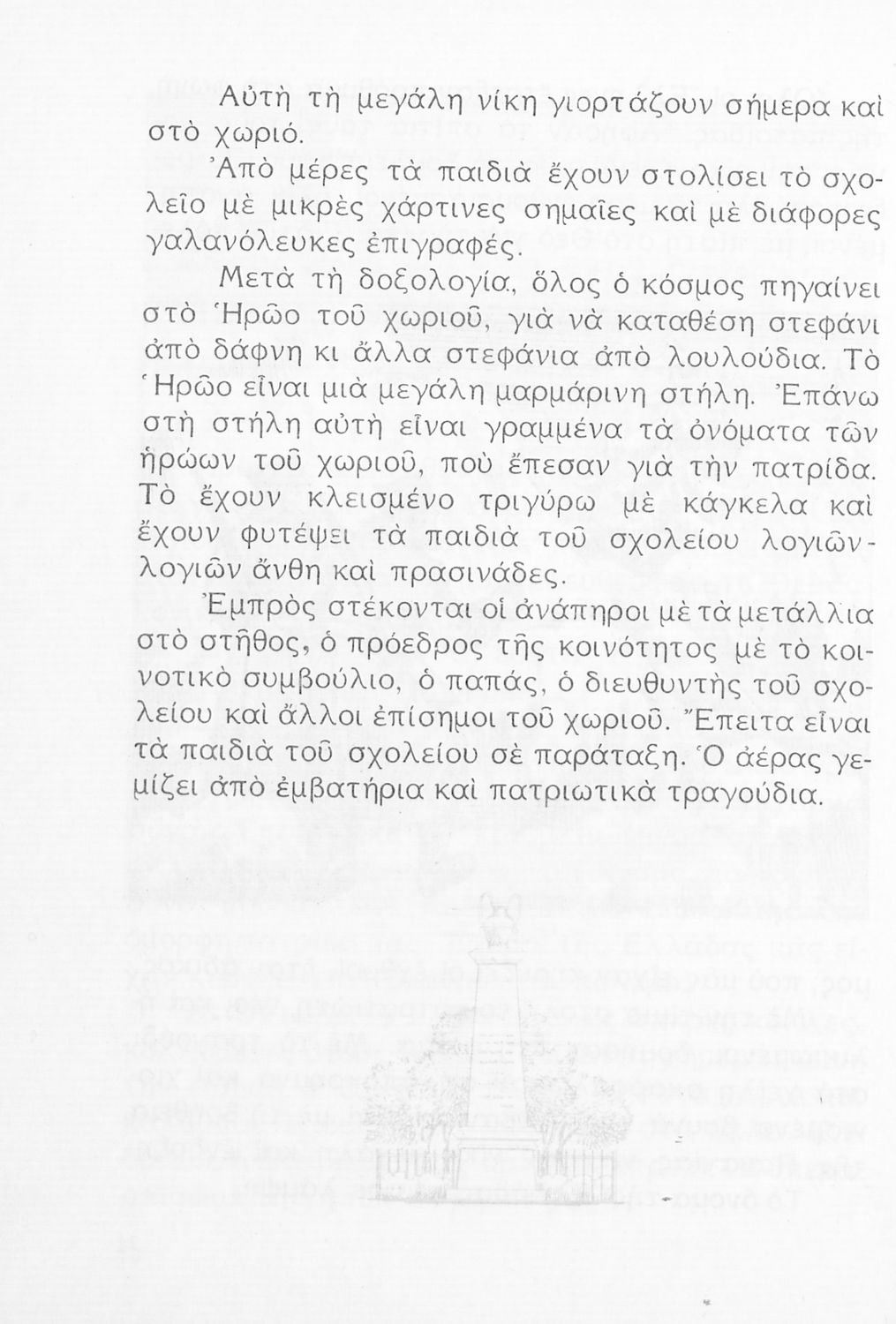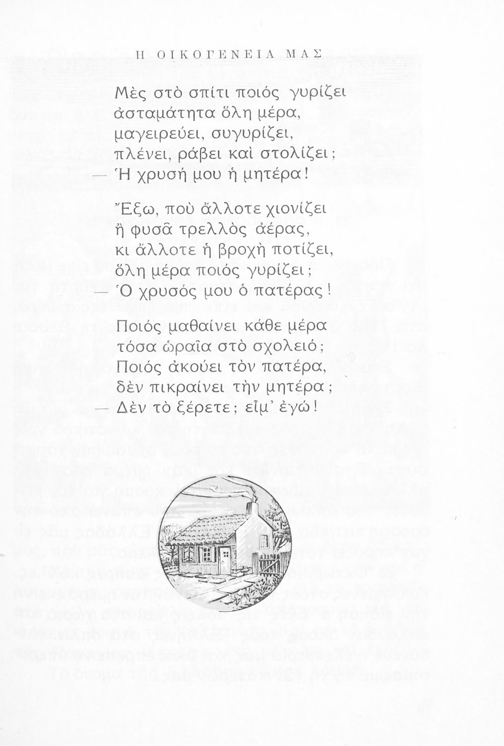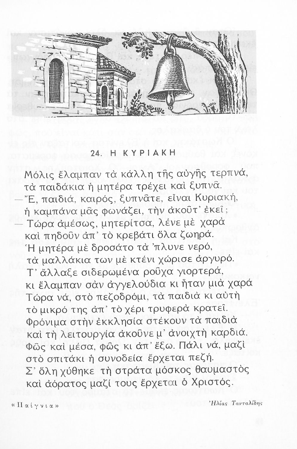 520 ## _aΑναγνωστικό Γ' Δημοτικού που είναι χωρισμένο σύμφωνα με τις εποχές του χρόνου και περιλαμβάνει ποιήματα και πεζά εμπνευσμένα από τη ζωή στην ύπαιθρο, την εθνική, οικογενειακή και κοινωνική ζωή, τη θρησκευτική παράδοση, τις ασχολίες των ανθρώπων, και την ελληνική φύση.