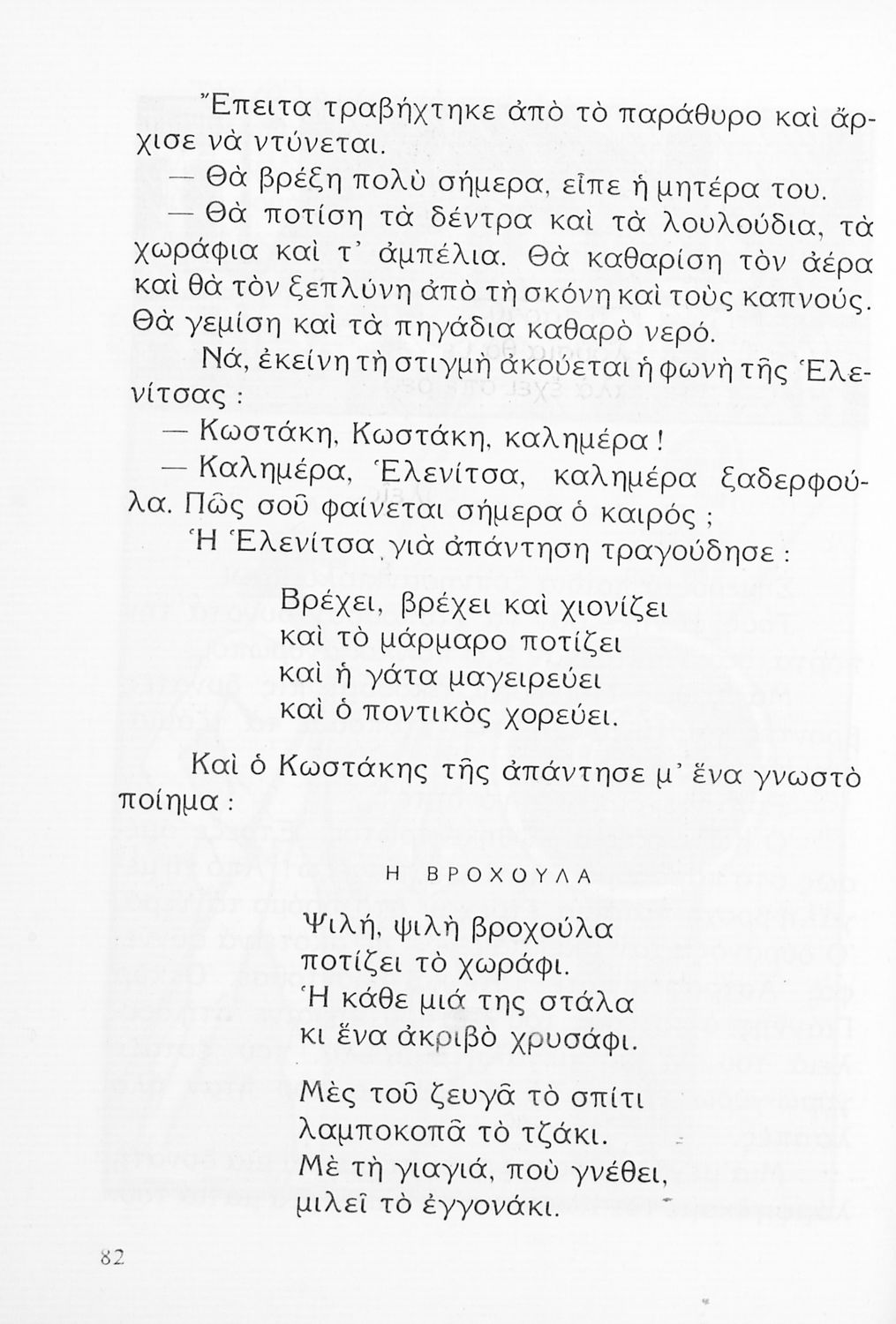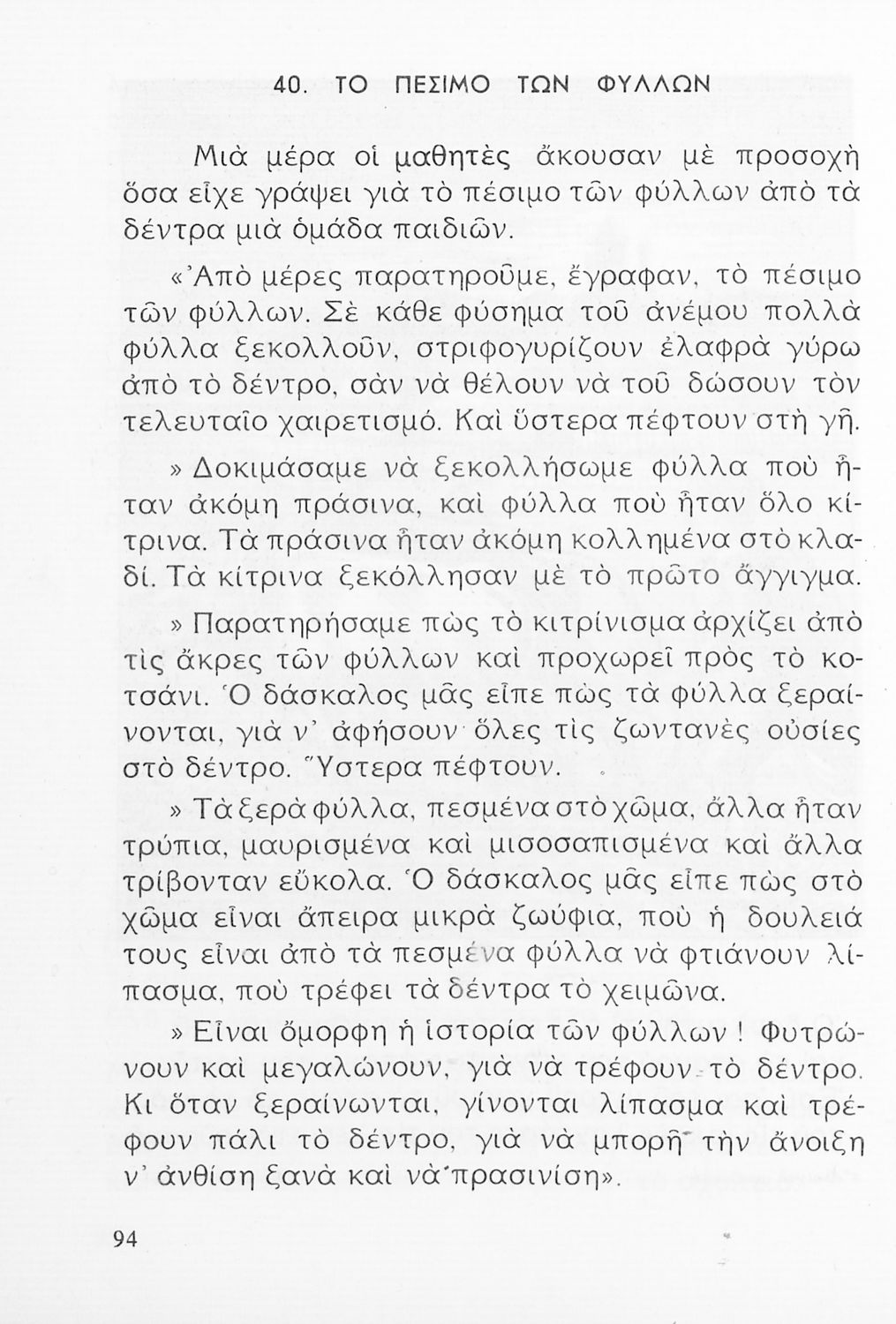 Αναγνωστικό Γ' Δημοτικού που είναι χωρισμένο σύμφωνα με τις εποχές του χρόνου και περιλαμβάνει ποιήματα και πεζά εμπνευσμένα από τη ζωή στην ύπαιθρο, την εθνική, οικογενειακή και κοινωνική ζωή, τη θρησκευτική παράδοση, τις ασχολίες των ανθρώπων, και την ελληνική φύση.