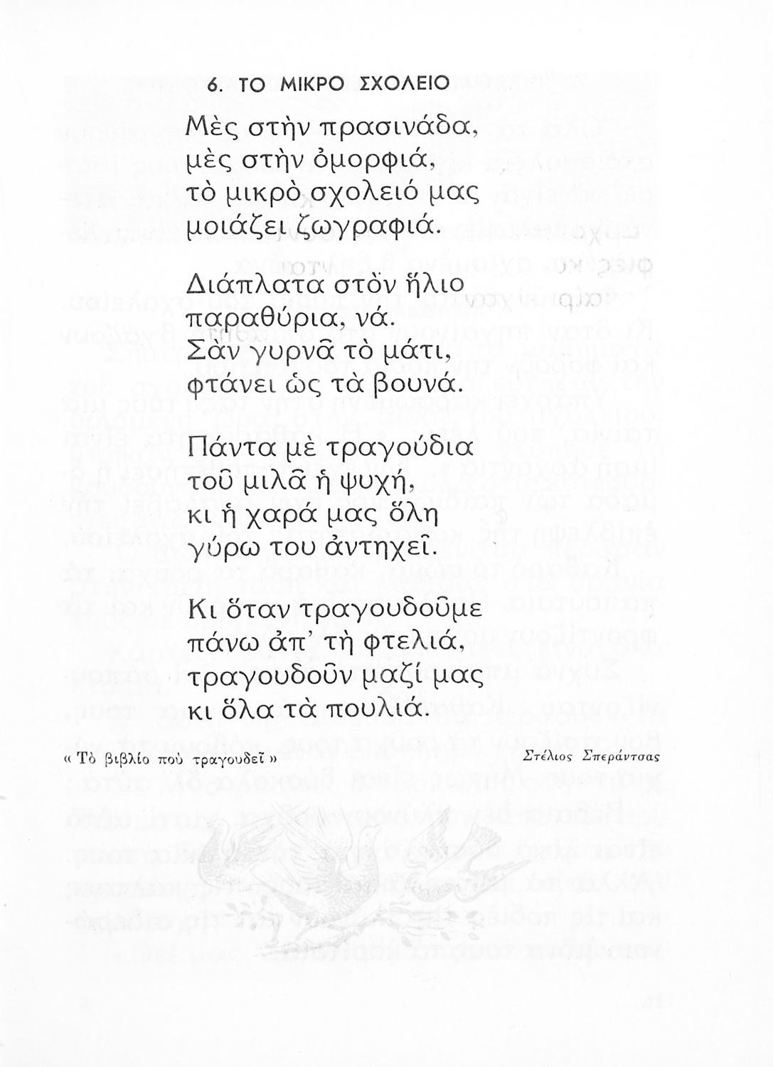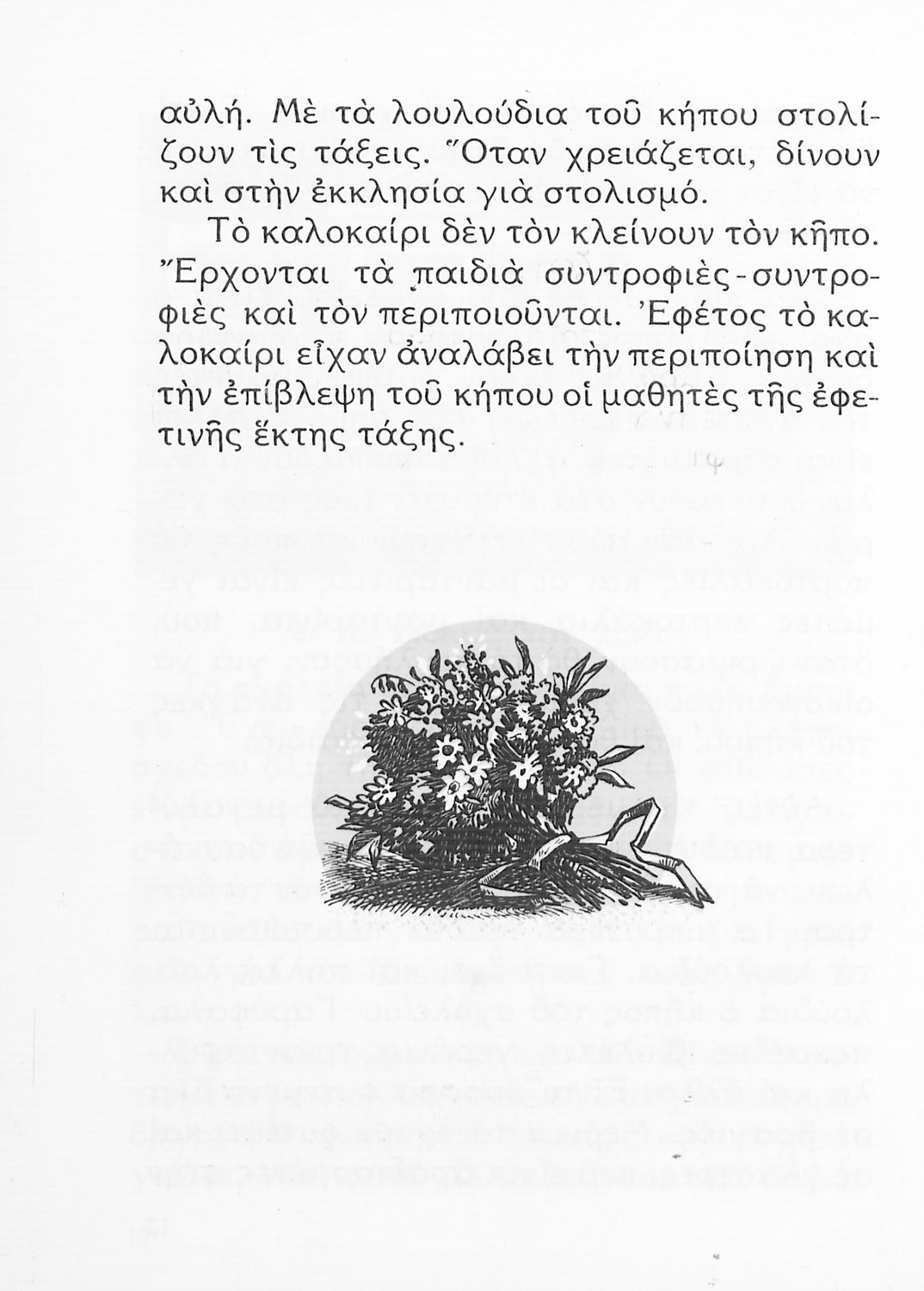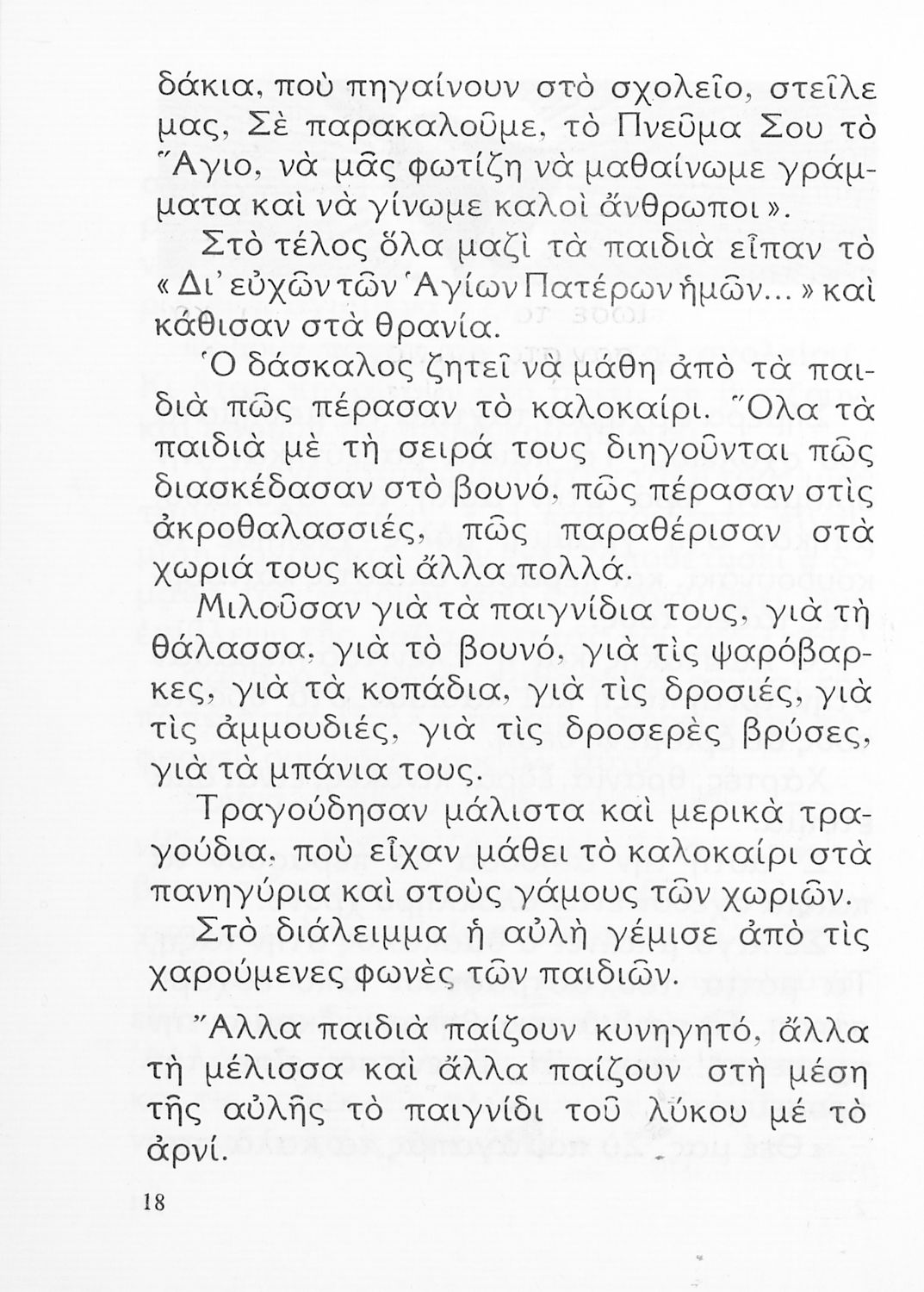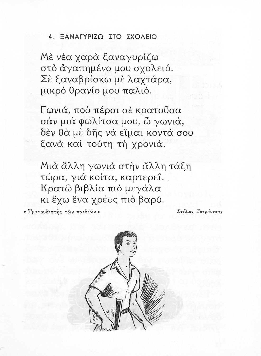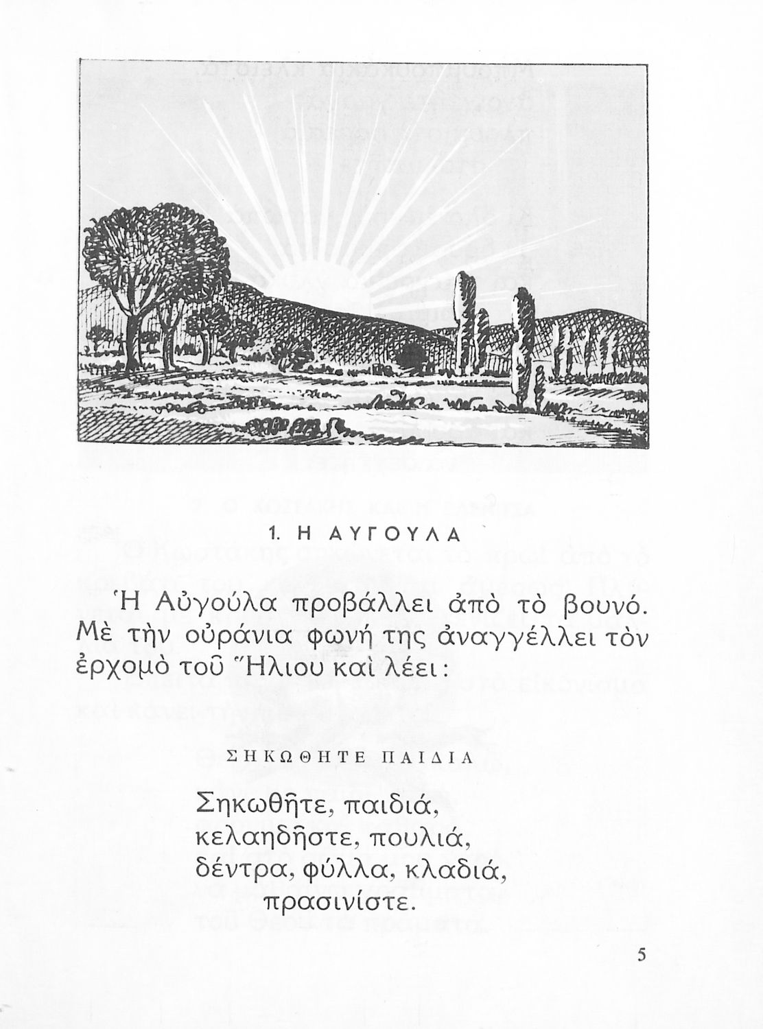Αναγνωστικό Γ' Δημοτικού που είναι χωρισμένο σύμφωνα με τις εποχές του χρόνου και περιλαμβάνει ποιήματα και πεζά εμπνευσμένα από τη ζωή στην ύπαιθρο, την εθνική, οικογενειακή και κοινωνική ζωή, τη θρησκευτική παράδοση, τις ασχολίες των ανθρώπων, και την ελληνική φύση.