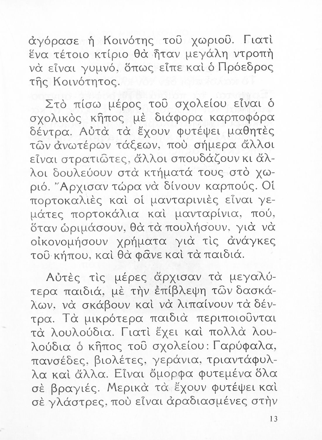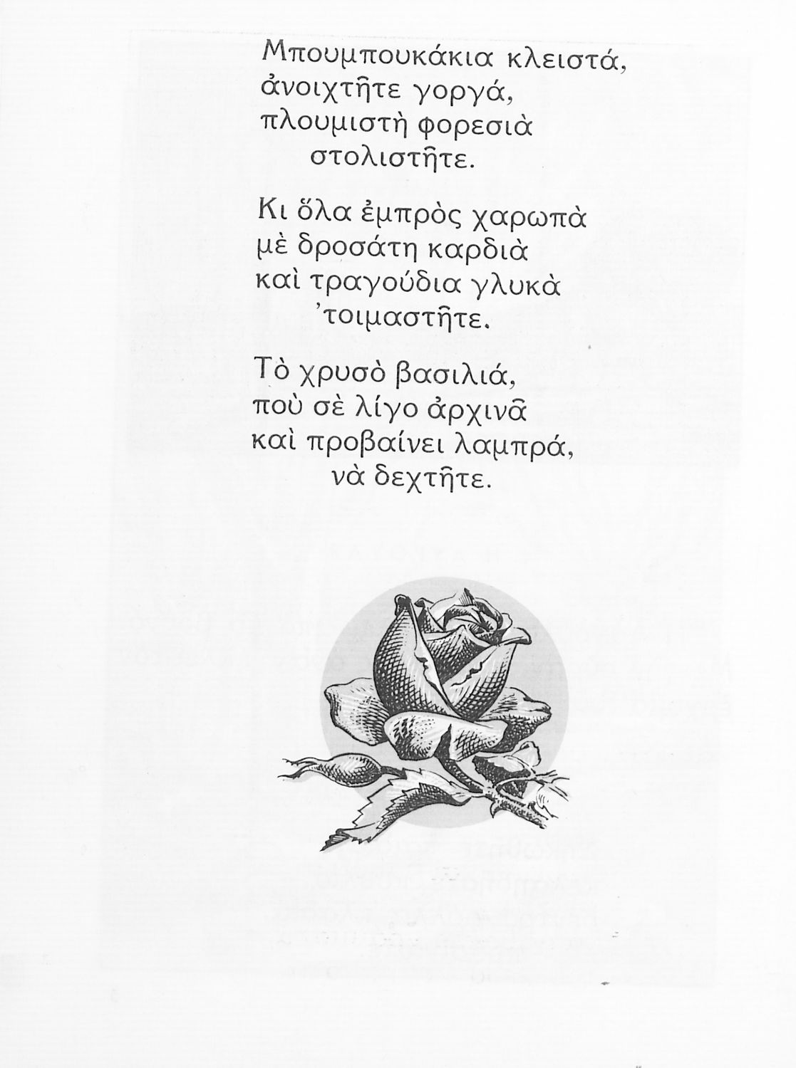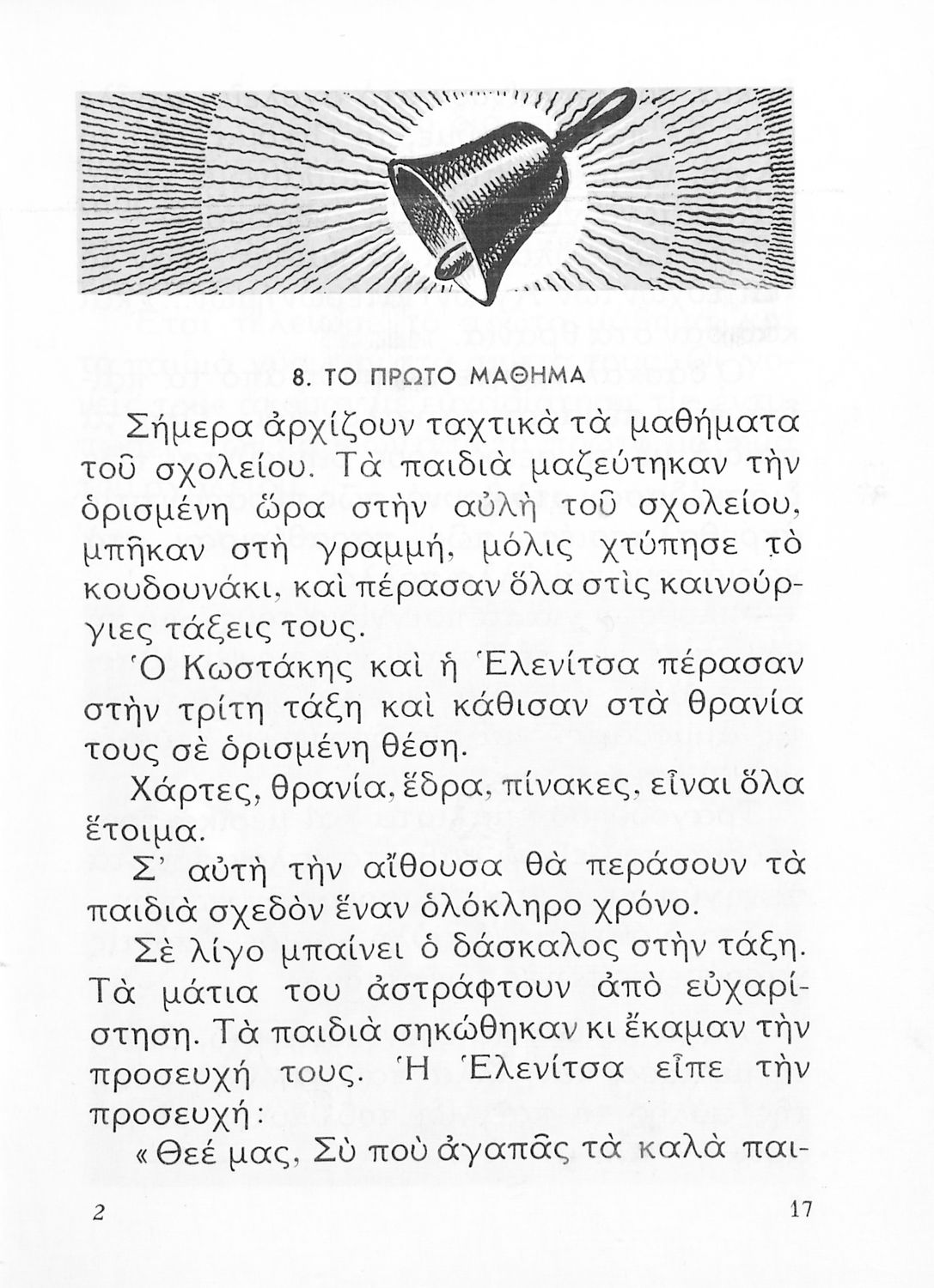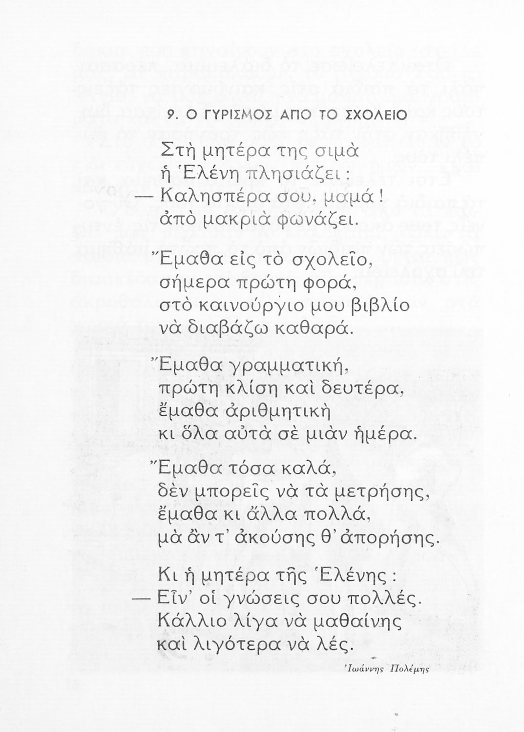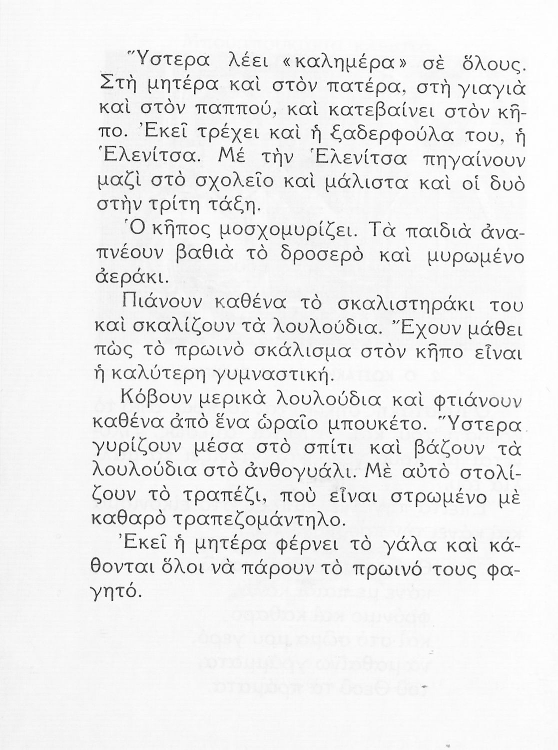 Αναγνωστικό Γ' Δημοτικού που είναι χωρισμένο σύμφωνα με τις εποχές του χρόνου και περιλαμβάνει ποιήματα και πεζά εμπνευσμένα από τη ζωή στην ύπαιθρο, την εθνική, οικογενειακή και κοινωνική ζωή, τη θρησκευτική παράδοση, τις ασχολίες των ανθρώπων, και την ελληνική φύση.