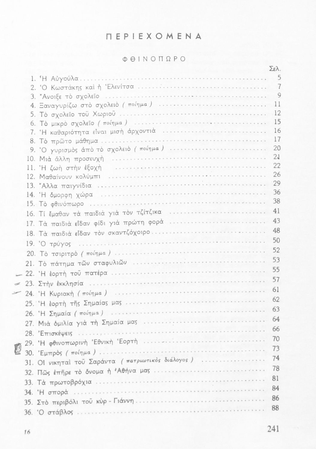 Αναγνωστικό Γ' Δημοτικού που είναι χωρισμένο σύμφωνα με τις εποχές του χρόνου και περιλαμβάνει κείμενα εμπνευσμένα από τη θρησκευτική, εθνική, κοινωνική και οικογενειακή ζωή, την ελληνική φύση, ιστορία και μυθολογία και την υγιεινή.