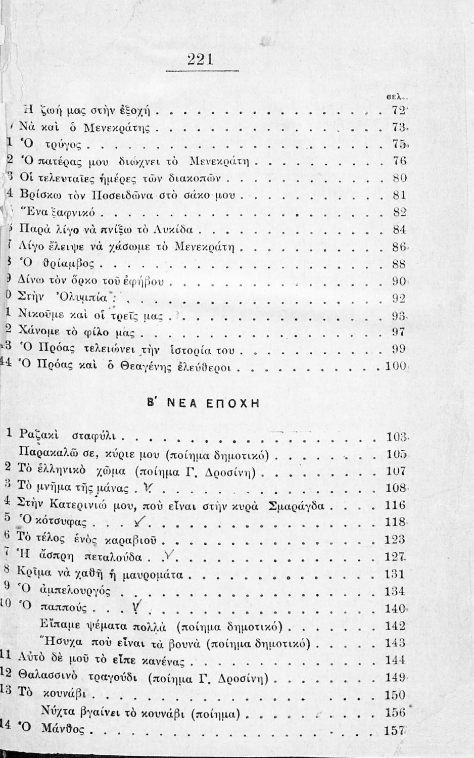 Αναγνωστικό Δ΄ Δημοτικού που περιλαμβάνει ποιήματα και πεζά εμπνευσμένα από την καθημερινότητα της ελληνικής ζωής, τη ζωή στην ύπαιθρο, την εθνική και κοινωνική ζωή, την αρχαία ελληνική ιστορία, και τα ζώα και