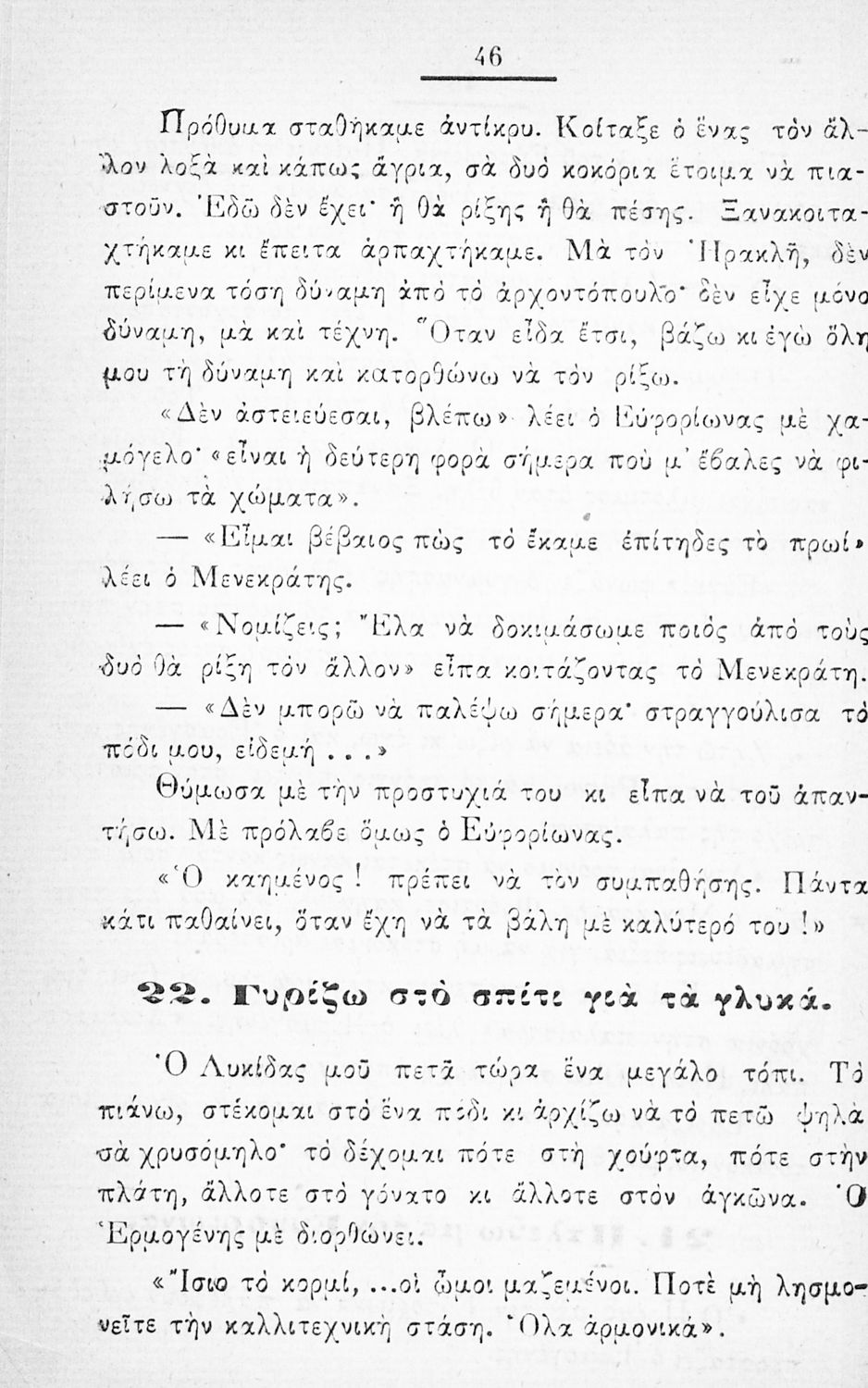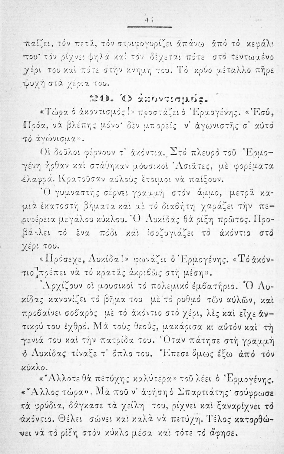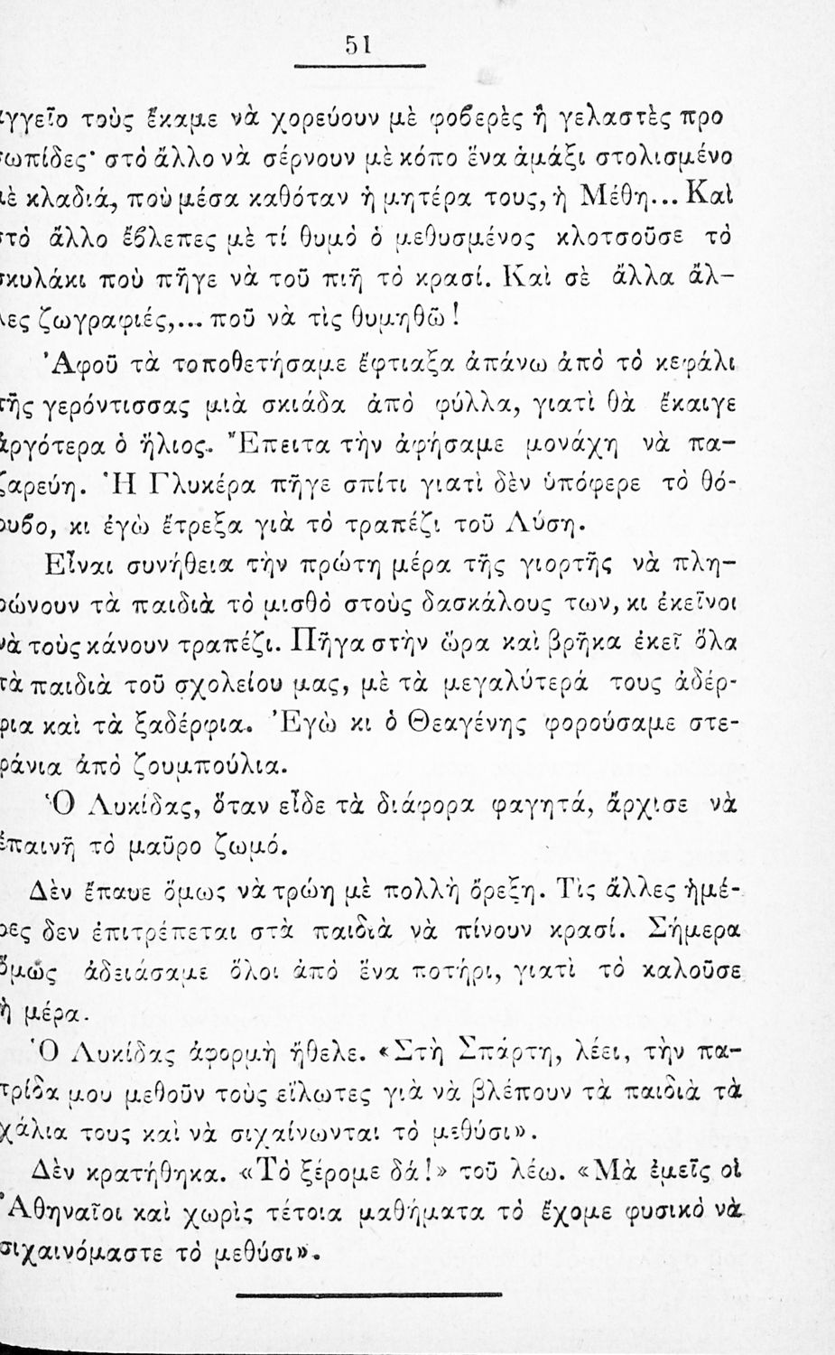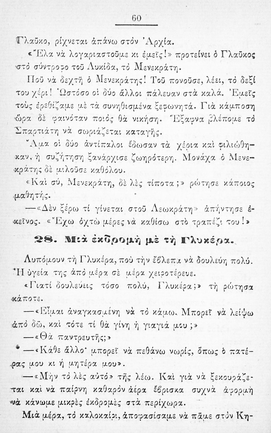 Αναγνωστικό Δ΄ Δημοτικού που περιέχει πεζά και ποιήματα με περιεχόμενο διδακτικό και ηθικοπλαστικό εμπνευσμένα από την ελληνική ιστορία και μυθολογία, και την αγροτική και κοινωνική ζωή.