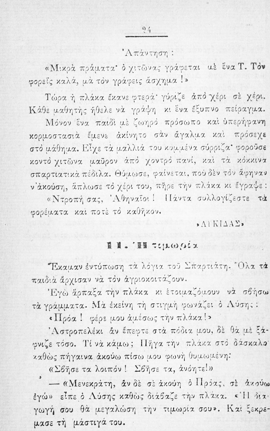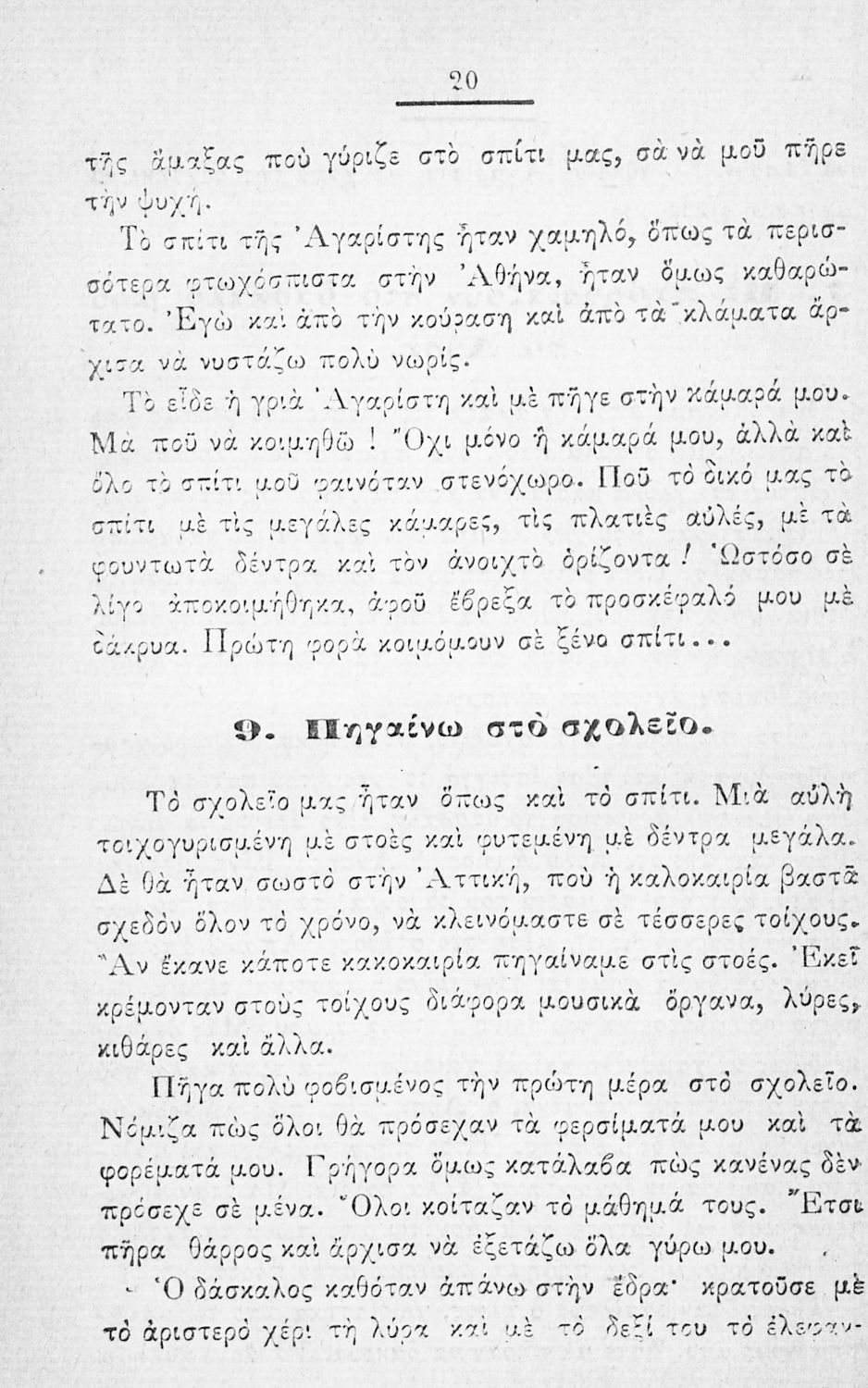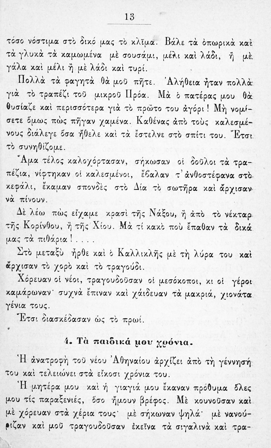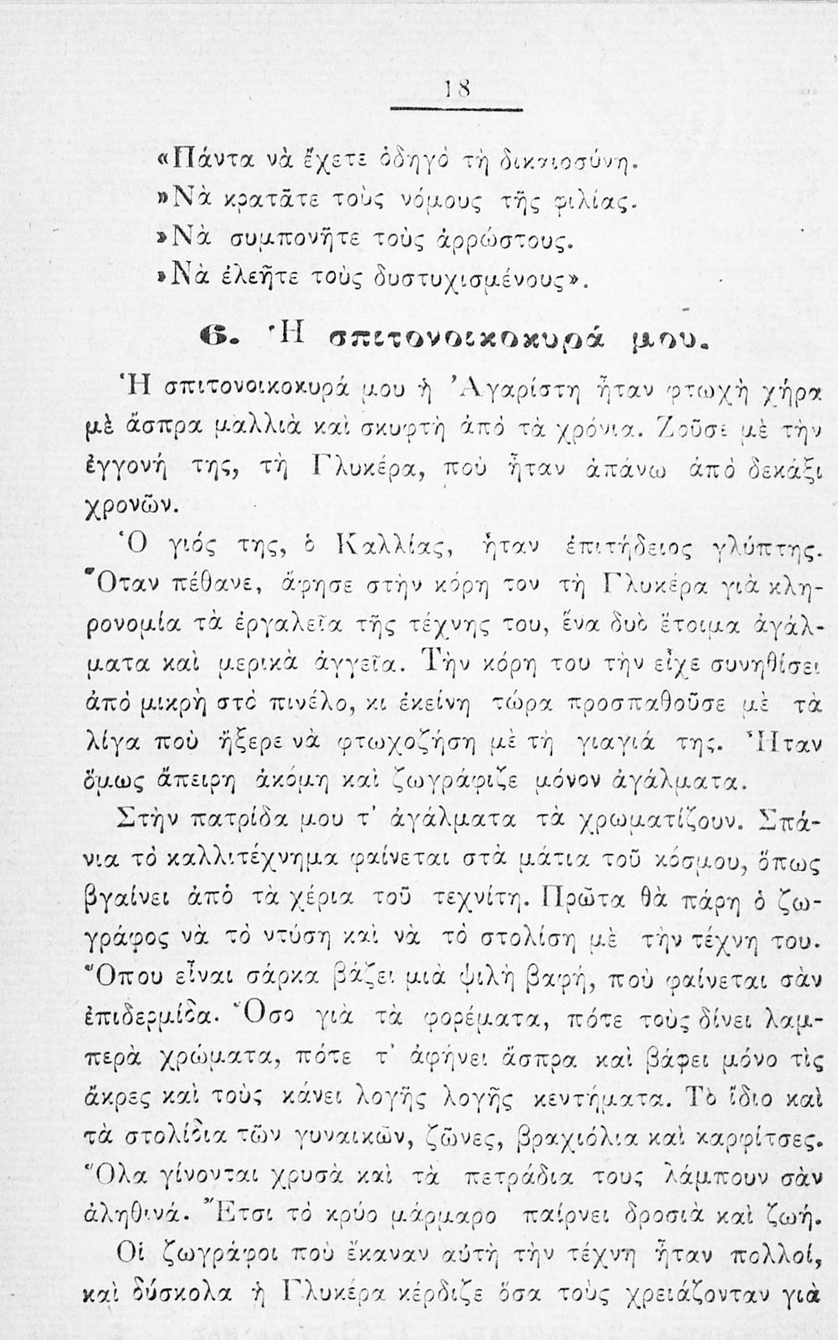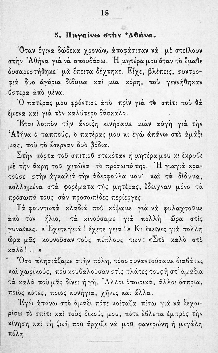Αναγνωστικό Δ΄ Δημοτικού που περιέχει πεζά και ποιήματα με περιεχόμενο διδακτικό και ηθικοπλαστικό εμπνευσμένα από την ελληνική ιστορία και μυθολογία, και την αγροτική και κοινωνική ζωή.