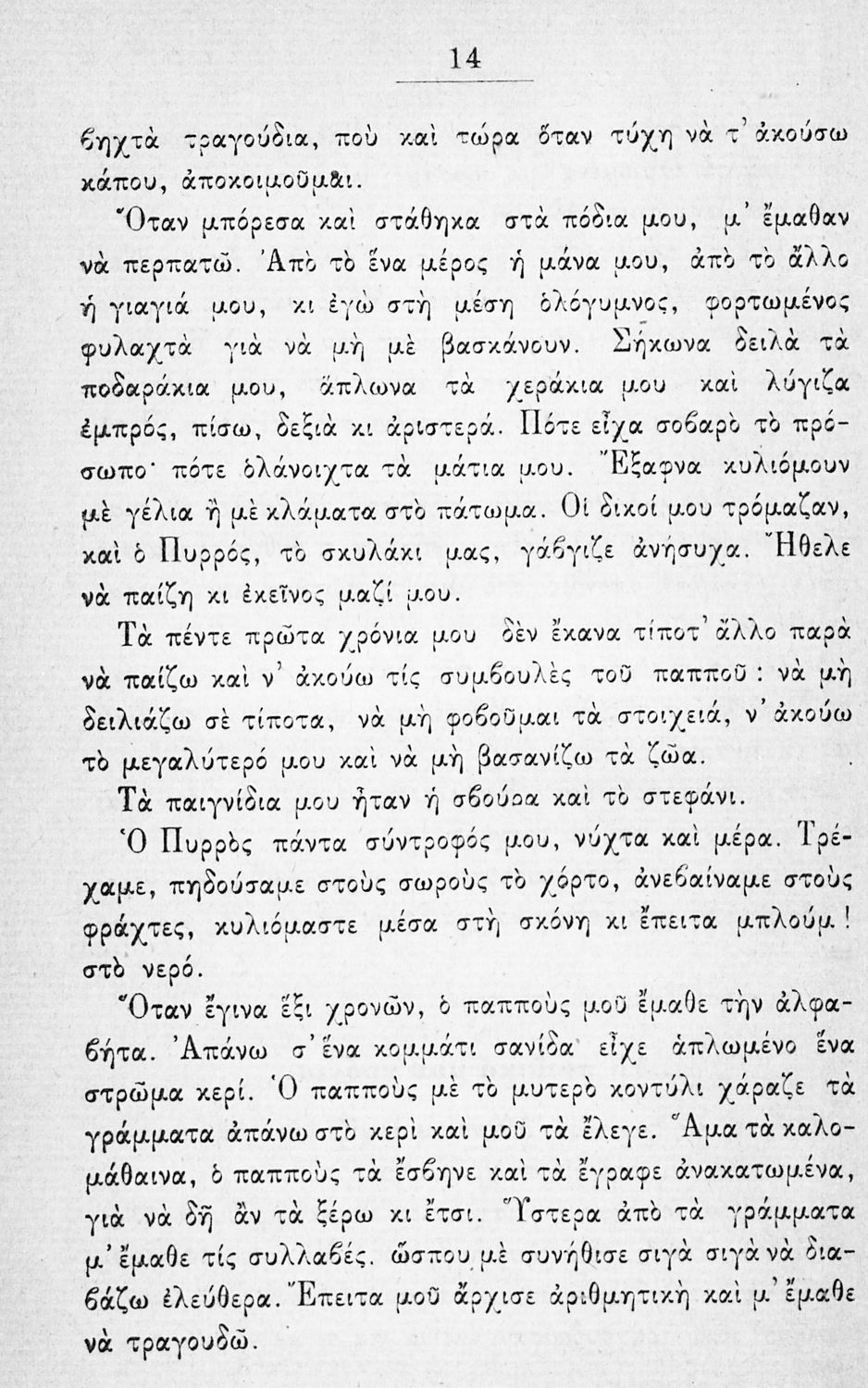 Αναγνωστικό Δ΄ Δημοτικού που περιλαμβάνει ποιήματα και πεζά εμπνευσμένα από την καθημερινότητα της ελληνικής ζωής, τη ζωή στην ύπαιθρο, την εθνική και κοινωνική ζωή, την αρχαία ελληνική ιστορία, και τα ζώα και τα φυτά.