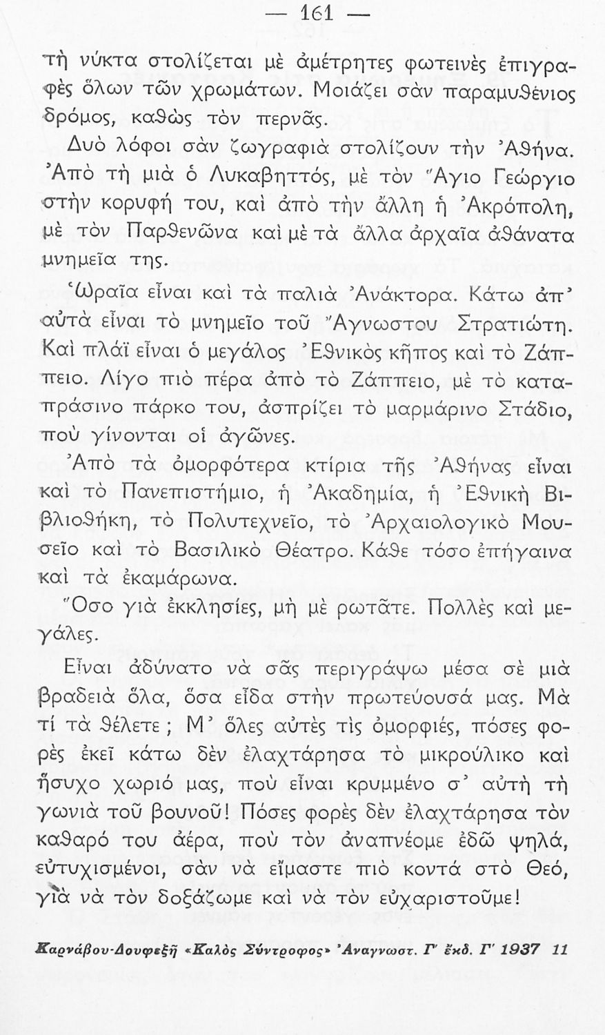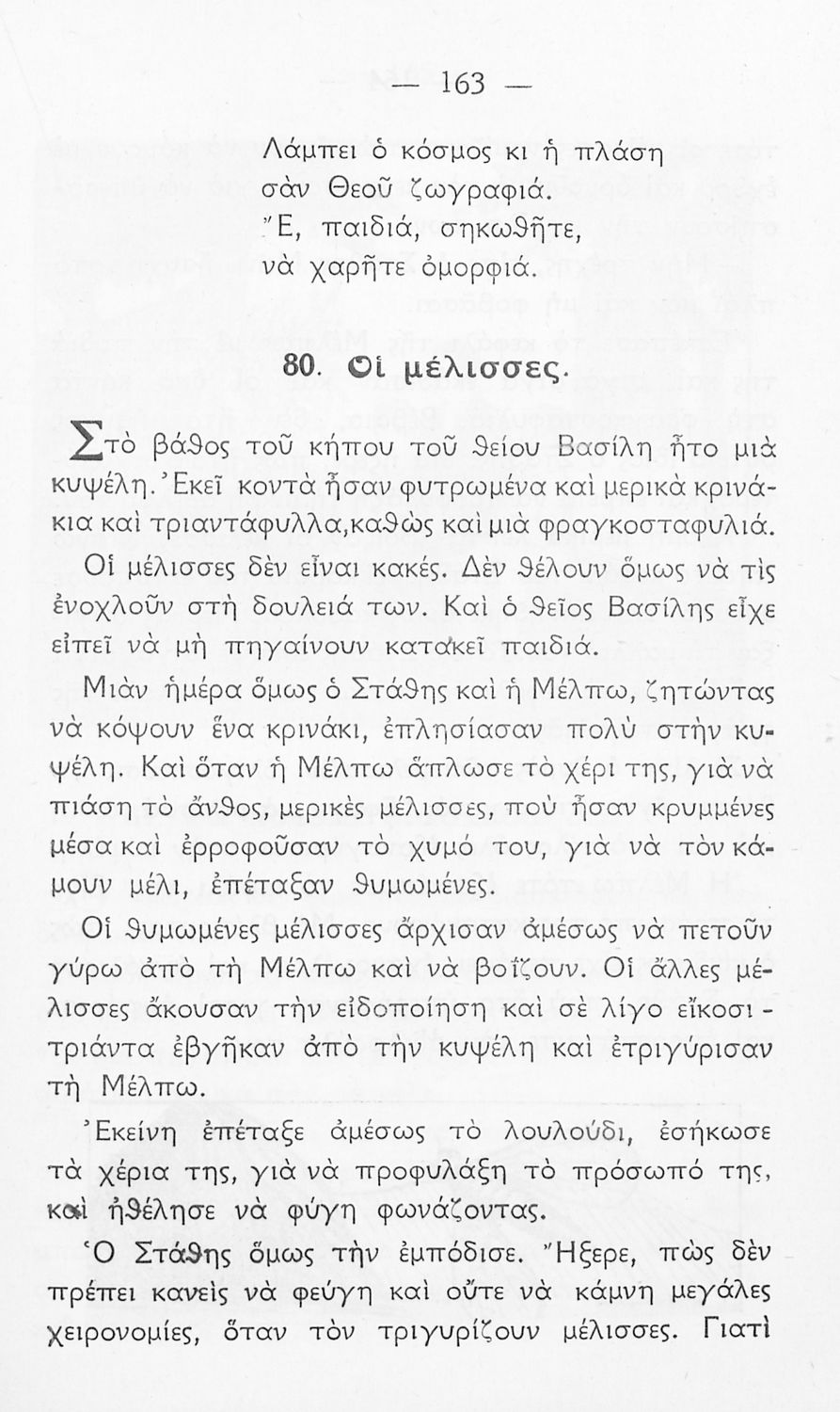 Αναγνωστικό Γ' Δημοτικού που περιέχει πεζά και ποιήματα εμπνευσμένα από τη θρησκευτική, εθνική, κοινωνική και ατομική ζωή, και την ελληνική φύση και ιστορία.