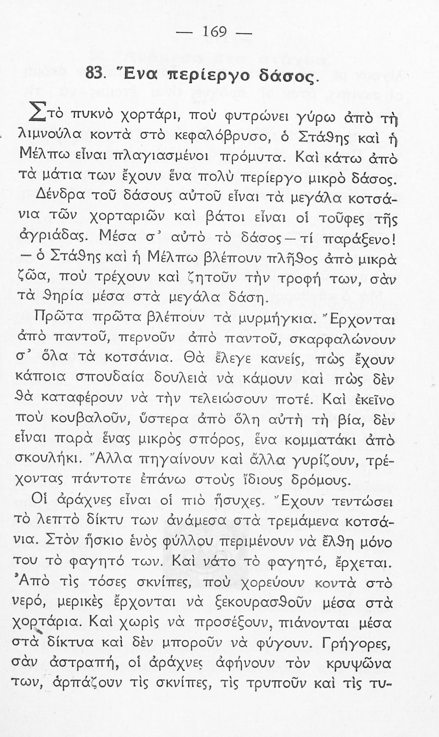 Το εγχειρίδιο ήταν αναγνωστικό για την Γ΄ Δημοτικού. Περιλαμβάνει μια αφηγηματική ιστορία, η οποία εμπεριέχει ηθικά διδάγματα για την ηθικοπλαστική καλλιέργεια των μαθητών. Η γλώσσα είναι δημοτική και το ύφος ...