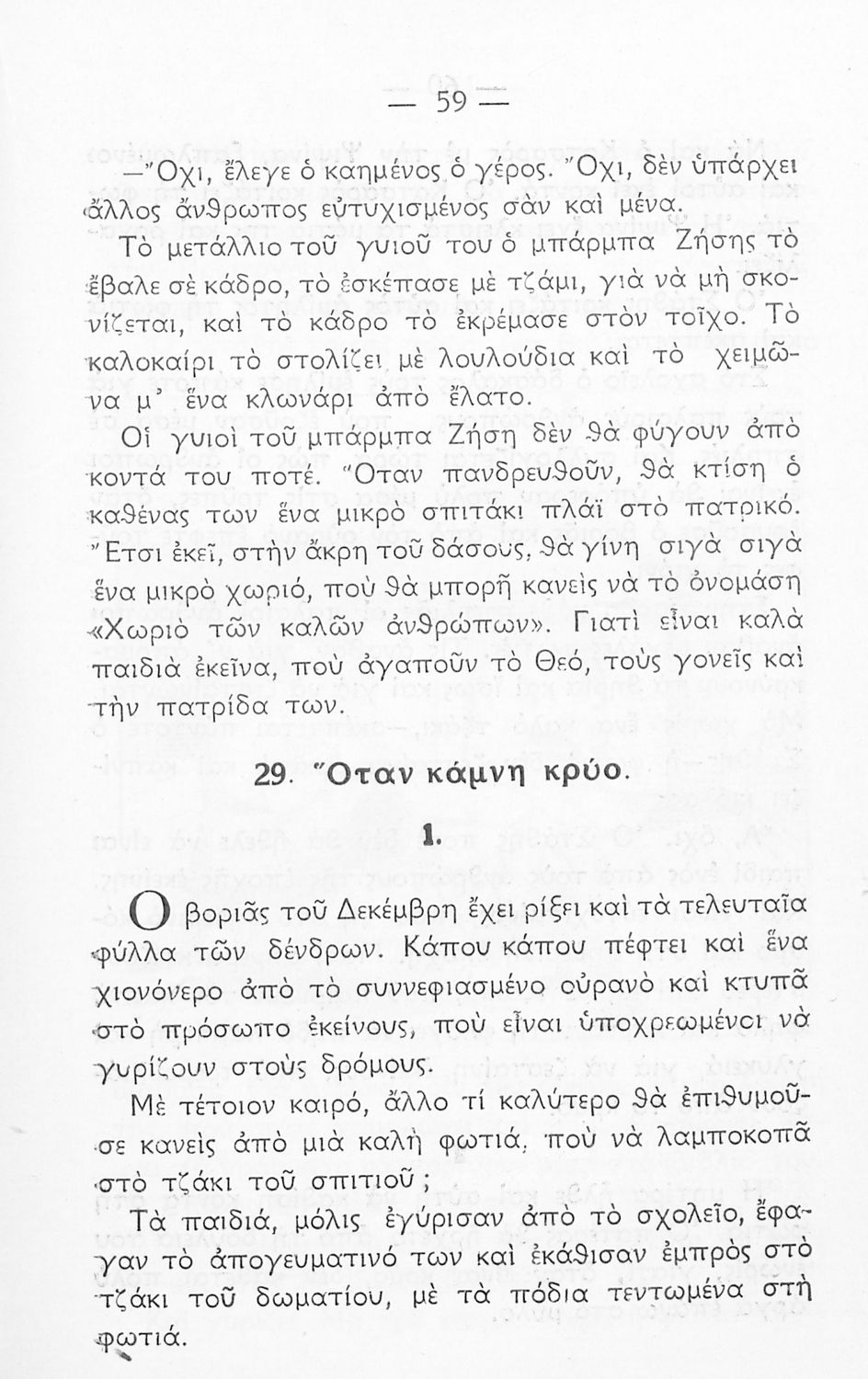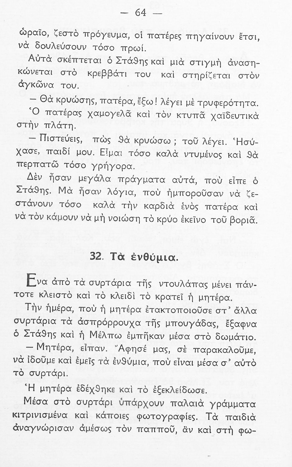 Το εγχειρίδιο ήταν αναγνωστικό για την Γ΄ Δημοτικού. Περιλαμβάνει μια αφηγηματική ιστορία, η οποία εμπεριέχει ηθικά διδάγματα για την ηθικοπλαστική καλλιέργεια των μαθητών. Η γλώσσα είναι δημοτική και το ύφος ...
