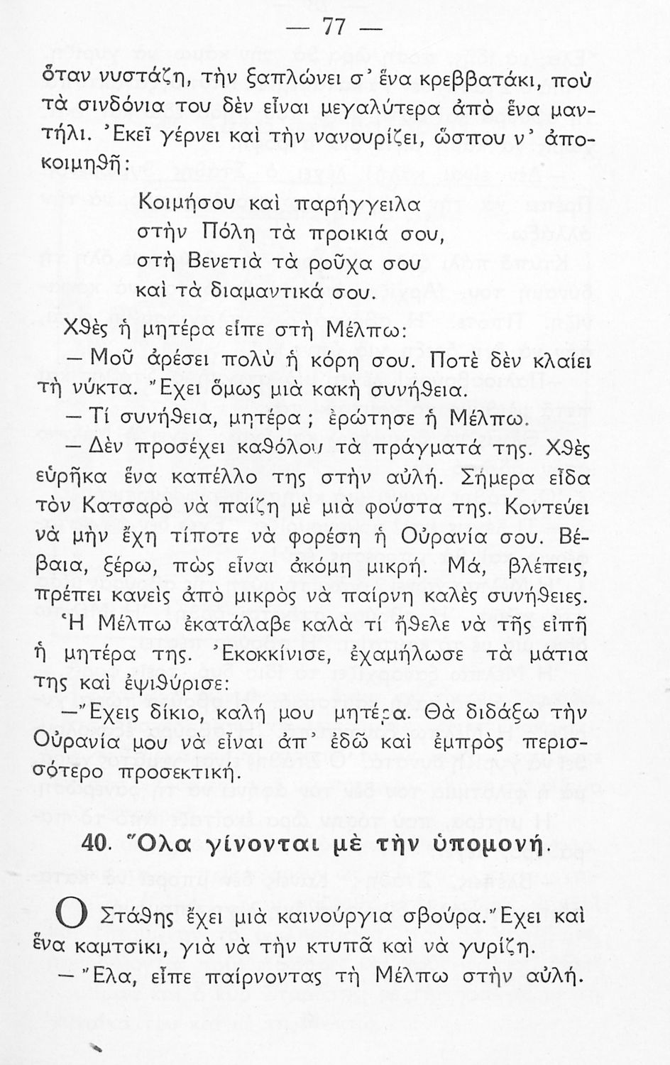 Αναγνωστικό Γ' Δημοτικού που περιέχει πεζά και ποιήματα εμπνευσμένα από τη θρησκευτική, εθνική, κοινωνική και ατομική ζωή, και την ελληνική φύση και ιστορία.