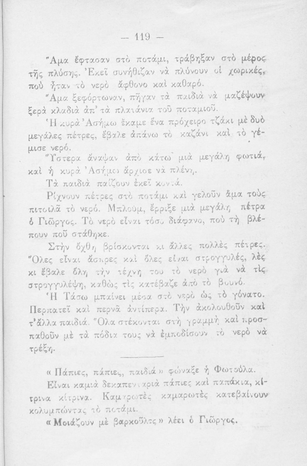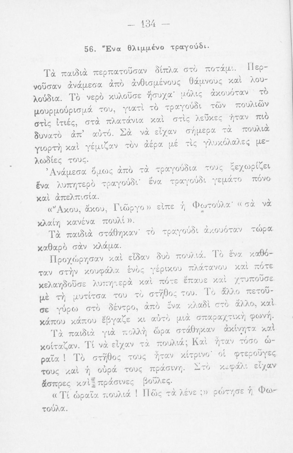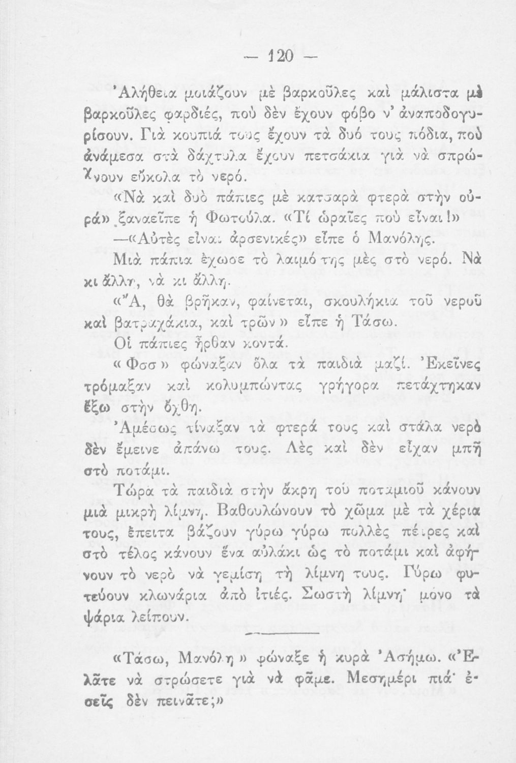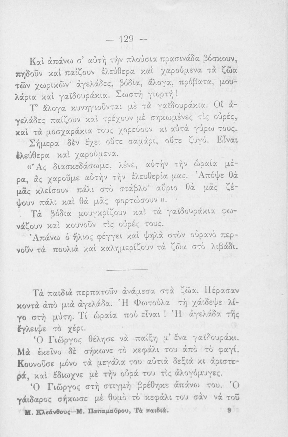 Αναγνωστικό Β΄ Δημοτικού που αποτελείται από πεζά γραμμένα σε καθαρεύουσα και ποιήματα σε δημοτική εμπνευσμένα από την οικογένεια, τη θρησκεία, την πατρίδα, την ελληνική φύση και ύπαιθρο, την αγάπη για τα ζώα,