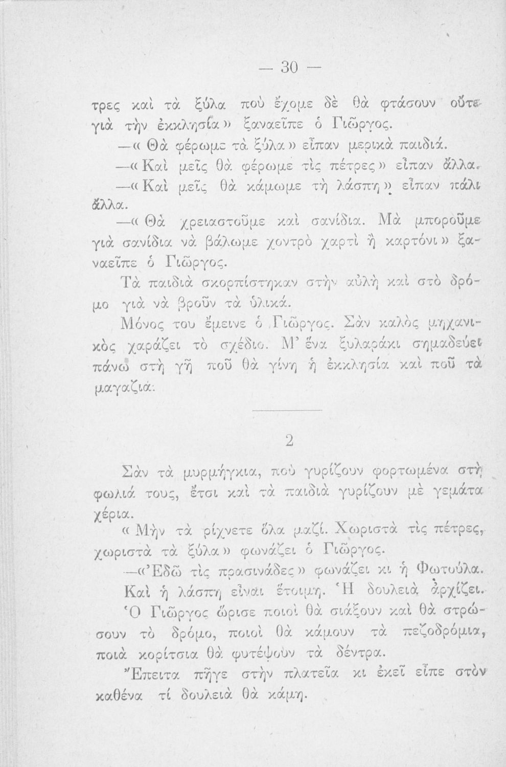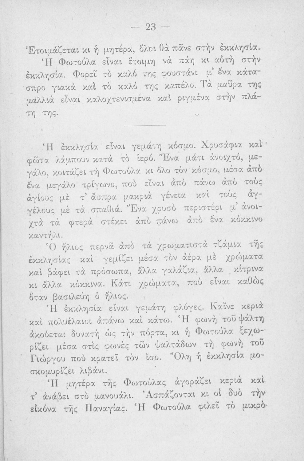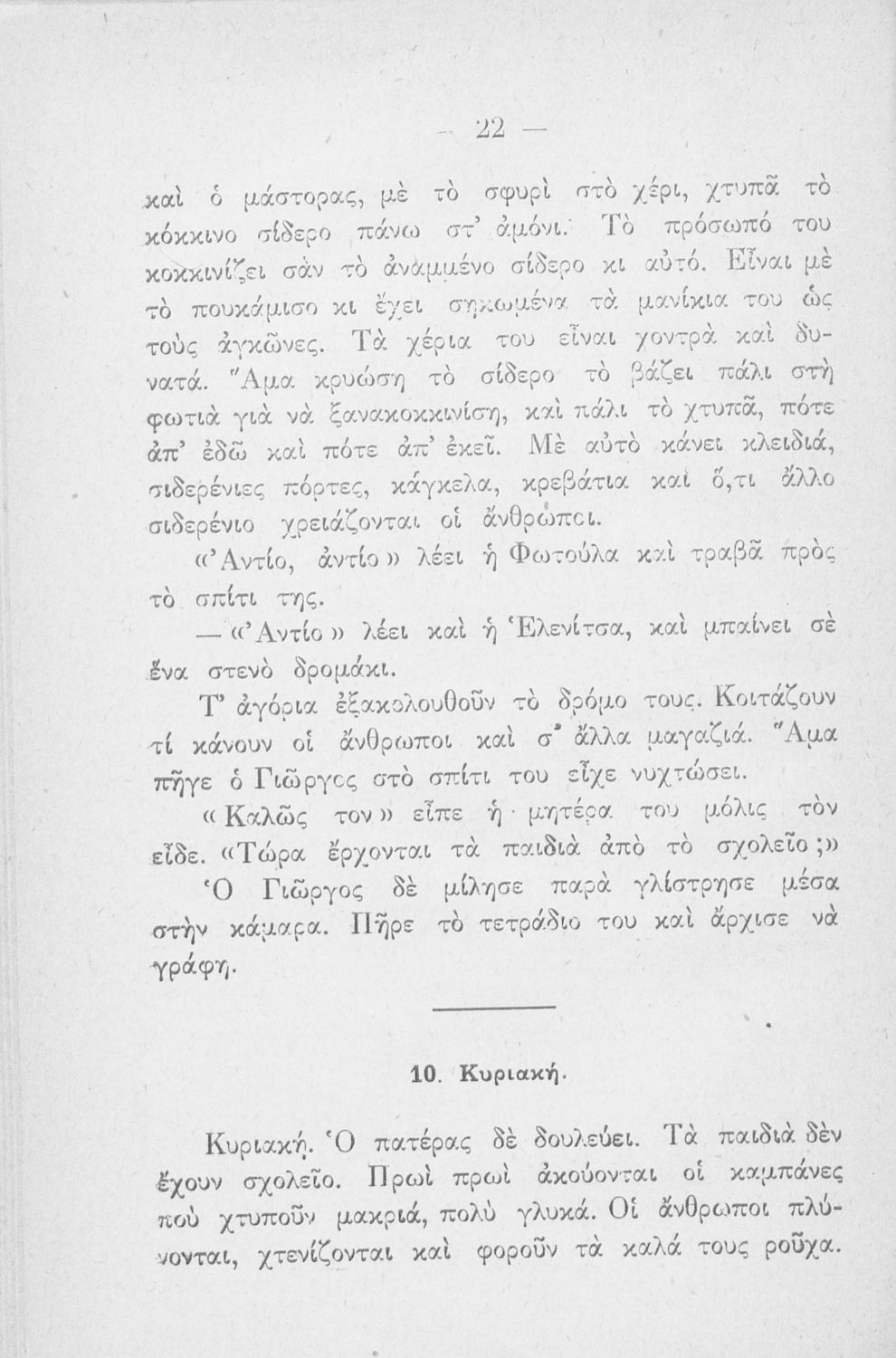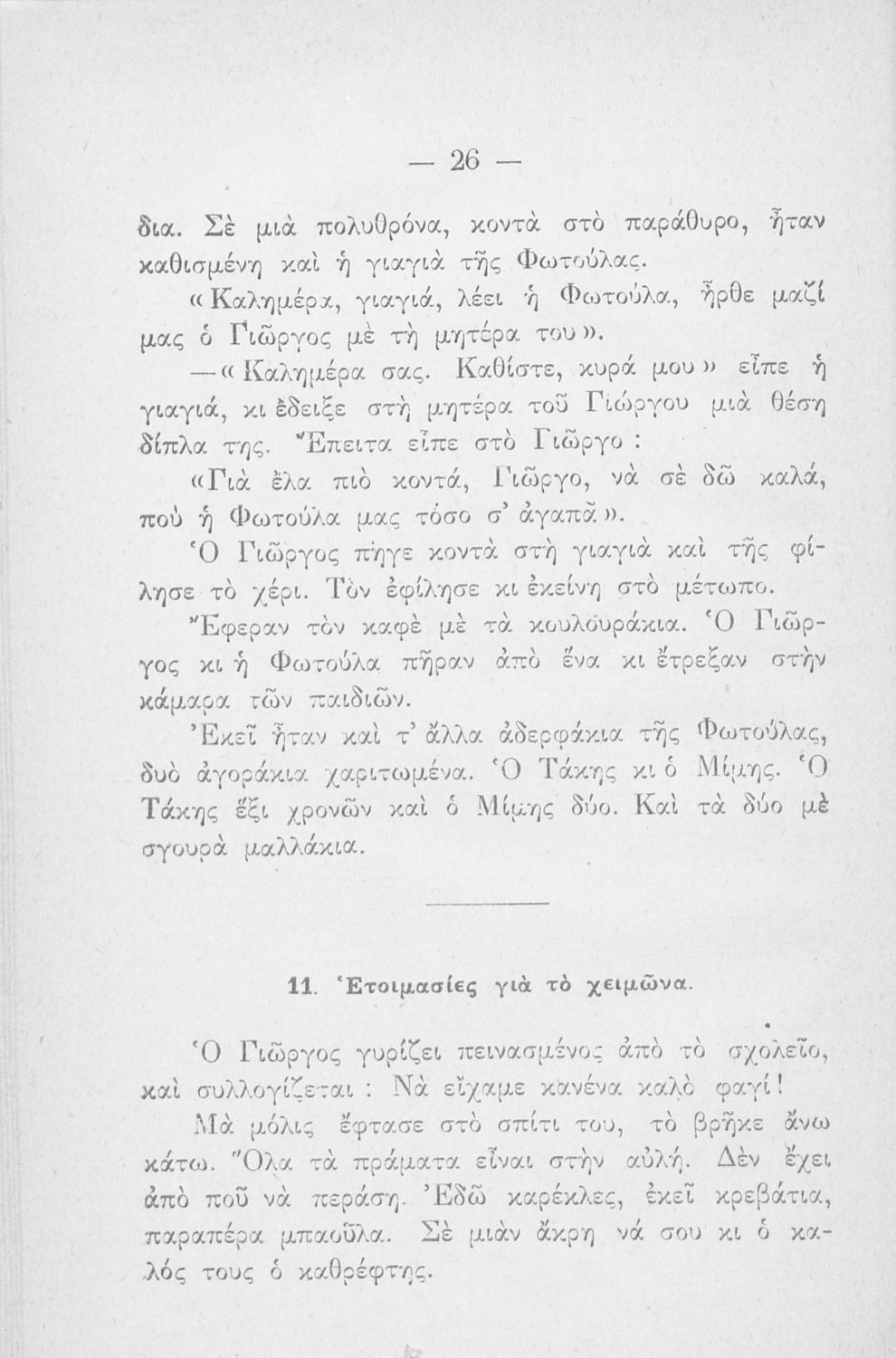Αναγνωστικό Β΄ Δημοτικού που αποτελείται από πεζά γραμμένα σε καθαρεύουσα και ποιήματα σε δημοτική εμπνευσμένα από την οικογένεια, τη θρησκεία, την πατρίδα, την ελληνική φύση και ύπαιθρο, την αγάπη για τα ζώα,