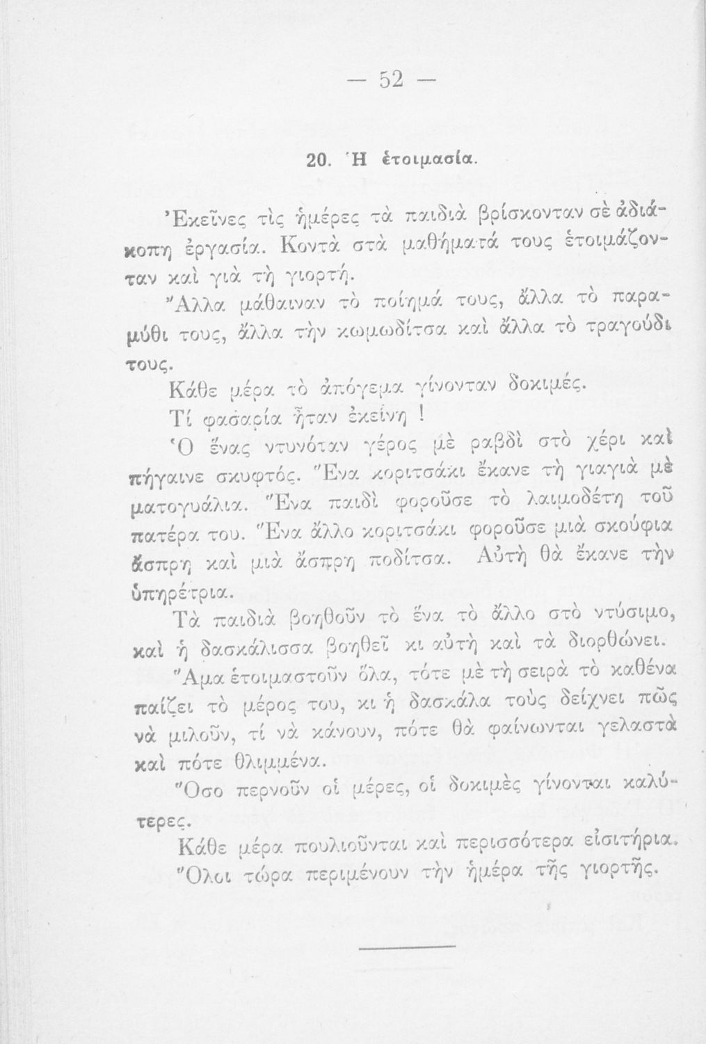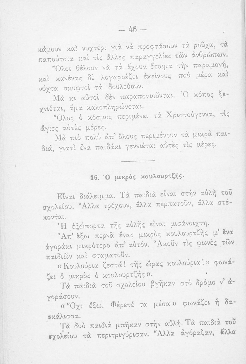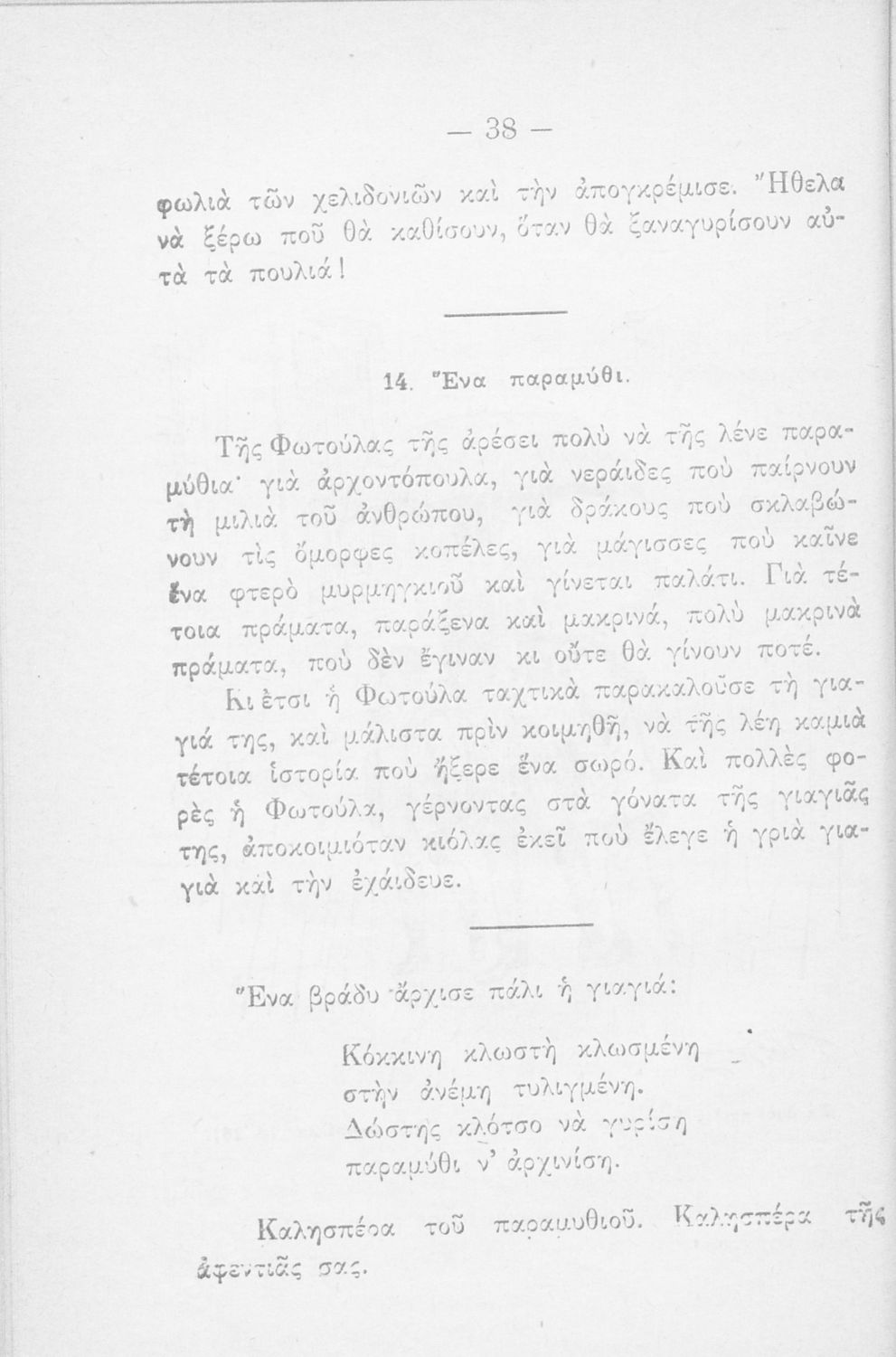 Αναγνωστικό Β΄ Δημοτικού που αποτελείται από πεζά γραμμένα σε καθαρεύουσα και ποιήματα σε δημοτική εμπνευσμένα από την οικογένεια, τη θρησκεία, την πατρίδα, την ελληνική φύση και ύπαιθρο, την αγάπη για τα ζώα,
