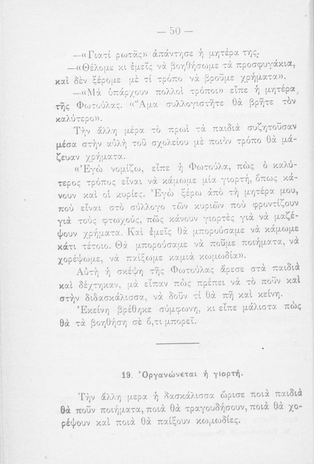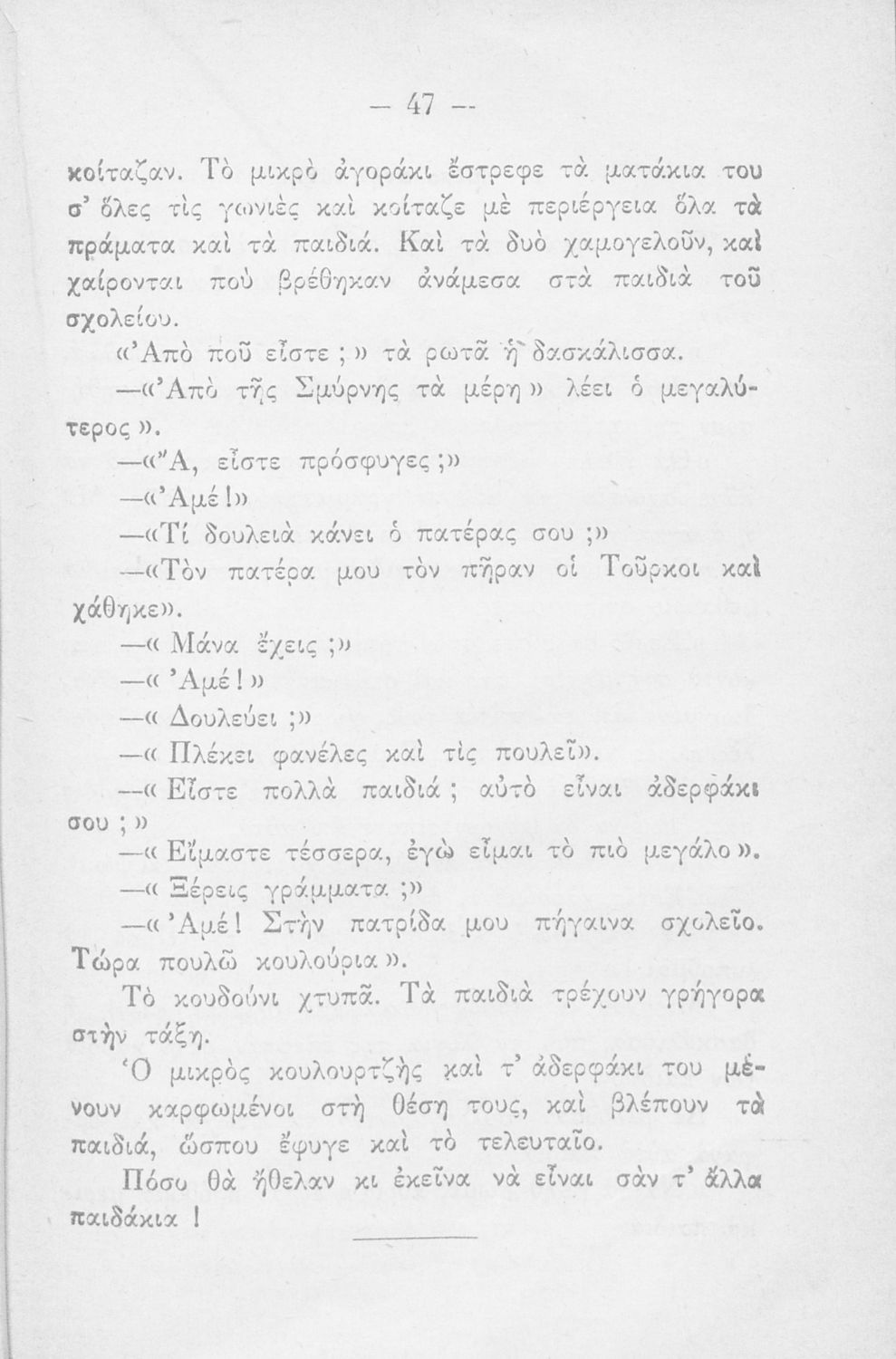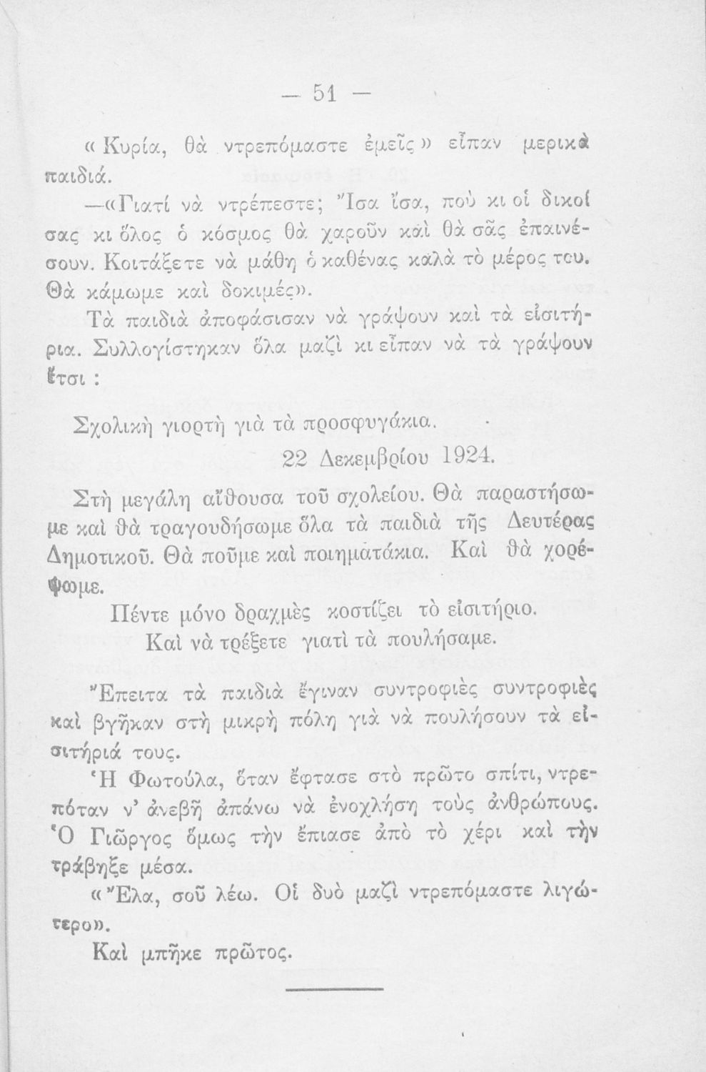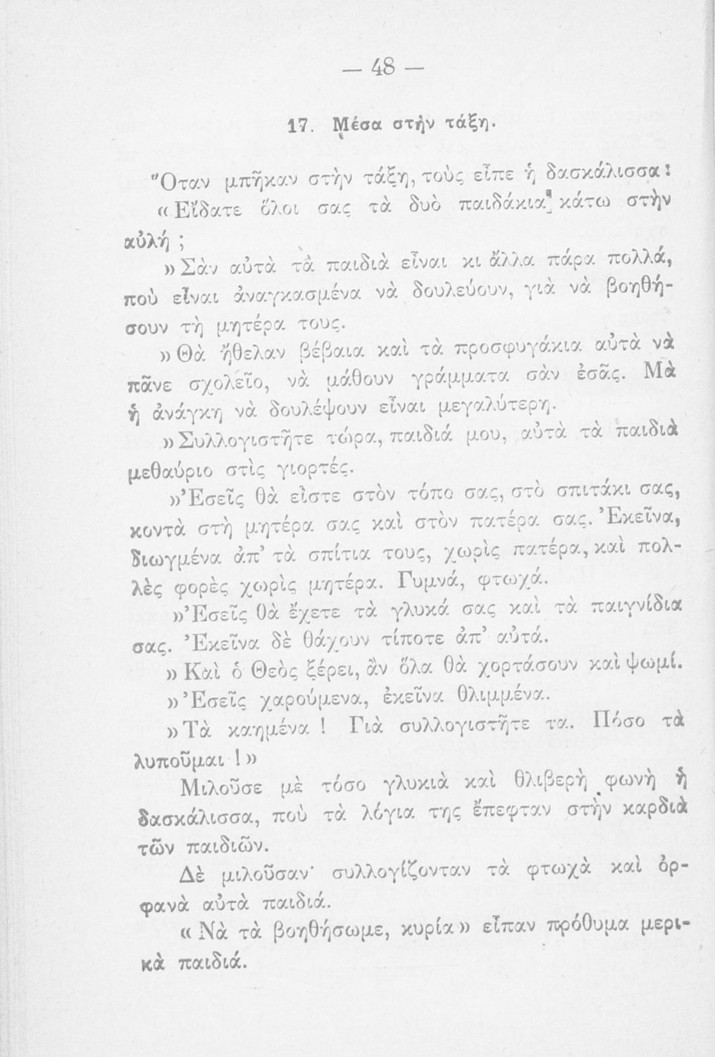 Αναγνωστικό Β΄ Δημοτικού που αποτελείται από πεζά γραμμένα σε καθαρεύουσα και ποιήματα σε δημοτική εμπνευσμένα από την οικογένεια, τη θρησκεία, την πατρίδα, την ελληνική φύση και ύπαιθρο, την αγάπη για τα ζώα,